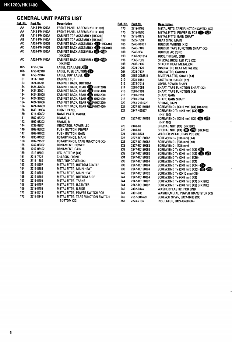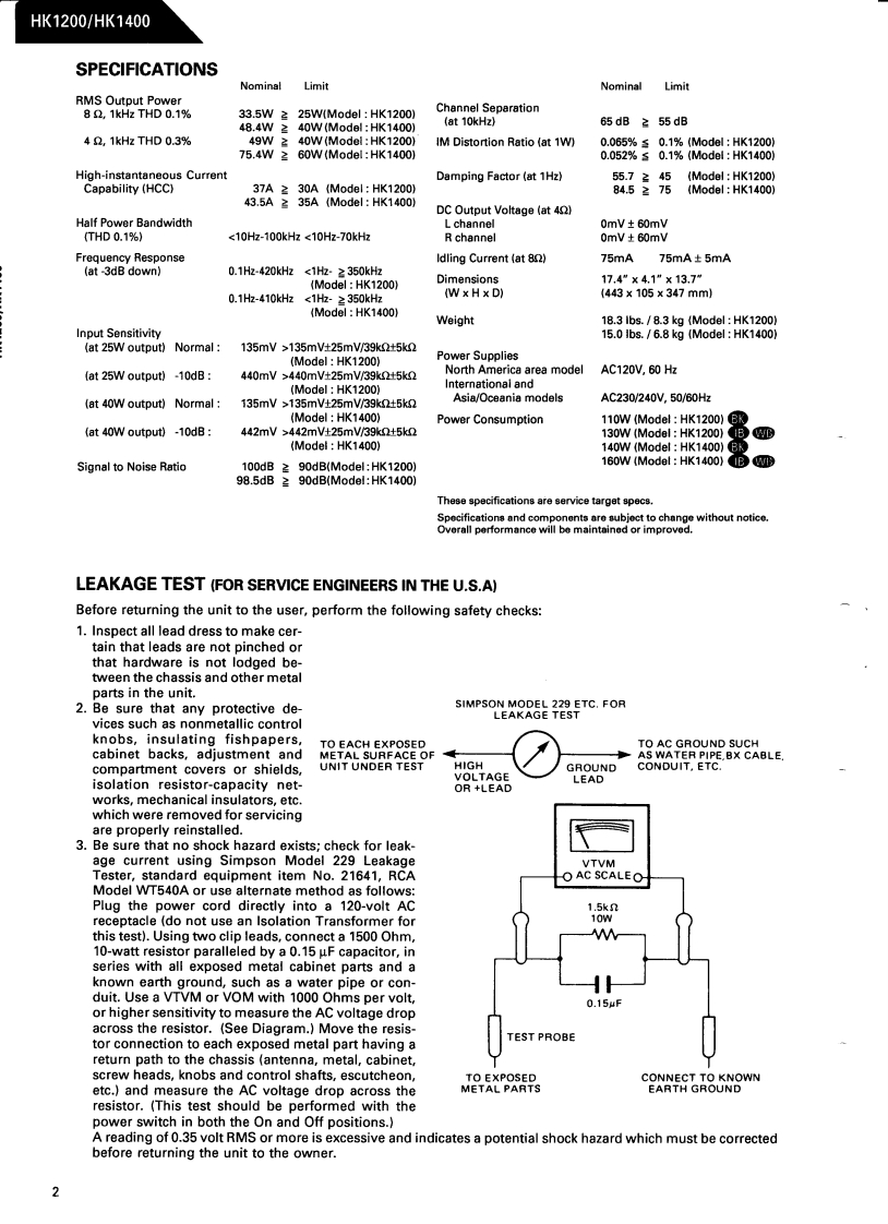The Harman KardonModel HK1200/HK1400Manual 190ASTEREO LINE AMPLIFIERTechnical Manualharman/kardon 400The following marks found in the parts list of this manualidentify the models as follows.North America area model Black versionInternational model Black versionWB Asia/Oceania model Black versionCONTENTSSPECIFICATIONS.GENERAL UNIT PARTS LIST .......6LEAKAGE TEST..2GENERAL UNIT........7DISASSEMBLY PROCEDURES3P.C.BOARDS.8,15,16POWER CORD REPLACEMENT ......3ELECTRICAL PARTS LIST ................9,.11,17CONTROLS AND FUNCTIONS.............SCHEMATIC DIAGRAMS ...........10,13,19ALIGNMENTPROCEDURES..........5WIRING DIAGRAM..............14,20BLOCK DIAGRAM....5harman/kardonParts and Service Office240 Crossways Park West,Woodbury.N.Y.117971112-0530A152 G9310 1500 Printed in Japan