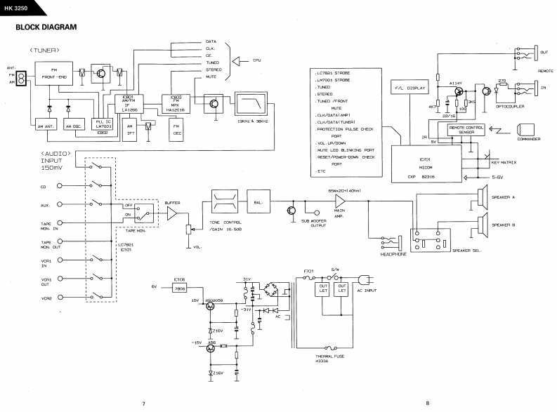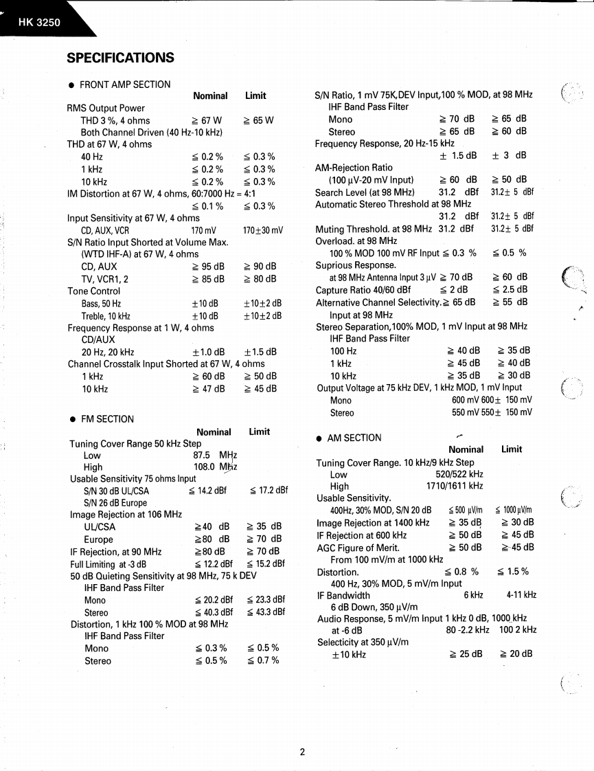 兰The Harman KardonModel HK3250Manual AAUDIO AND VIDEO RECEIVERTechnical Manualharman/kardon3250888a:OCONTENTSSPECIFICATIONS…2GENERAL UNIT…25LEAKAGE TESTPRINTED CIRCUIT BOARDS…27CONTROLS AND FUNCTIONS…5ELECTRICAL PARTS LIST..............31BLOCK DIAGRAM................…7SEMICONDUCTOR LEAD IDENTIFICATIONDISASSEMBLY PROCEDURES .......................9INTERNAL DIAGRAM......................35CIRCUIT DESCRIPTION..............................11TRANSISTORS LEAD IDENTIFICATION…38ALIGNMENT PROCEDURES0,18PACKAGE...........39TROUBLESHOC0TNG…21WIRING DIAGRAM...1GENERAL UNIT PARTS LIST..................24SCHEMATIC DIAGRAMS (I,II,III)…42harman/kardonParts and Service Office80 Crossways Park West,Woodbury,N.Y.117971112-HK3250A G9603 1200 Printed in Korea
