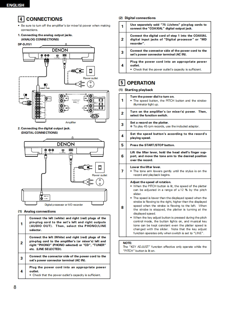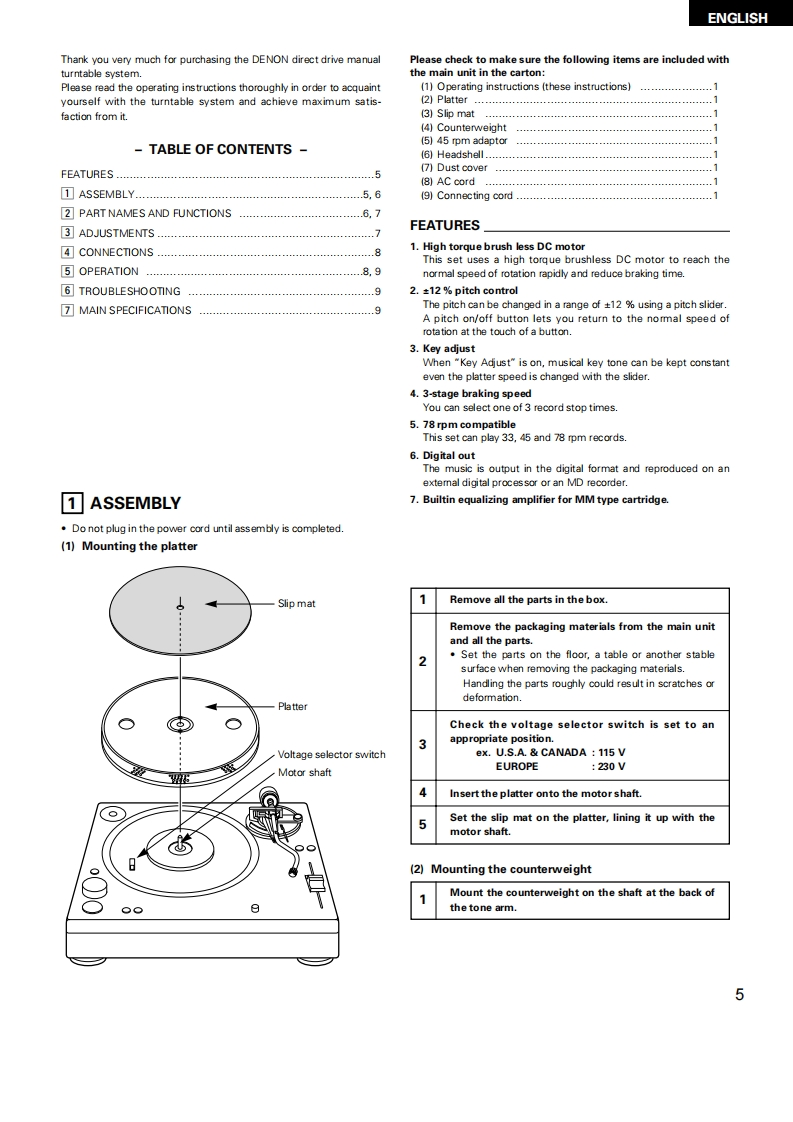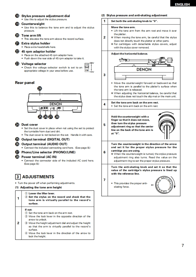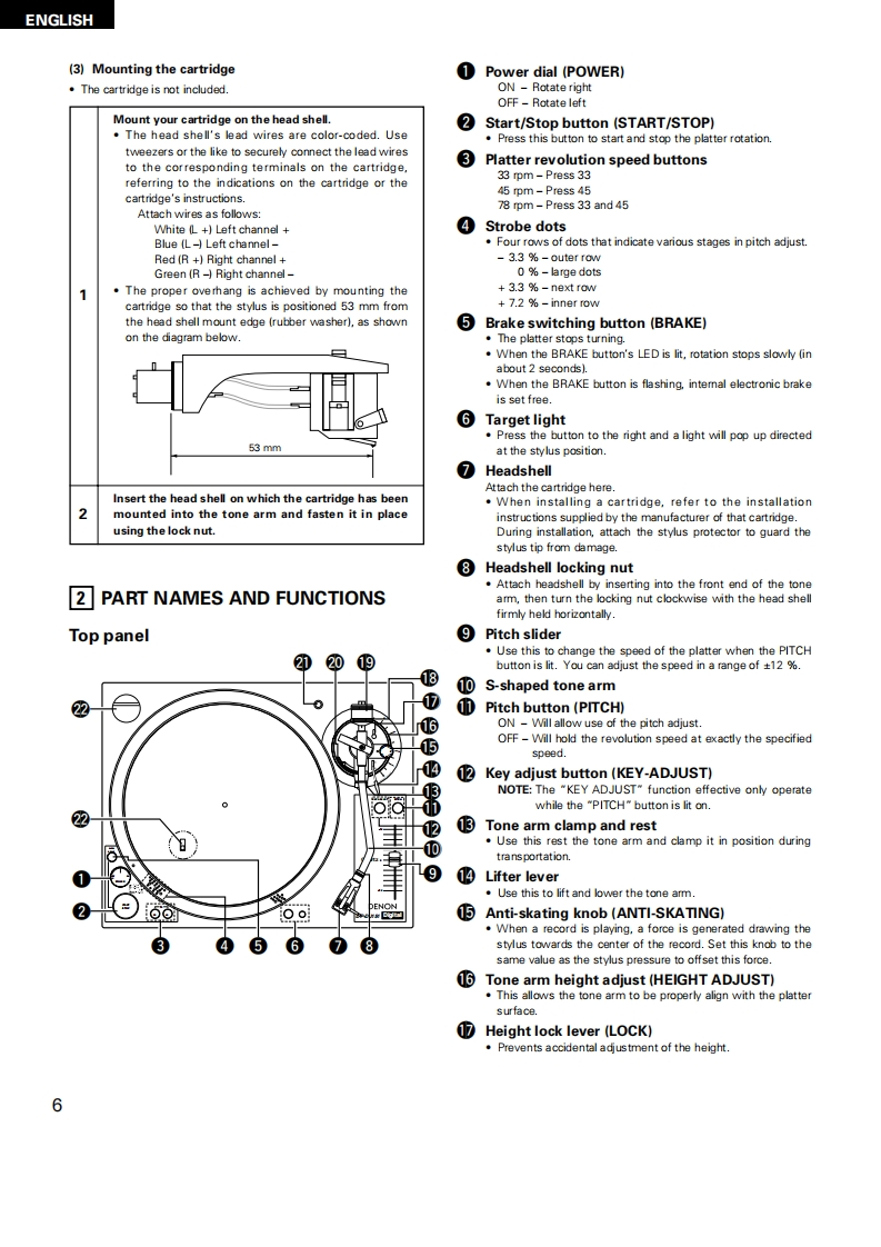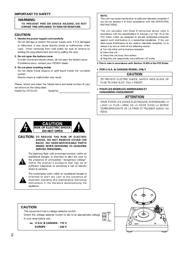 DENONDIRECT DRIVE MANUAL TURNTABLE SYSTEMDP-DJ151OPERATING INSTRUCTIONSBEDIENUNGSANLEITUNGMODE D'EMPLOIINSTRUCCIONES DE OPERACIONFOR EUROPEAN MODELS ONLYDECLARATION OF CONFORMITYWe declare under our sole responsibility that this product,to whichthis declaration rellates,is in conformity with the following standards:ENe0065,EN55013,EN55020,EN61000-3-2 and EN61000-3-3.Following the provisions of 73/23/EEC,89/336/EEC and 93/68/EECDirective.UBEREINSTIMMUNGSERKLARUNGWir erklaren unter unserer Verantwortung,daB dieses Produkt,aufdas sich diese Erklarung bezieht,den folgenden Standards entspricht:ENe0065,EN55013,EN55020.EN61000-3-2 und EN61000-3-3.Entspricht den Verordnungen der Direktive 73/23/EEC.89/336/EECund 93/68/EEC.DECLARATION DE CONFORMITENous declarons sous notre seule responsabilite que I'appareil,auquelse refere cette declaration,est conforme aux standards suivants:EN80065,EN55013EN55020,EN61000-3-2etEN61000-3-3.D'apres les dispositions de la Directive 73/23/EEC.89/336/EEC et93/68EEC.DECLARACION DE CONFORMIDADDedaramos bajo nuestra exclusiva responsabilidad que este productoal que hace referencia esta declaracion,esta conforme con lossiguientes estandares:ENe0065,EN55013,EN55020,EN6100-3-2yEN61000-33.Siguiendo las provisiones de las Directivas 73/23/EEC,89/336/EEC y93/68/EEC.FOR ENGLISH READERSPAGE5-PAGEFUR DEUTSCHE LESERSEITE10-S日TE14POUR LES LECTEURS FRANCAISPAGE15-PAGEPARA LECTORES DE ESPANOLPAGINA 20-PAGINA24"SERIAL NOPLEASE RECORD UNIT SERIAL NUMBER ATTACHED TO THE REAR OF THECABINET FOR FUTURE REFERENCE"