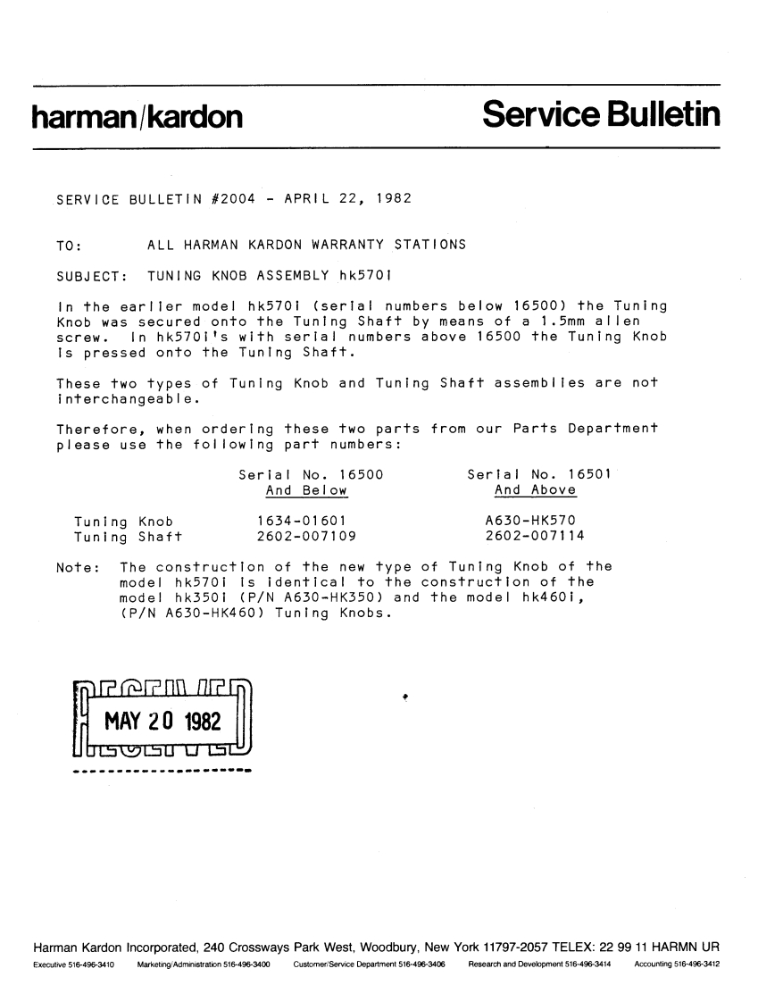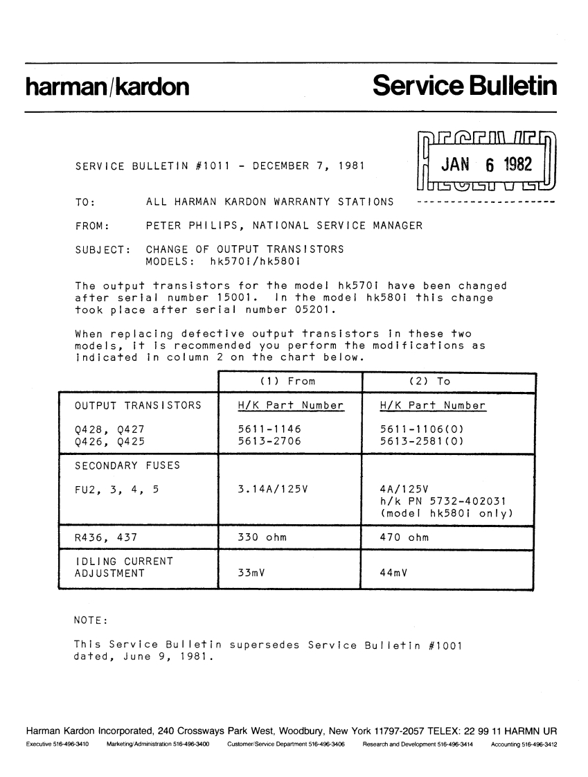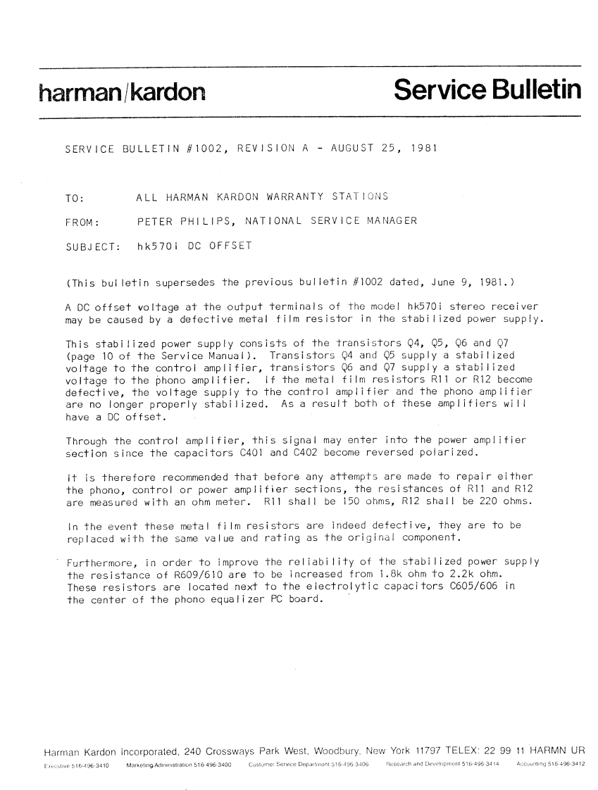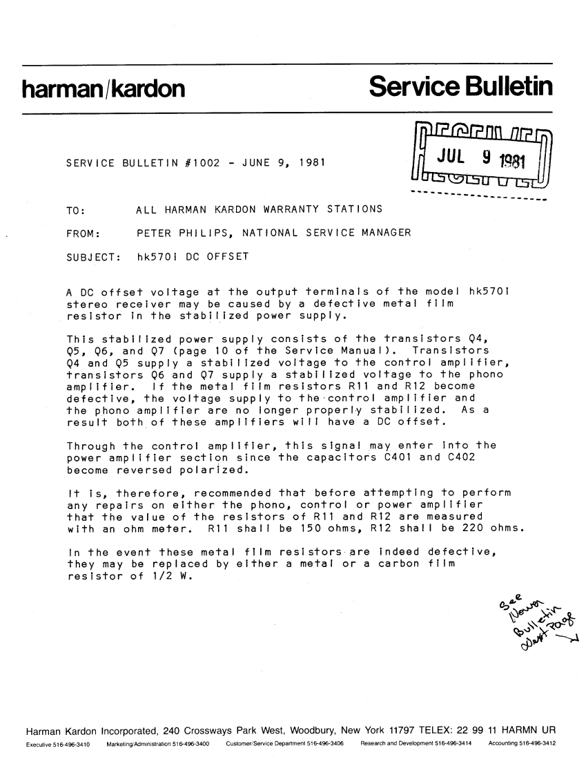 The Harman KardonModel hk570iAM/FM/Stereo FMSolid State Receiver2e平ego5双VCBol&tOR becomsa stafistie /Technical ManualSupplementary ManualThis manual is to be applied to the regular voltage units with serial number 02501 and above,and multivoltage units.For all other parts and service information except them in this manual,please refer tothe original manual.nF个7m?nAUG191981JUsSUC丁SYharman/kardon