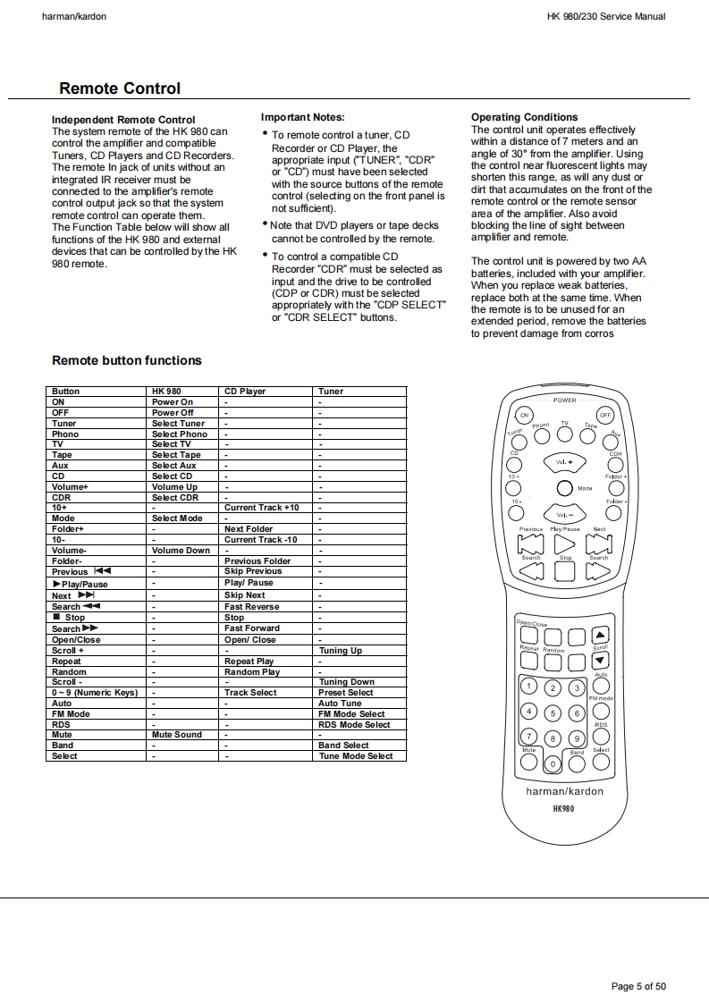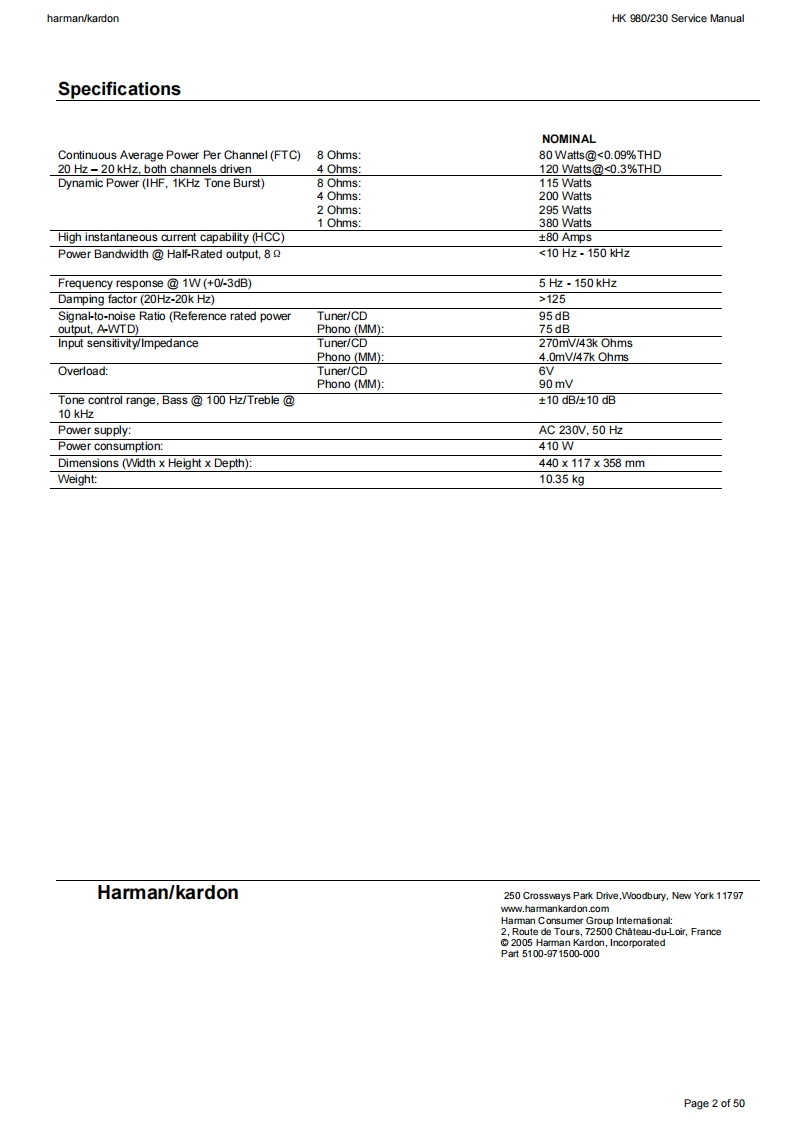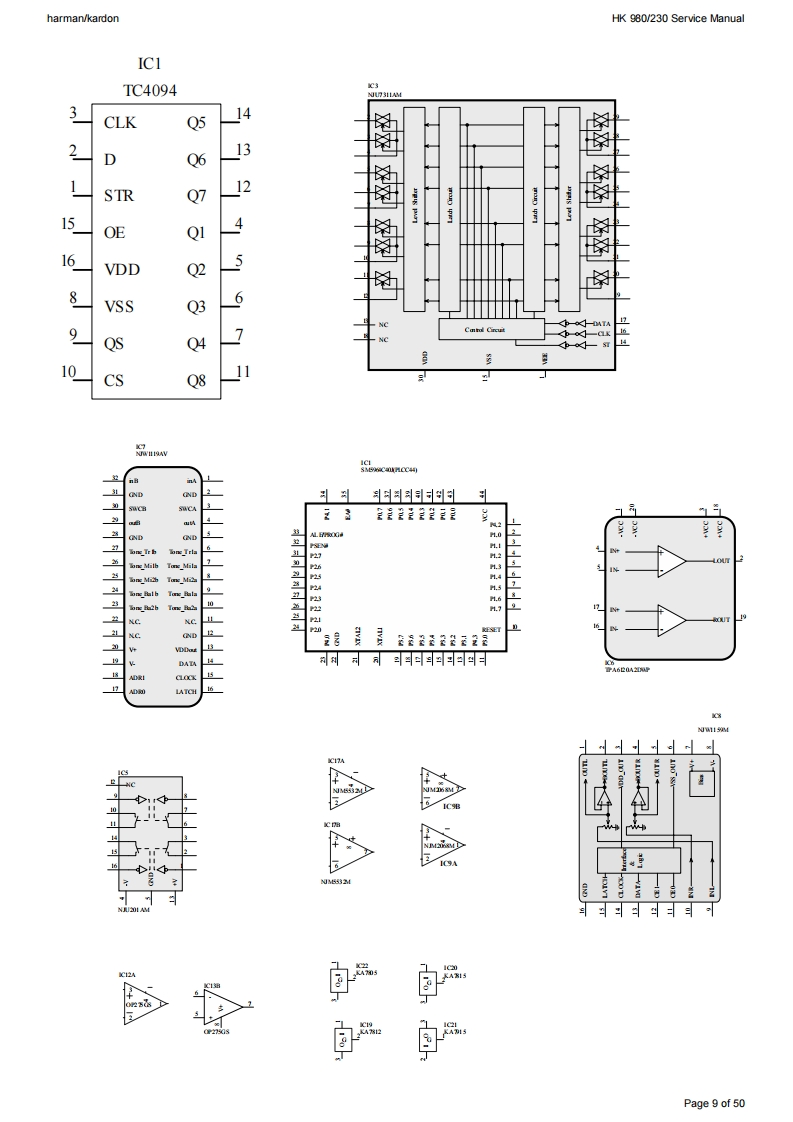 harman/kardonHK 980/230 Service Manualharman/kardonService ManualHK980/2302 x 80W STEREO AMPLIFIERK型TV-24dBharman/kardonCONTENTSTECHNICAL SPECIFICATIONSBLOCK DIAGRAM8REAR PANEL CONNECTIONS3SEMICONDUCTOR PINOUTSFRONT PANEL CONTROLS4PCB DRAWINGSREMOTE CONTROL INFORMATION5SCHEMATIC DIAGRAMS9242AMP BIAS ADJUSTMENT6EXPLODED VIEW AND PARTSWIRING DIAGRAM7ELECTRICAL PARTS LIST40Released EU2008harman/kardon,Inc.Rev0,11/2008250 Crossways Park Dr.Woodbury,New York,11797Page 1 of 50