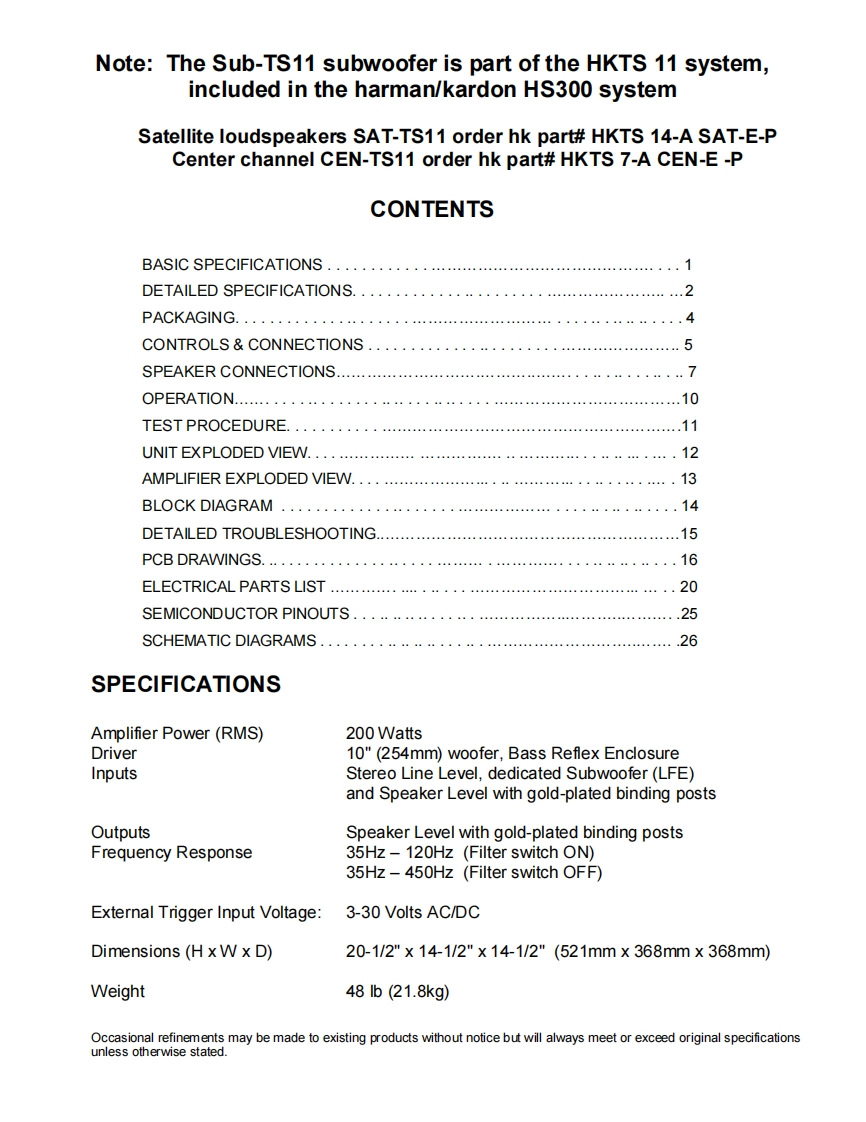 HarmanKardon-SUBTS11-pwr-维修说明书手册含电器原理图找手册网29天前发布关注私信1.64MB29页046HarmanKardon-SUBTS11-pwr-维修说明书手册含电器原理图此内容为付费资源,请付费后查看¥19¥21黄金会员免费钻石会员免费登录购买付费资源 第1页 / 共29页 第2页 / 共29页 第3页 / 共29页 第4页 / 共29页 第5页 / 共29页 第6页 / 共29页 第7页 / 共29页 第8页 / 共29页 第9页 / 共29页 第10页 / 共29页 试读已结束,还剩19页,您可下载完整版后进行离线阅读 THE END哈曼卡顿/飞利浦 文本预览 harman/kardonSUB-TS11(HKTS 11 SUBWOOFERincluded in the HS300 system)SERVICE MANUALnarman/kardonharman/kardon,Inc.250 Crossways Park Dr.Woodbury,New York 11797Rev13/2008 查看更多 收起部分 喜欢就支持一下吧收藏