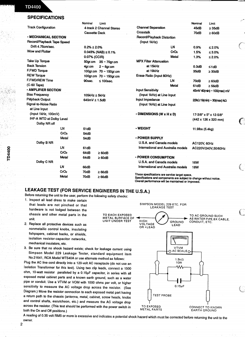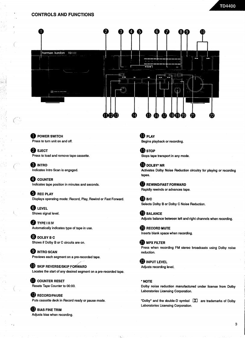 The Harman KardonModel TD4400Manual 162ACD TRANSCRIPTION QUALITY CASSETTE DECKTechnical Manualharman/kardon TDtTD44.0The following marks found in the parts list of this manualIdentify the models as follows.a:North America area model Black verslonInternational modelInternational model Black versionAustralla model Black versionharman/kardon240 Crossways Park West,Woodbury.N.Y.117971112-3152162A5P.1190102000 Printed in Japan