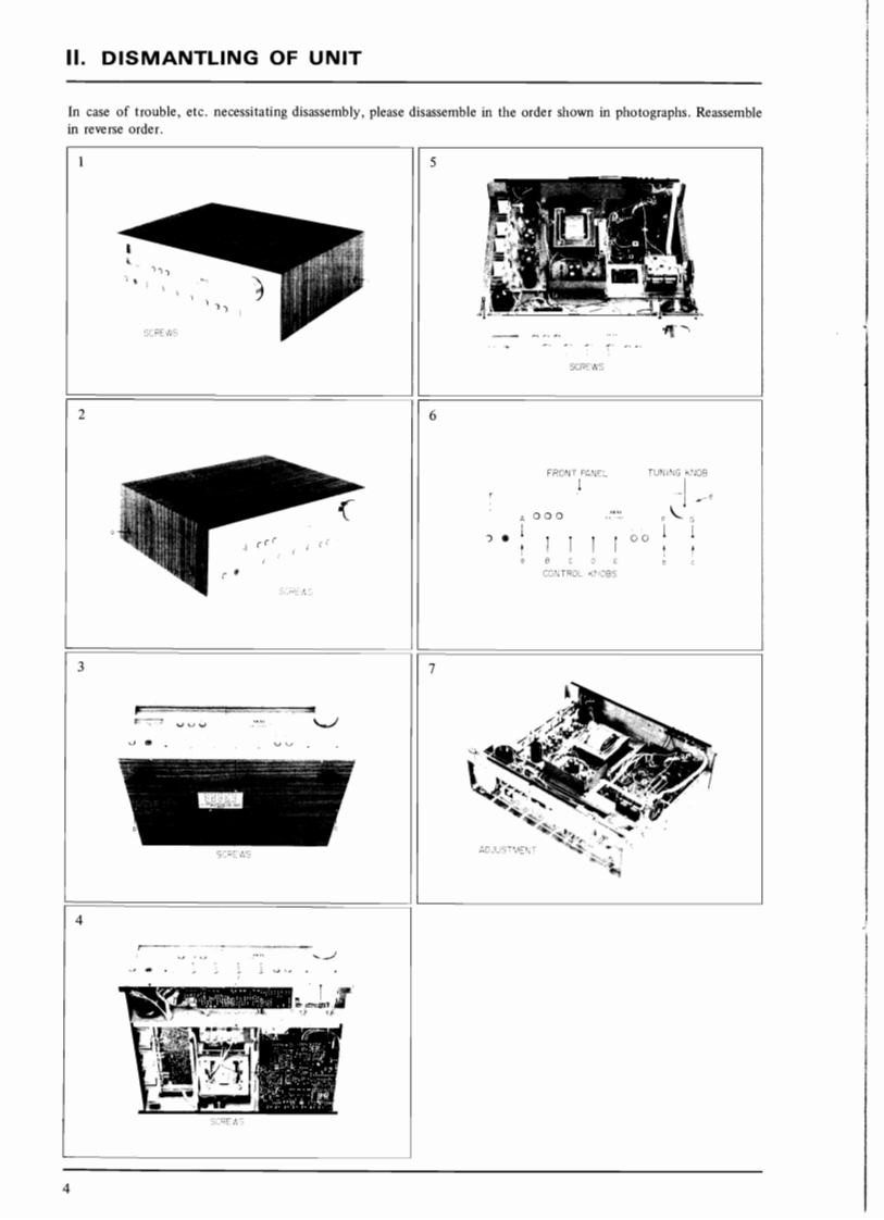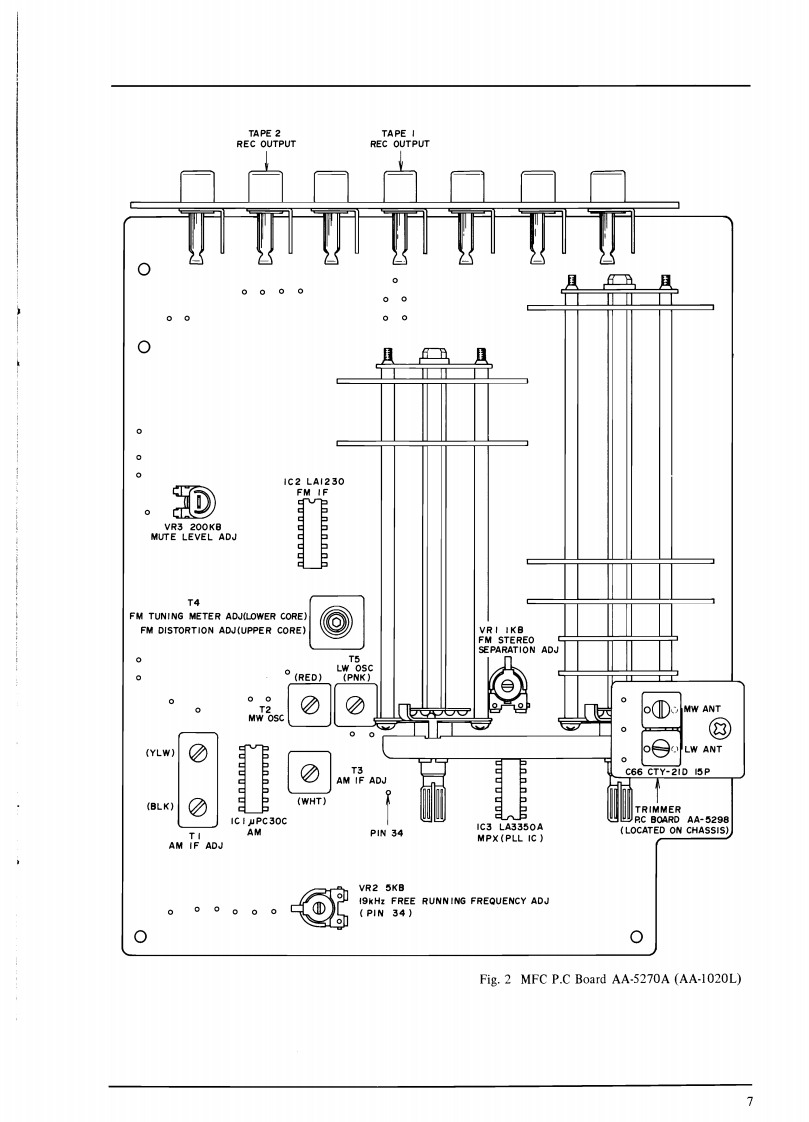SECTION 1SERVICE MANUALTABLE OF CONTENTSI.SPECIFICATIONS .................................................................2IL.DISMANTLING0 F UNIT4.ARRANGEMENT OF PRINCIPAL PARTS...............................................IV.FM TUNER SECTION ADJUSTMENTS................................................6V.AM TUNER SECTION ADJUSTMENT (Model AA-1020)...................................10VI.AM (LW AND MW)TUNER SECTION ADJUSTMENT (Model AA-1020L).....................11I.LW SECTION ADJUSTMENT.......................................................112.MW SECTION ADJUSTMENT.......................................................11VII.MAIN AMPLIFIER ADJUSTMENT.....................................................12VII.TUNINGCORD THREADING.........................................................13X.CLASSIFICATION OF VARIOUS P.C BOARDS..........................................141.P.C BOARD INTERCHANGEABILITY CHART.........................................142.COMPOSITION OF VARIOUS P.C BOARDS..................................15For basic adjustments,measuring methods,and operating principles,refer to GENERAL OPERAT.ING PRINCIPLES AND ADJUSTMENTS.1