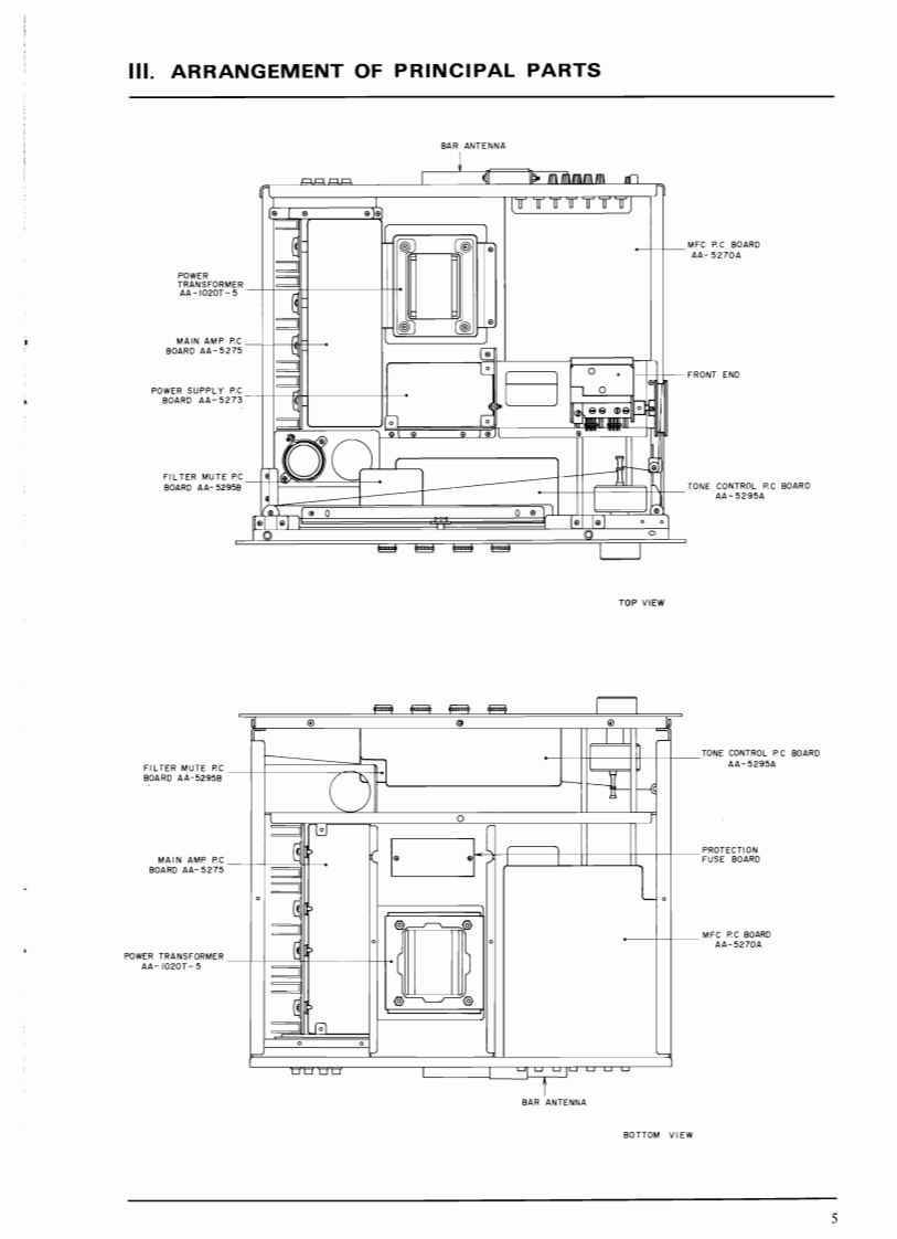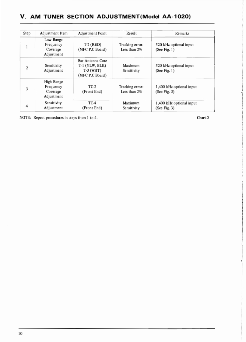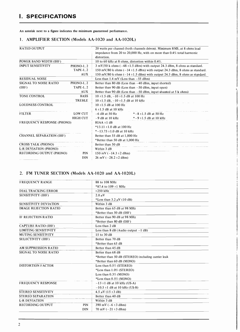 SECTION 1SERVICE MANUALTABLE OF CONTENTSI.SPECIFICATIONS .................................................................2IL.DISMANTLING0 F UNIT4.ARRANGEMENT OF PRINCIPAL PARTS...............................................IV.FM TUNER SECTION ADJUSTMENTS................................................6V.AM TUNER SECTION ADJUSTMENT (Model AA-1020)...................................10VI.AM (LW AND MW)TUNER SECTION ADJUSTMENT (Model AA-1020L).....................11I.LW SECTION ADJUSTMENT.......................................................112.MW SECTION ADJUSTMENT.......................................................11VII.MAIN AMPLIFIER ADJUSTMENT.....................................................12VII.TUNINGCORD THREADING.........................................................13X.CLASSIFICATION OF VARIOUS P.C BOARDS..........................................141.P.C BOARD INTERCHANGEABILITY CHART.........................................142.COMPOSITION OF VARIOUS P.C BOARDS..................................15For basic adjustments,measuring methods,and operating principles,refer to GENERAL OPERAT.ING PRINCIPLES AND ADJUSTMENTS.1