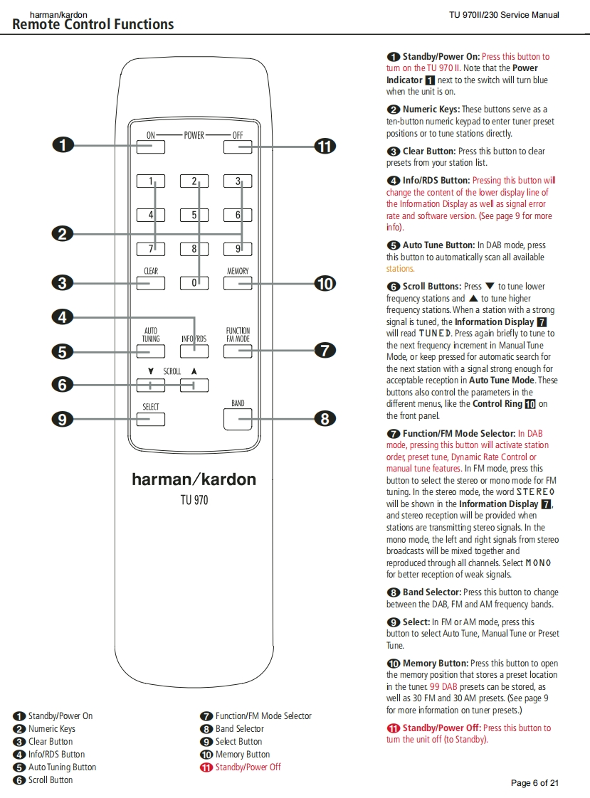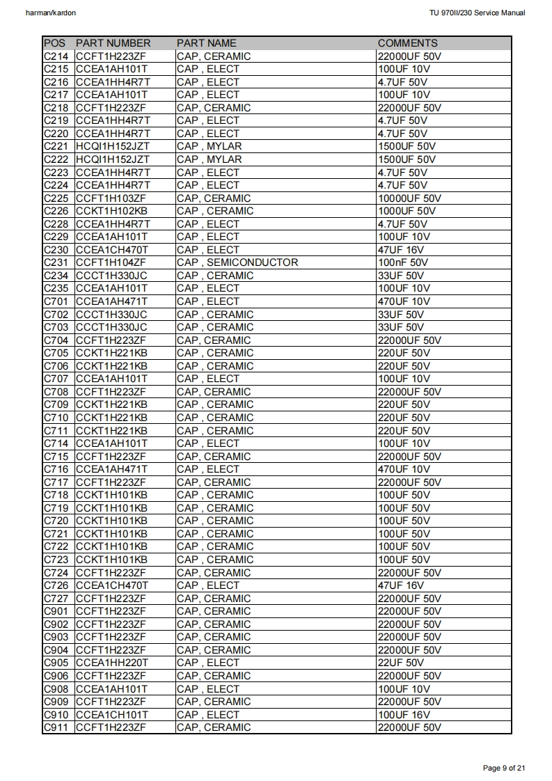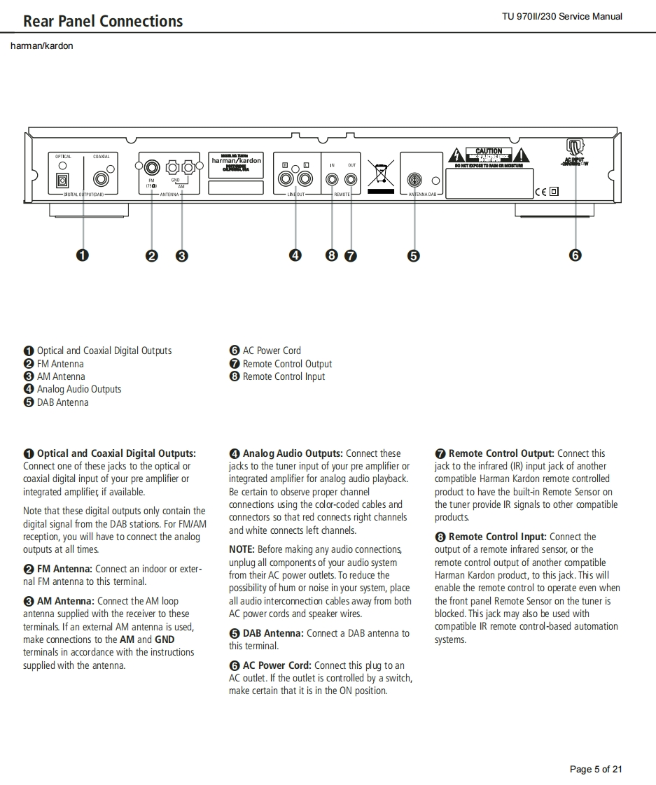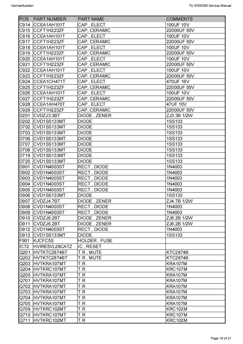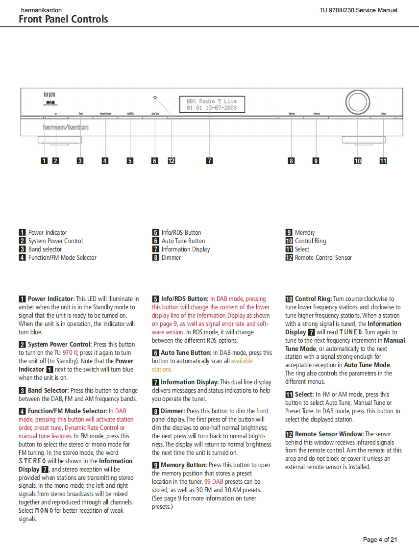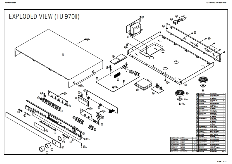 harman/kardonTU 97011/230 Service Manualharman/kardonService ManualTU9701I/230FM/AM/DAB TunerU四FM97.98HHzharman/kardonCONTENTSTECHNICAL SPECIFICATIONSELECTRICAL PARTS LIST8TROUBLESHOOTING GUIDE3SEMICONDUCTOR FUNCTION/PINOUTS 15FRONT PANEL CONTROLS4PCB DRAWINGS18REAR PANEL CONNECTIONS6BLOCK DIAGRAM19REMOTE CONTROL FUNCTIONS6WIRING DIAGRAM0EXPLODED VIEW AND PARTS>SCHEMATIC DIAGRAM21Released EU2008harman/kardon,Inc.Rev0,10/2008250 Crossways Park Dr.Woodbury,New York,11797Page 1 of 21
