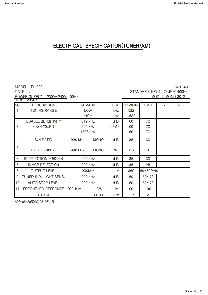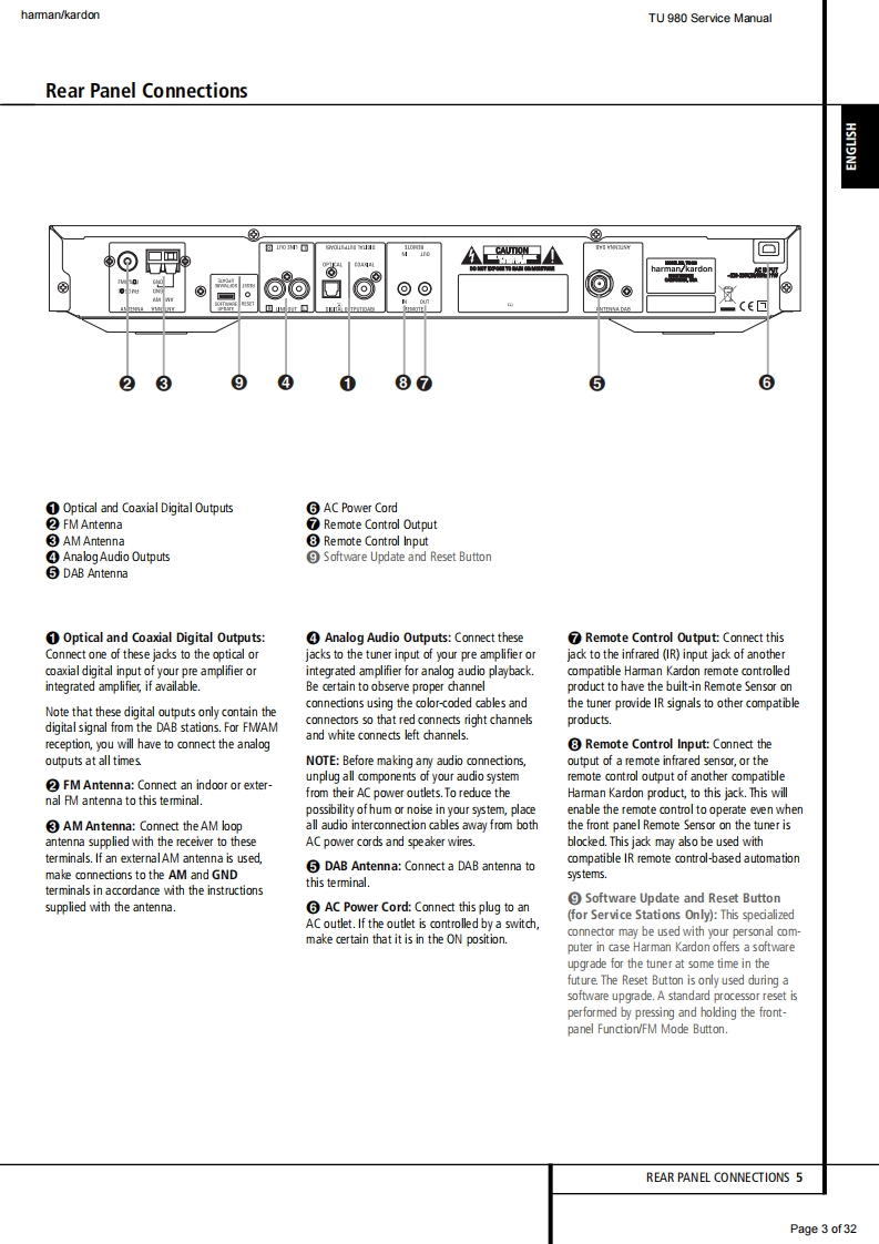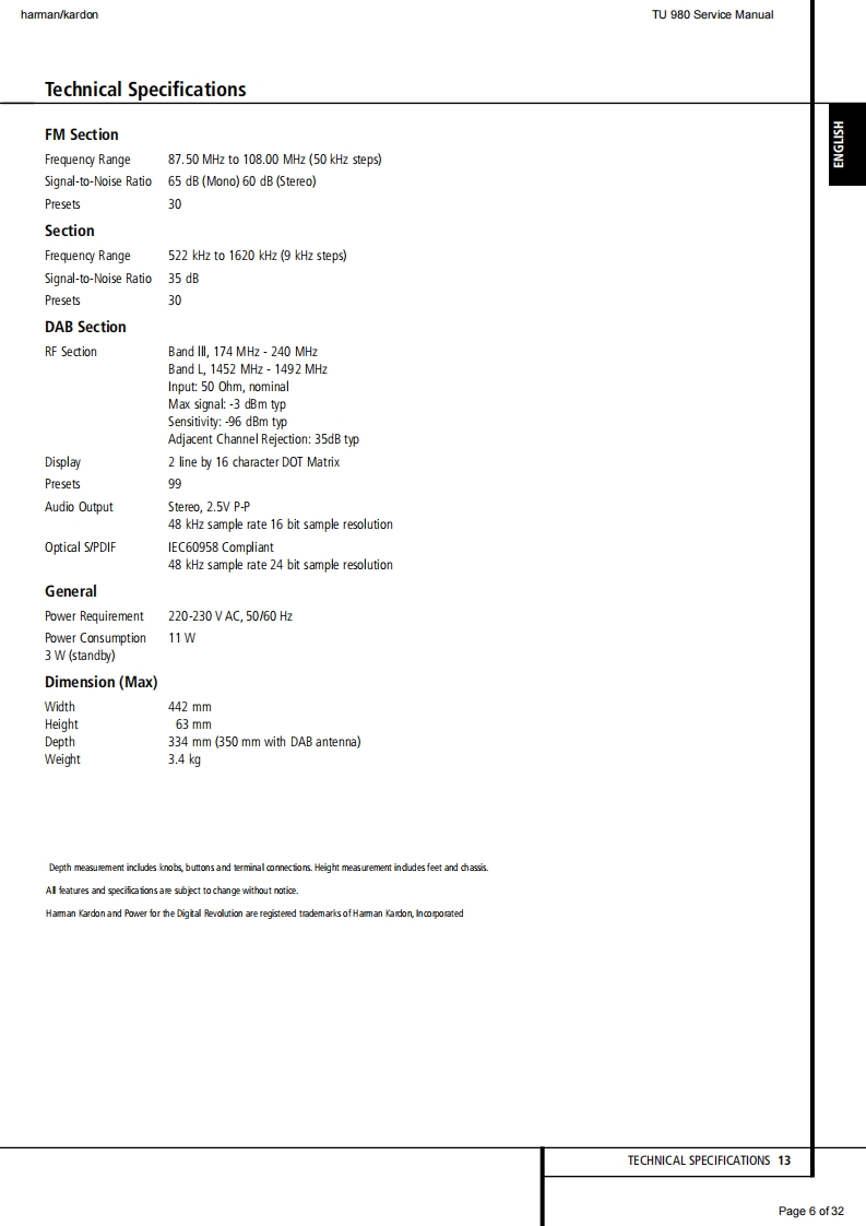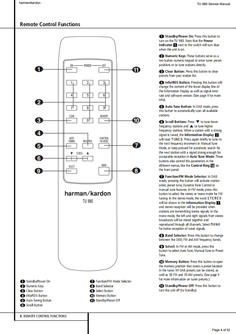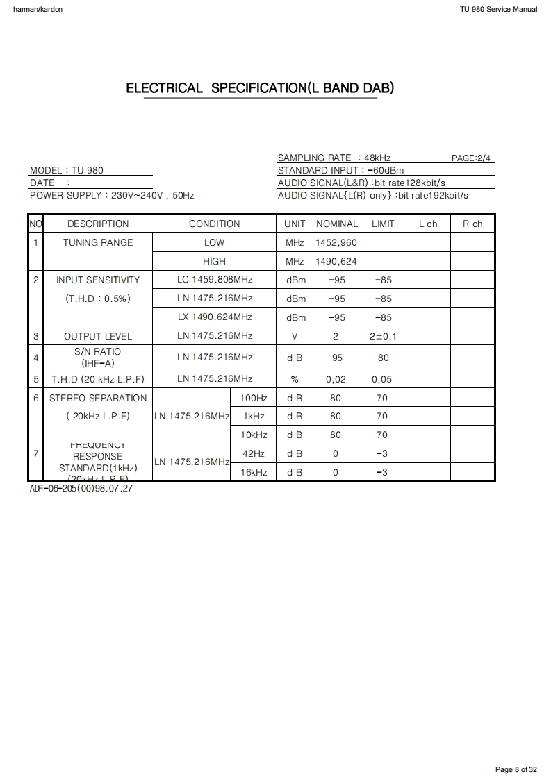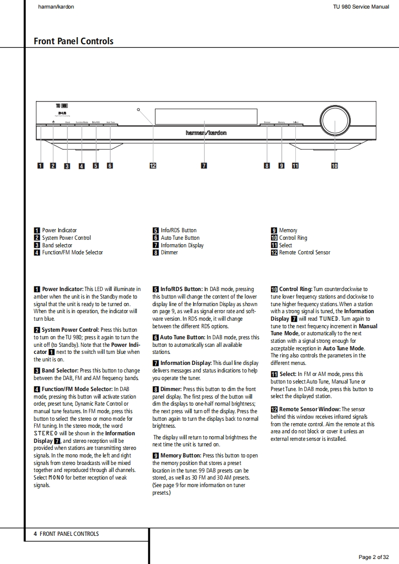 hamman/kardonTU 980 Service Manualharman/kardonService ManualTU980/230FM/AM/Dual-band DAB Tuner with RDS盟SWR3LIVE LYRIXharman/kardonCONTENTSFRONT PANEL CONTROLSEXPLODED VIEW AND PARTS13REAR PANEL CONNECTIONS3ELECTRICAL PARTS LIST14REMOTE CONTROL FUNCTIONS4SEMICONDUCTOR FUNCTION/PINOUTS 21TROUBLESHOOTING GUIDEPCB DRAWING2TECHNICAL SPECIFICATIONS6BLOCK DIAGRAM30PACKAGE LIST AND PARTS11WIRING DIAGRAM31DISASSEMBLY2SCHEMATIC DIAGRAM2Released EU2010harman/kardon,IncRev0,09/2010250 Crossways Park Dr.Woodbury,New York,11797Page 1 of32