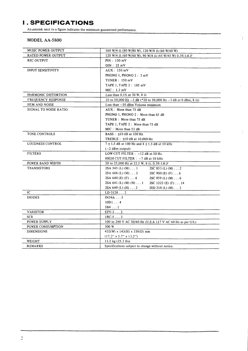 AA-5800AA-5500AA-5200TABLE OF CONTENTSI.SPECIFICATIONS...............................2Ⅱ.DISMANTLING OF AMPLIFIERS5皿ARRANGEMENT OF MAIN PARTS................IV.MEASURING METHOD.........9V.MAIN AMPLIFIERADJUSTMENTS.................oVI.E.P.C.(ELECTRIC PROTECTION CIRCUIT)ADJUSTMENT.................................12VII.COMPOSITE VIEWS OF COMPONENTS.............3VII.SCHEMATIC DIAGRAMWHEN PLACING ORDER FOR PARTS,PLEASE USE SEPARATE PARTS LIST.