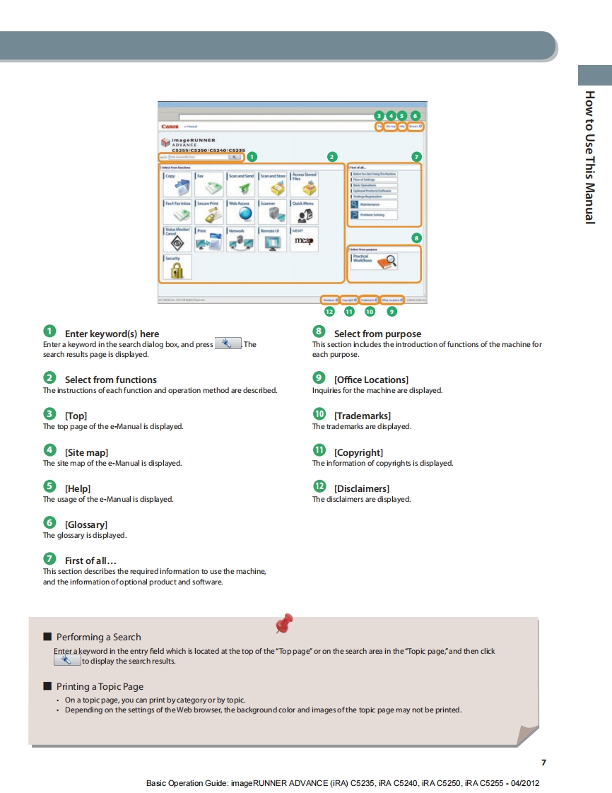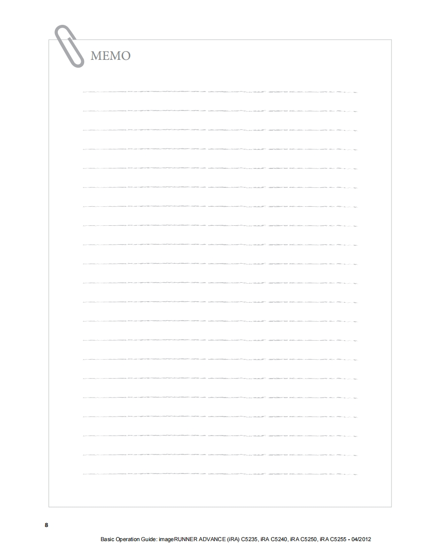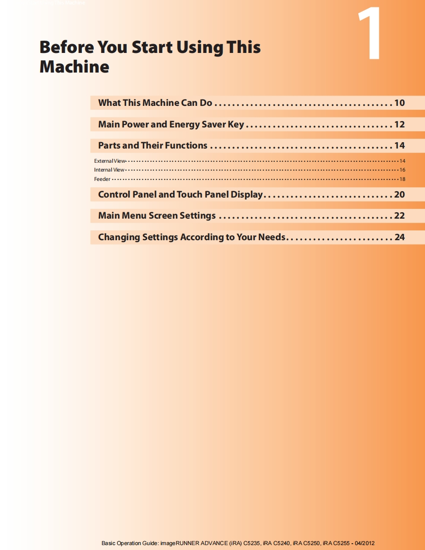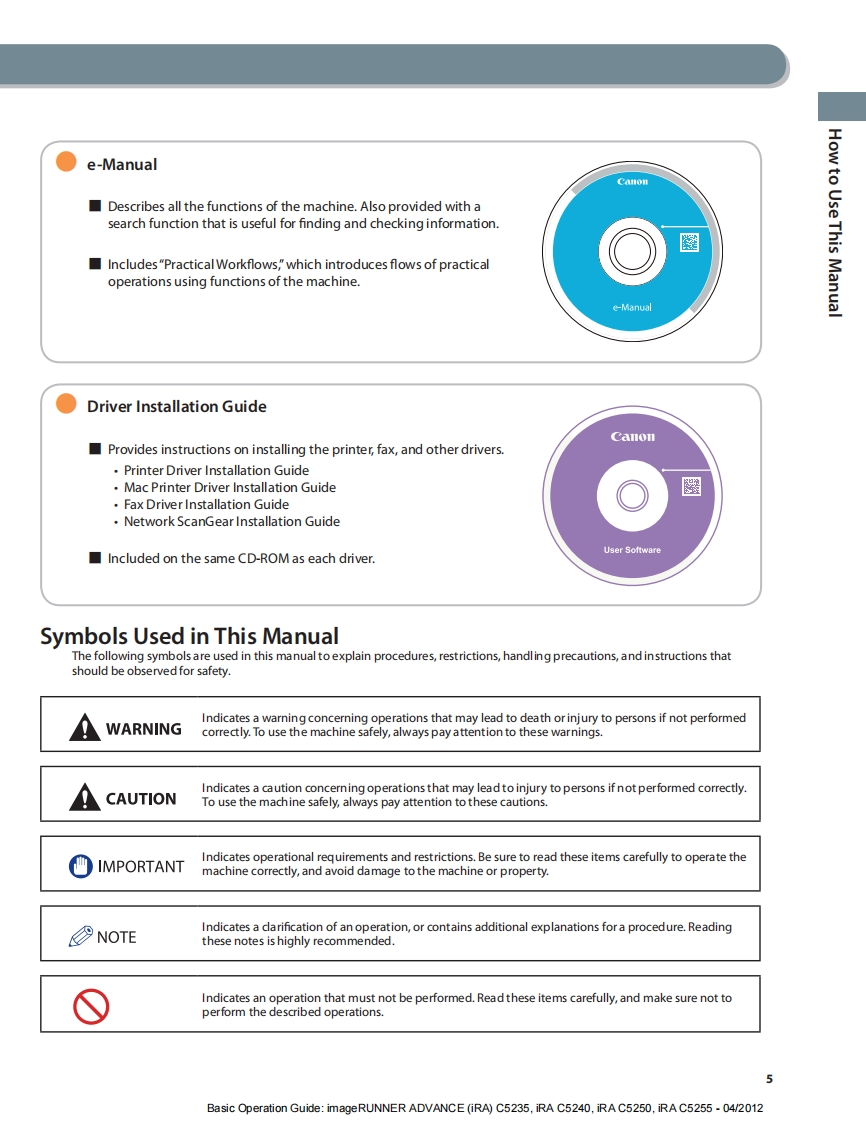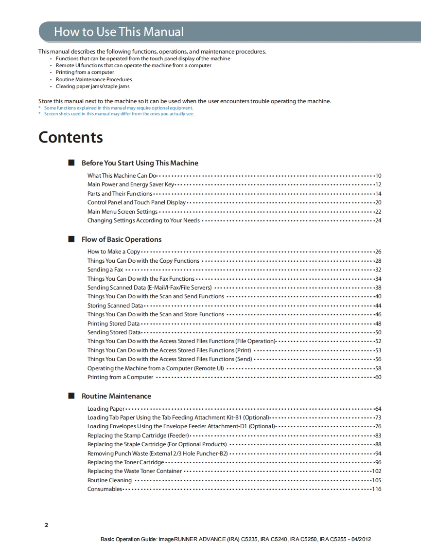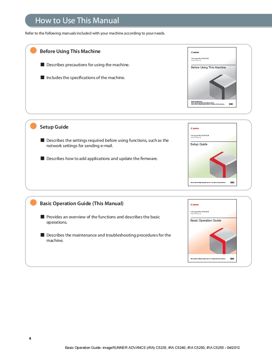 CanonimageRUNNERADVANCEC5255/C5250/C5240/C5235Basic Operation GuideAfter you finish reading this guide,store it in a safe place for future reference.ENGBasic Operation Guide:imageRUNNER ADVANCE(iRA)C5235,iRA C5240,iRA C5250,iRA C5255-04/2012