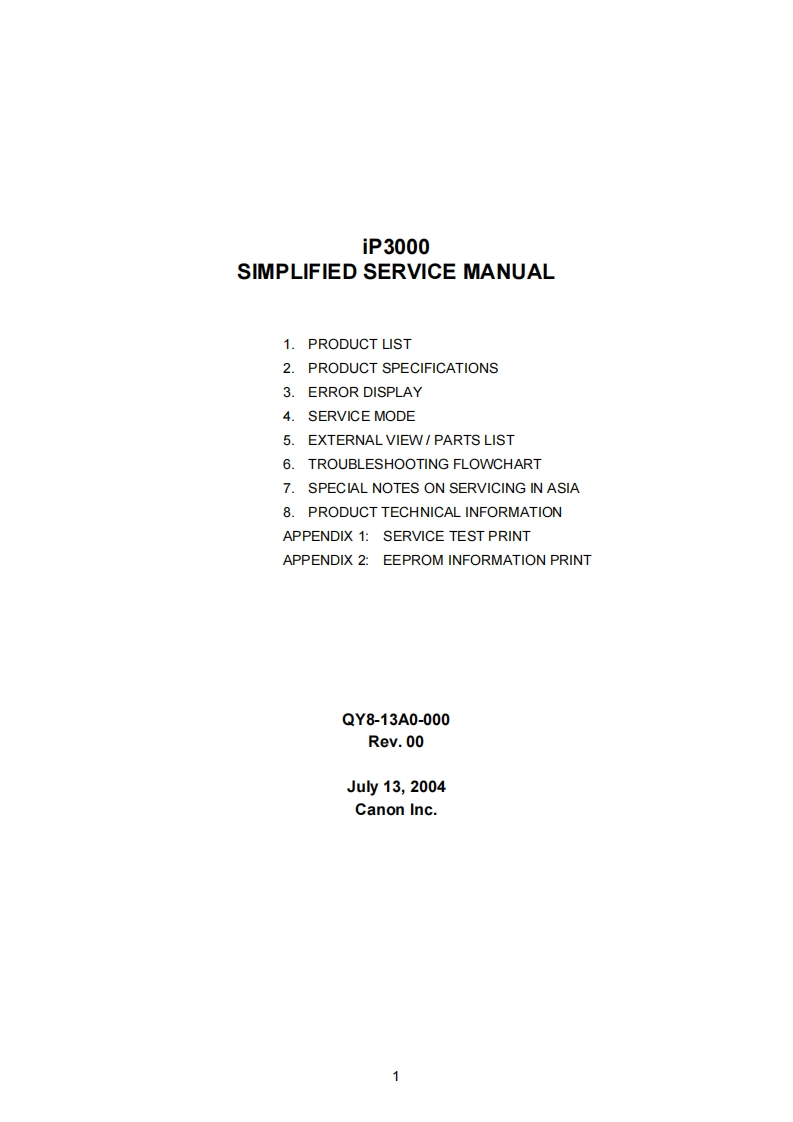 iP3000SERVICEMANUALCanonCopyright 2004,Canon U.S.A.This technical publication is the proprietary and confidential infommation of Canon U.S.A.whichshall be retained for reference purposes by Authorized Service Facilities of Canon U.S.A.Its unauthorized use is prohibited.