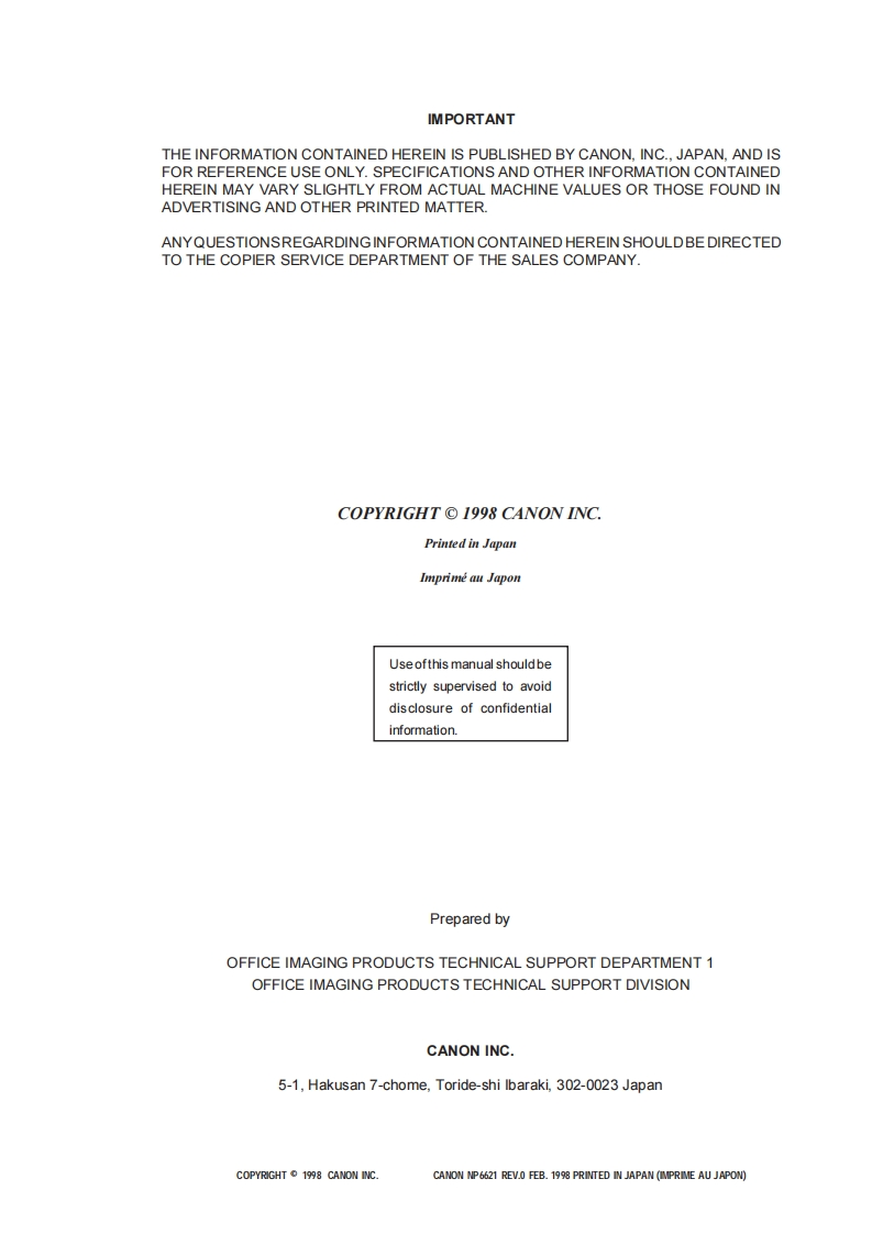 Canon-NP6621-维修维护手册找手册网30天前发布关注私信3.83MB340页039Canon-NP6621-维修维护手册此内容为付费资源,请付费后查看¥19¥21黄金会员免费钻石会员免费登录购买付费资源 第1页 / 共340页 第2页 / 共340页 第3页 / 共340页 第4页 / 共340页 第5页 / 共340页 第6页 / 共340页 第7页 / 共340页 第8页 / 共340页 第9页 / 共340页 第10页 / 共340页 试读已结束,还剩330页,您可下载完整版后进行离线阅读 THE END佳能 文本预览 NP6621SERVICEMANUALREVISION 0ra1011FEB.1998FY8-13F4-000COPYRIGHT 1998 CANON INCCANON NP6621REV.0 FEB.1998 PRINTED IN JAPAN (IMPRIME AU JAPON) 查看更多 收起部分 喜欢就支持一下吧收藏
