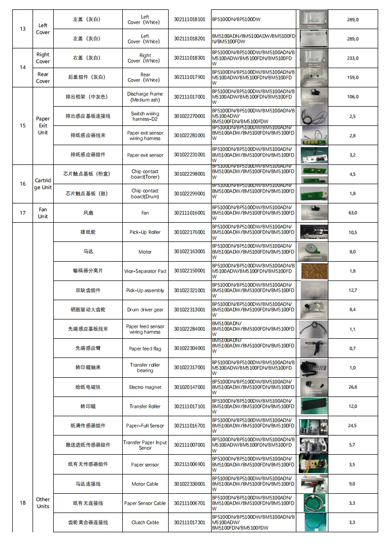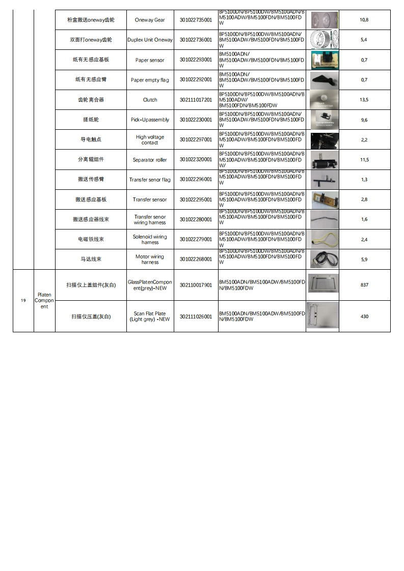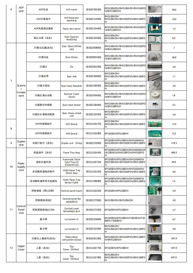 Pantum BP5100/BM5100 Series Spare Part ListVersion:20211123Printer Explosion MapNote:FYlonly,all subject toNo.(Same asaboveName ofUnitSpare Part Name (Chinese)Spare Part NameSAP Part NumberUsed for model(English)represents any numbers)PhotoNet Weight(g)数据基板Data board302110010501BM5100FDN数据基板Data board302110010601BM5100FDW数据基板Data board302110004301BP5100DW数据基板Data board302110004401BM5100ADW81.0DataBoard数据基板Data Board302111016401BP5100DN数据基板Data board302110010401BM5100ADNBP5100DN/BP5100DW/BM5100ADN/电源板与数据基板连接线Power-EngineboardBM5100ADW/BM5100FDN/BM5100FDwiring hamess30102226500161W双eam激光器(带线束)Double Beam LsuBP5100DN/BP5100DW/BM5100ADN(With Cable)301022763001BM5100ADW304.5BM5100FDN/BM5100FDWBP5100DN/BP5100DW/BM5100ADN/B激光器Lsu301022229001M5100ADW/BM5100FDN/BM5100FD299.32LaserUnitLsu激光器线束(12束Bflatcable(12 Lines】301022267001BM5100ADW/BM5100FDN/BM5100FD12,0BLsuBP5100DN/BP5100DW/BM5100ADN/激光器线束(5束)Aflatcable (5Lines)301022266001BM5100ADW/BM5100FDN/BM5100FDABP5100DN/BP5100DW/BM5100ADN/B定影组件.220WFuser Unit -220V302111018801M5100ADW/BM5100FDN/BM5100FD813,0FuserW3UnitBP5100DN/BP5100DW/BM5100ADN/定影驱动大齿轮Fusing driver gear301022312001BM5100ADW/BM5100FDN/BM5100FD11.9WPowerBP5100DN/BP5100DW/BM5100ADN/B4Board电源基板Power Board3021110161015100ADW/BM5100FDN/BM5100FD269.5UnitWBP5100DN/BP5100DW/BM5100ADN/B引擎基板Engine Board302111016201M5100ADW/BM5100FDN/BM5100FD83.0BP5100DN/BP5100DW/BM5100ADNEngine引擎板与主马达连接线束Chip contact wiringBM5100ADW/BM5100FDN/BM5100FDhamess(Toner)30102228200136.0BoardUnitBP5100DN/BP5100DW/BM5100ADN/B引擎与数据基板线束Chip contact wiring301022283001M5100ADW/BM5100FDN/BM5100FD1.6harness(Drum)WBP5100DN/BP5100DW/BM5100ADN/引擎与数据基板排线Engine Board Cable302111017601BM5100ADW/BM5100FDN/BM5100FD18WADF扫描头Adf Cis301022681001BM5100ADN/BM5100ADW/BM5100FDN/BM5100FDW46.3BM5100ADN/ADF搓纸辊Adf pick-Up301022302001BM5100ADW/BM5100FDN/BM5100FD27.0assemblyWADF开关传感器Adfswitch sensor301022300001BM5100ADN/BM5100ADW/BM5100FDN/BM5100FDW2.5