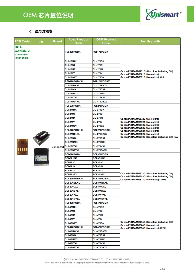 CanonVIOEM芯片复位说明找手册网29天前发布关注私信0.52MB5页050CanonVIOEM芯片复位说明此内容为付费资源,请付费后查看¥19¥21黄金会员免费钻石会员免费登录购买付费资源 第1页 / 共5页 第2页 / 共5页 第3页 / 共5页 第4页 / 共5页 第5页 / 共5页 已完成全部阅读,共5页 THE END佳能 文本预览 OEM芯片复位说明CUnismart"Uni Canon VI(X70、X71系列)OEM芯片复位说明V1.0目录1。复位技术特征…22.设备操作…,23。代码提示及具体含义…34。复位注意事项…35.Canon VI夹具与读写头,量盒图片…36。型号对照表 查看更多 收起部分 喜欢就支持一下吧收藏