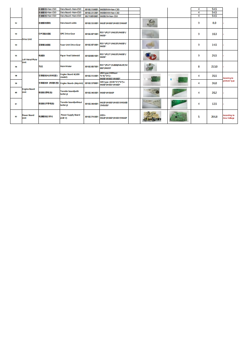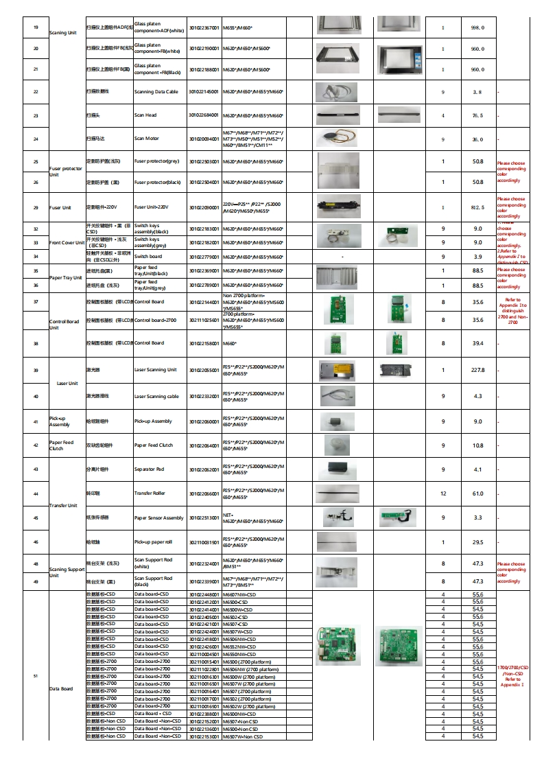 Pantum M6200/M6500/M6550/M6600 Series Spare Part ListVersion:20220427Printer Explosion Map22PPM MFP (ADF)22PPM MFP (Flatbed Scanner)MinimunName of UniteP阳t他mSpare P rt NamPhoto 2OrderNet(Piece/boxWeight(g)ADF较叶用Glass platenhinged30102338001M555*M650*92ADF较知件C东】Glass platen恤ghig)30102E9001M555“ME09成23ADF分商片ADF Sepantor Pad3010位2150001M5AME0P51“/B511.84AD分阳时ADF SepartorA sambly301024S00155*M任090.95ADF瑟ADF Rickup Assembly3010应251001555*M任0946ADF马ADF Motor30124700使3DF UnitAD伟症接线ADF Sensor cable3010应2329001M5Z0M臣0M伍555091.0ADF paper Sensor3010厘24800M555AM任09269ADF归点2传减网scan Reset Sensor01284001910ADF(whie)30102837001M555*M任025.0日农E善A国0102835003.0日始散压盖·F网mFht列0FBwht)30102337001M520M650MSEOO280日始农E盖FB周3010233500180好程知式工色不私scarner Component(Wthout ADF油d成0302111014801M555*NM任0202002111014901202.0周po302111015001M520M650MSE002143.0302111015201M5DM50M00214303010亚218900M555*M650*980