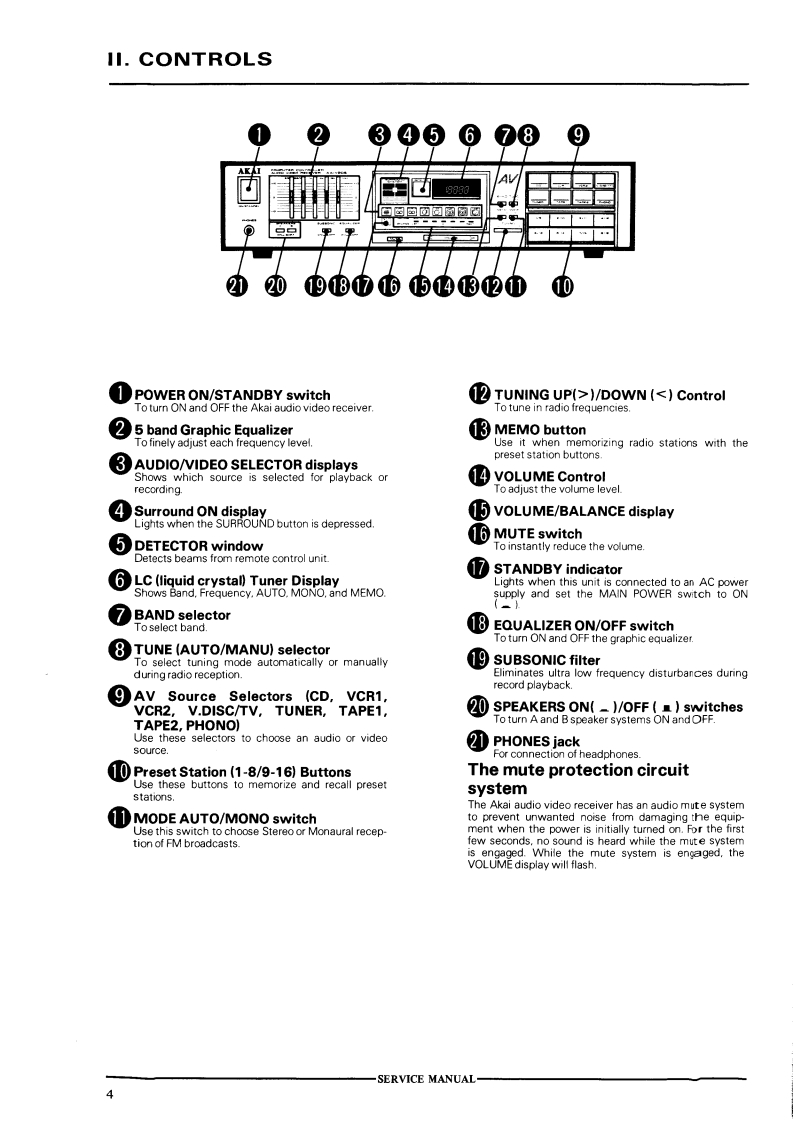AKAI SERVICE MANUAL8888国回画卤回岗圆简COMPUTER CONTROLLED AUDIO VIDEO RECEIVERMODEL AA-V205SPECIFICATIONSAmplifier SectionTuner SectionPower outputFM TunerRated power outputTuning frequency range87.5MHz to 108.0MHz20Hz to 20 kHz60W/0.05%at8ohm3Usable sensitivity11.2dBfOutput power by FTCQuieting sensitivity (HF)16.2dBf (Mono)/37.2dBf (Stereo)20Hz to 20kHz60W/0.05%at 8 ohms(S/N=50dB)Output power by F.NormCapture ratio1.563Hz to 12.5kHz65WSelectivity (400kHz)......60dBOutput power by DINImage rejection85dB1kHz...65WIF rejection90d BMusic power(Both channels)280WSpurious rejection80dBPower bandwidthAM suppression..60dB(IHF-3dB,8 ohms)5Hz to 70kHz/0.5%Sub carrier suppression60dBS/N (IHF-A)S/N (IHF)75dB (Mono)/65dB (Stereo)PHONO75dBHarmonic distortion0.1%(Mono)/0.3%(Stereo)CO.TAPE·.98dBStereo separation (1kHz)45dBResidual noise(8 ohms)0.5mVFrequency response30Hzto15kHz±0.5dBChannel separation(HF,1kHz)65dBAM TunerDamping factorAM tuner sectionLW tuner section(1kHz,8 ohms)50(MW for AA-V205L)(for AA-V205L)Speaker impedanceTuning frequency rangeA or B8 to 16 ohmsUSA Canada530kHz to 1,610kHzA+B16 ohmsOther countries531kHz to 1,602kHz146kHz to 353kHzSURROUND8 ohmsUsable sensitivityInput sensitivity/Impedance(Loop antenna)300uV/m800uV/mPHONO2.0mV/47kohmsSelectivity22dBAndRCD.TAPE150mV/47kohmsImage rejection45dB45dBV.DISC/VCR (Audio)150mV/47kohmsIF rejection35dB35dBV.DISC/VCR (Video)1Vp-p/75 ohmsS/N40dB35dBOutput level/ImpedanceT.H.D.1.0%2.0%TAPE REC444150mV/1kohmsPower requirements120V,60Hz for USA CanadaVCR (Audio)150mV/1kohms220V,50Hz for Europe except UKMONITOR/VCR (Video)1Vp-p/lkohms240V,50Hz for UK AustraliaFrequency response110V/120V/220V/240V,50Hz/60HzPHONO (RIAA)±0.5dBconvertible for other countriesAUX/TAPE5Hz to 100kHz -3dBDimensions440W)×100H)×343(D)mmGraphic equalizer17.3×3.9x13.5 inches)Control range .±10dBWeight7.4kg(16.31bs)Center frequency .......63Hz/250Hz/1kHz/4kHz/16kHzPhono max.input level(1kHz)4120mVFor improvement purposes,specifications and design are subject to change without notice