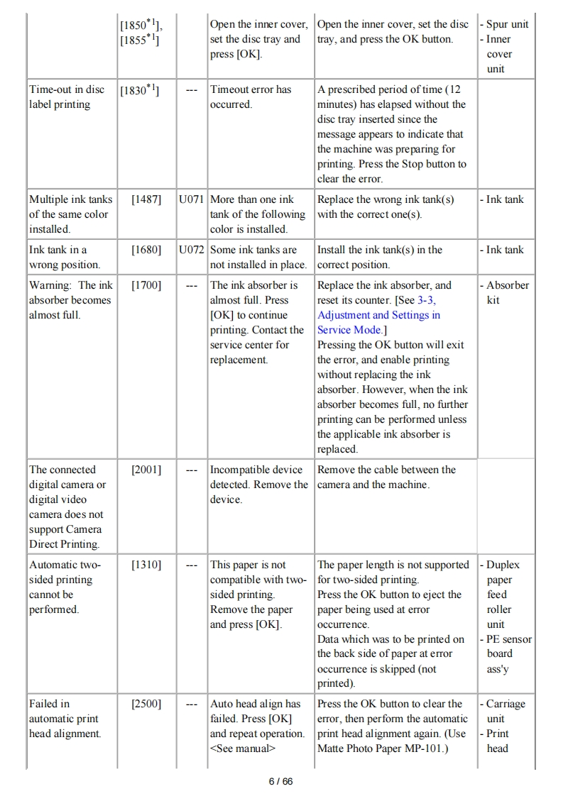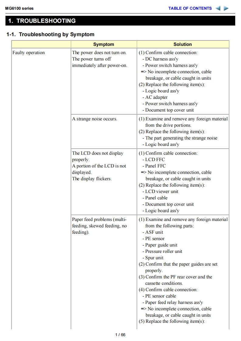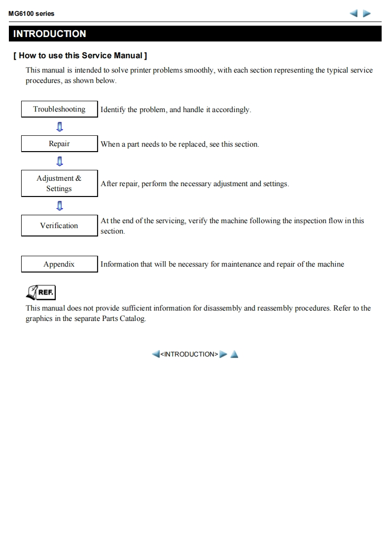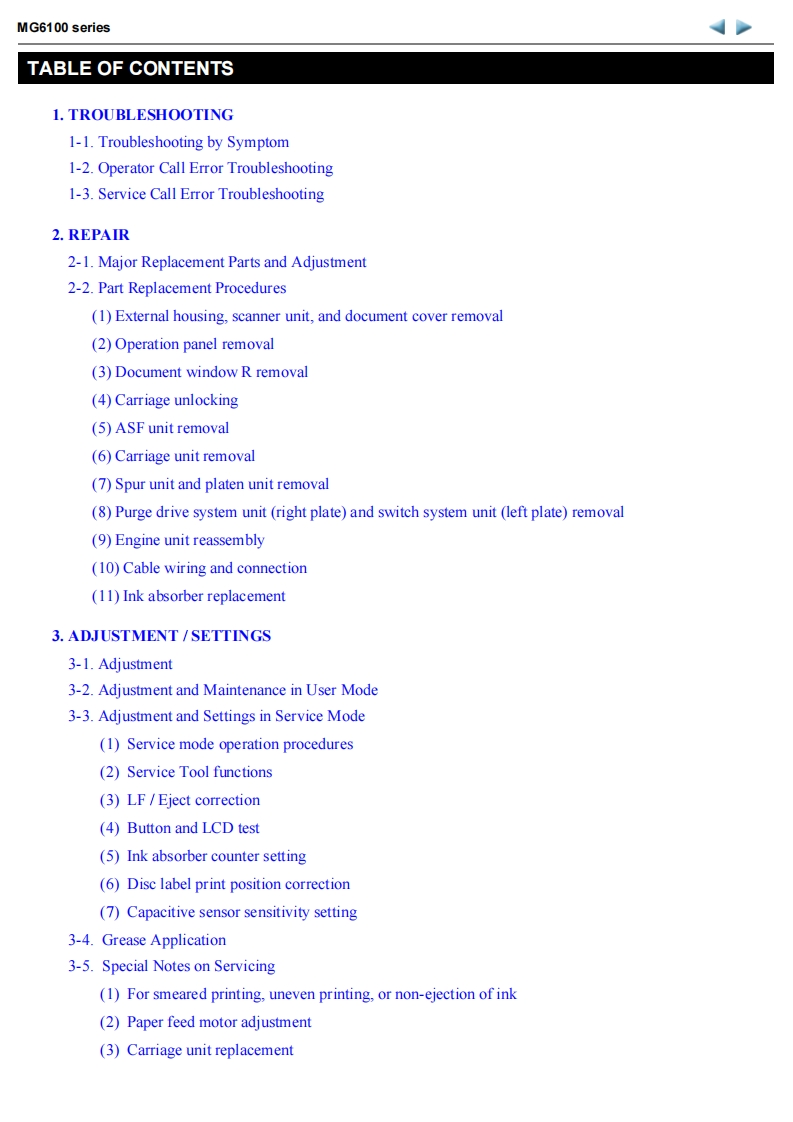 MG6100 seriesService manual(MG6110/MG6120/MG6130/MG6140/MG6150/MG6170/MG6180)Revision 0OY8-13DA-000COPYRIGHTC2010 CANON INC.CANON MG6100 series 082010 XX 0.00-0ScopeThis manual has been issued by Canon Inc.,to provide the service technicians of this product with the information necessary forqualified persons to learn technical theory,installation,maintenance,and repair of products.The manual covers informationapplicable in all regions where the product is sold.For this reason,it may contain information that is not applicable to yourregion.This manual does not provide sufficient information for disassembly and reassembly procedures.Refer to the graphics in the separate Parts Catalog.RevisionThis manual could include technical inaccuracies or typographical errors due to improvements or changes made to the product.When changes are made to the contents of the manual,Canon will release technical information when necessary.Whensubstantial changes are made to the contents ofthe manual,Canon will issue a revised edition.The following do not apply if they do not conform to the laws and regulations ofthe region where the manual or product is used:TrademarksProduct and brand names appearing in this manual are registered trademarks or trademarks of the respective holders.CopyrightAll rights reserved.No parts of this manual may be reproduced in any form or by any means or translated into another languagewithout the written permission ofCanon Inc.,except in the case of internal business use.Copyright2010 by Canon Inc.CANON INC.Inkjet Device Market Support Management Div.451,Tsukagoshi 3-chome,Saiwai-ku,Kawasaki-shi,Kanagawa 212-8530,Japan