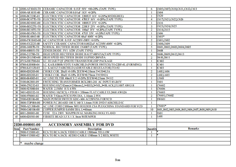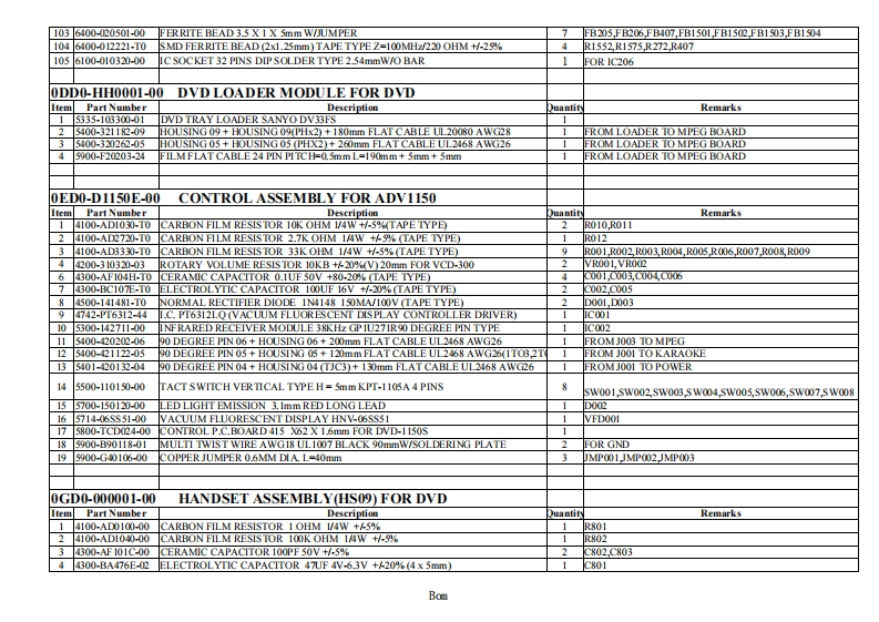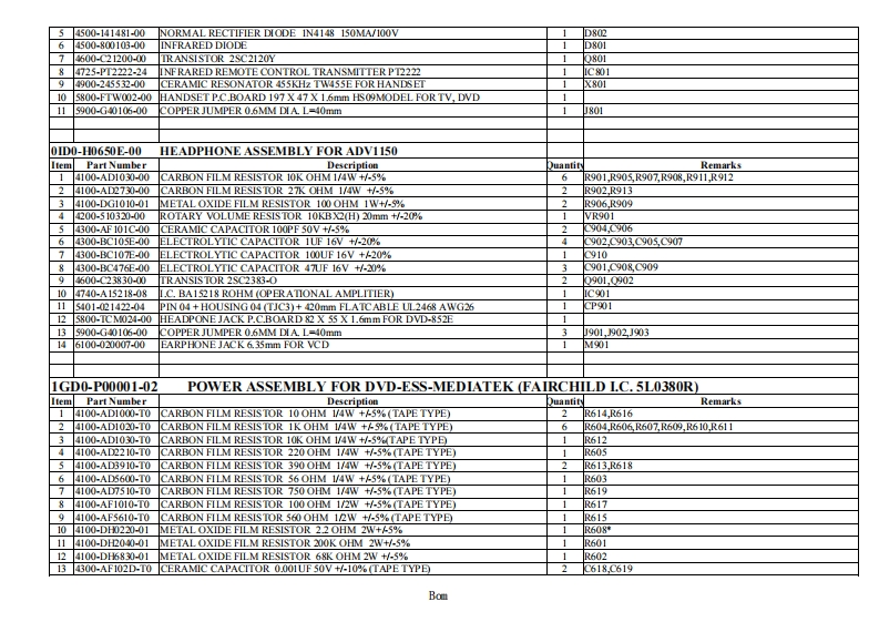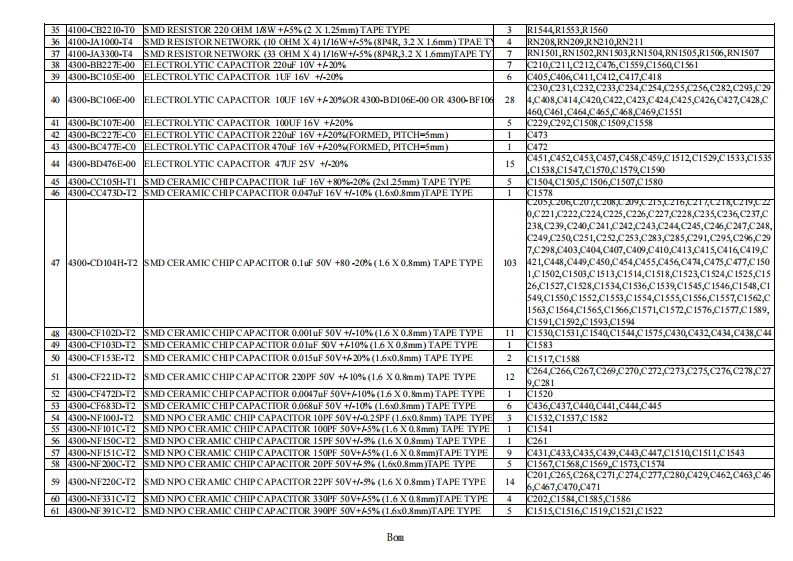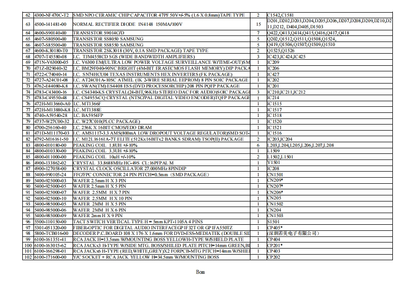 1.PART LIST OF ADV11500B10-EM650E-00 MAIN ASSEMBLY ESS DECODER MEDIATEK SERVO FOR DVDItem Part NumberDescriptionuantityRemarks14100-CA0000-T0SMD RESISTORO OHM 1/16W +/-5%(1.6 X 0.8mm)TAPE TYPE10R209,R223R224R225,R233,R235R408,R1543,R1561R157224100-CA0100-T0SMD RESISTOR 1 OHM 1/16W +5%(1.6x0.8mm)TAPE TYPER1515,R1516,R1517,R151834100-CA1000-T0SMD RESISTOR 10 OHM 1/16W+A5%(1.6X0.8mm)TAPE TYPE11218,R219,R259,R260,R410,R433,R435,R437,R439,R441,R4444100-CA120-T0SMD RESISTOR 1K OHM 1/16W+45%(1.6 X 0.8mm)TAPE TYPE6R20N,R205,R227,R230,R1529,R153054100-CA1030-T0SMD RESISTOR 10K OHM 1/16W+/-5%(1.6 X0.8mm)TAPE TYPE16R411,R412,R414R417,R20,R23,R426,R429,R1502,R1503,R1519,R1547,R1550R1551,R1573,R15254100-CA1040-T0SMD RESISTOR 100K OHM 1/16W +/-5%(1.6 X0.8mm)TAPE TYPE12R409,R432,R434,R436,R438,R440,R442,R1501,R1S04,R1534R1542R15584100-CA10s0-T0SMD RESISTOR 1M OHM 1/16W +/-5%(1.6x0.8mm)TAPE TYPE2R1568R45984100-CA1060-T0SMD RESISTOR 10MOHM 1/16W +/(1.6x0.8mm)TAPE TYPE1R45894100-CA1230-T0SMD RESISTOR 12K OHM 1/16W +/-5%(1.6x0.8mm)TAPE TYPE2R1540R1539104100-CA1530-T0SMD RESISTOR 15K OHM 1/16W +/-5%(1.6x0.8mm)TAPE TYPE3R1556R1S67.R1574114100-CA1830-T0SMD RESISTOR 18K OHM 1/16W+/-5%(1.6x0.8mm)TAPE TYPE8R416,R419R422R425,R428,R431,R1541,R15714100-CA2030-T0SMD RESISTOR 20K OHM 1/16W +/-5%(1.6X0.8mm)TAPE TYPE5R1520R1521,R1523,R1524,R1537134100-CA2200-T0SMD RESISTOR 22 OHM 1/16W +A5%(1.6 X 0.8mm)TAPE TYPE4R1546,R1548,R1549,R1557144100-CA2210-T0SMD RESISTOR 220 OHM 1/16W +/-5%(1.6 X0.8mm)TAPE TYPE3R252,R1527,R1528154100-CA2220-T0SMD RESISTOR 2.2K OHM 1/16W +4%(1.6 X0.8mm)TAPE TYPE3R228,R229R451164100-CA2730-T0SMD RESISTOR 27K OHM 1/16W +/-5%(1.6 X0.8mm)TAPE TYPE4R1509,R1510,R1511,R15124100-CA3300-T0SMD RESISTOR 33 OHM 1/16W +A5%(1.6 X 0.8mm)TAPE TYPE12211,R226232,R242,R244,R245,R246,R247,R248R249,R250R251184100-CA3310-0SMD RESISTOR 330 OHM 1/16W+/-5%(1.6 X0.8mm)TAPE TYPE2R461,R457194100-CA3320-1T0SMD RESISTOR 3.3K OHM 1/16W+A1%(1.6x0.8mm)TAPE TYPE6R415,R418R421,R424,R427,R430204100-CA3330-T0SMD RESISTOR 33K OHM 1/16W +/-5%(1.6 X0.8mm)TAPE TYPE8R1505R1s06,R1507,R1508,R1533,R1535R1538R15594100-CA3910-T0SMDRESISTOR 390 OHM 1/16W +/-5%(1.6x0.8mm)TAPE TYPE3R1526R1531R1532224100-CA3920-T0SMD RESISTOR 3.9K OHM 1/16W+A%(1.6x0.8mm)TAPE TYPE1267234100-CA3930-T0SMD RESISTOR 39K OHM 1/16W +/-5%(1.6x0.8mm)TAPE TYPE4R1536R1545,R1563,R150244100-CA4700-T0SMD RESISTOR 47 OHM 1/16W +A5%(16X0.8mm)TAPE TYPE1R1554254100-CA410-T0SMD RESISTOR 470 OHM 1/16W +/-5%(1.6 X0.8mm)TAPE TYPER413,R444R445R446,R447,R448-R449264100-CA4720-T0SMD RESISTOR 4.7K OHM 1/16W +4%(1.6 X0.8mm)TAPE TYPE8R201R203R206R207,R210,R222,R236,R1555274100-CA4730-T0SMD RESISTOR 47K OHM 1/16W+/-5%(1.6 X0.8mm)TAPE TYPE1R1564284100-CcA5120-T0SMD RESISTOR 5.1K OHM 1/16W+%(1.6 X0.8mm)TAPE TYPER1566R156294100-CA6900-T0SMD RESISTOR 68 OHM 1/16W +A5%(1.6X0.8mm)TAPE TYPE1R462304100-CA6820-T0SMD RESISTOR 6.8K OHM 1/16W +%(16X0.8mm)TAPE TYPE1R450314100-CA7500-T0SMD RESISTOR 75 OHM 1/16W +A5%(16X0.8mm)TAPE TYPE6264R265R266R268,R269R270324