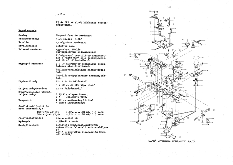 MODELAJ-350AKAIKH,RH,URH savos radi6beepitett kazettas magnovalAMOVILLKeziratkent sokszorositva a RAMOVILL Szervizhal6zatreszere,belso hasznalatra1.64Usszeallitotta:Dudis Arpad,Ellenrizte:Daniel J6zsef1979.MUSZAKI ADATOK·*Radi6egwBég·Hullamsavok535-16o5kHzKH /MW/4,7-12MHzRH /SW/64-74日zURH /FM/rzékenysegKH o,85 mV/mferritr6lRH o,6 mV/mURH 5 uVantennar6lA megadott eezekenysegi adatok 26 dB jel/zaj viszonyra vonat-koznak。Kozepfrekvencia460 kHz AM savok1o,7Hz-FM8ávSzelektivitasAM-en 22 dB-nel jobb 1 MHz-en±9kHz e1 hango1asna1PM-en 2o dB-nel jobb 69 MHz-ent300 kHz elhangolasnalPrekvenciaatvitel/elektroakusztikus/AM-en1o0.·····.3000HzFM-en30.··….15000HzAntennakAM savokon beepitett ferritantennaés kuls6 antennacsatlakoztat.ágilehetoseg.