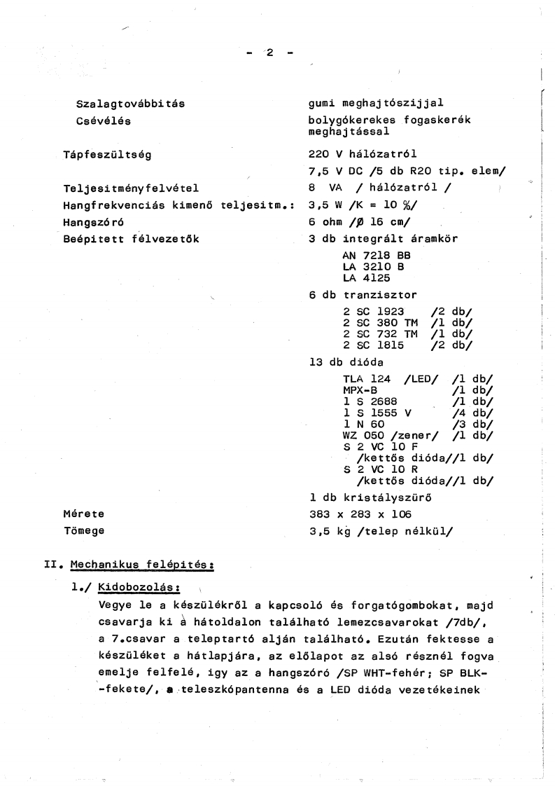 AKAIAKAI AJ 360 FL RADIO ES KAZETTASMAGNETOFON KOMBINACIOKeziratkent sokszorositva a Ramovill szervizhazatAMOVILLroszdre,bels8 hasznalatraOsszesllftotta:Walter Jen6EllenGrizte :Daniel Jozsef1.891980.I。Mi8 zaki adatokRad1№egys6g:HullamsavokHosszuhu11am/儿w/150-290kHzK6zéphu11am/Mw/525-1605kHzURH/FM/64-73MHzKozepfrekvencia AM savok460kHzFMs台v10,7MHzErz6kenys白g:KH850 V/mHH1000uV/mURH5 vSzelektivitasKH≥30dBHH≥35dBURH≥30dBAntennak:AM savokon beepitett ferritantennaURH vetelnel kihuzhato teleszkopantennaMagnetofon egyseg:SzalagCompact Casette.rendszeruSzalagsebesseg4,76cm/s6cKeze1ésnyomogombos rendszeruSavelrendezěsketsavos monoFelvevo rendszeralland6 magnesu torles,valta-koz6.aram e16m白gnesezés;e16-magnesez6 oszcillator frekven-ciaja a BEAT CUT jelu tol6kap-csoloval /SW 7/valtoztathatoMeghajt6 rendszer7,5 V DC.mikromotor,fordulat-szam stab111z1assa1。