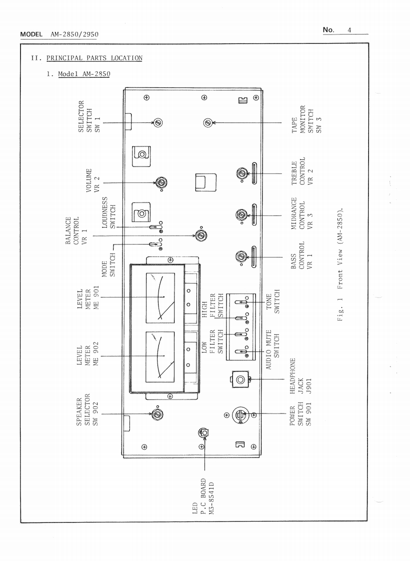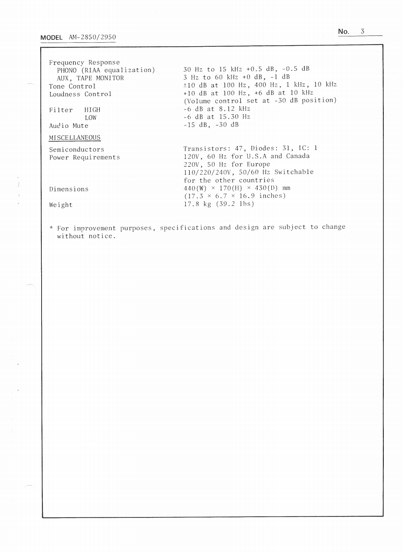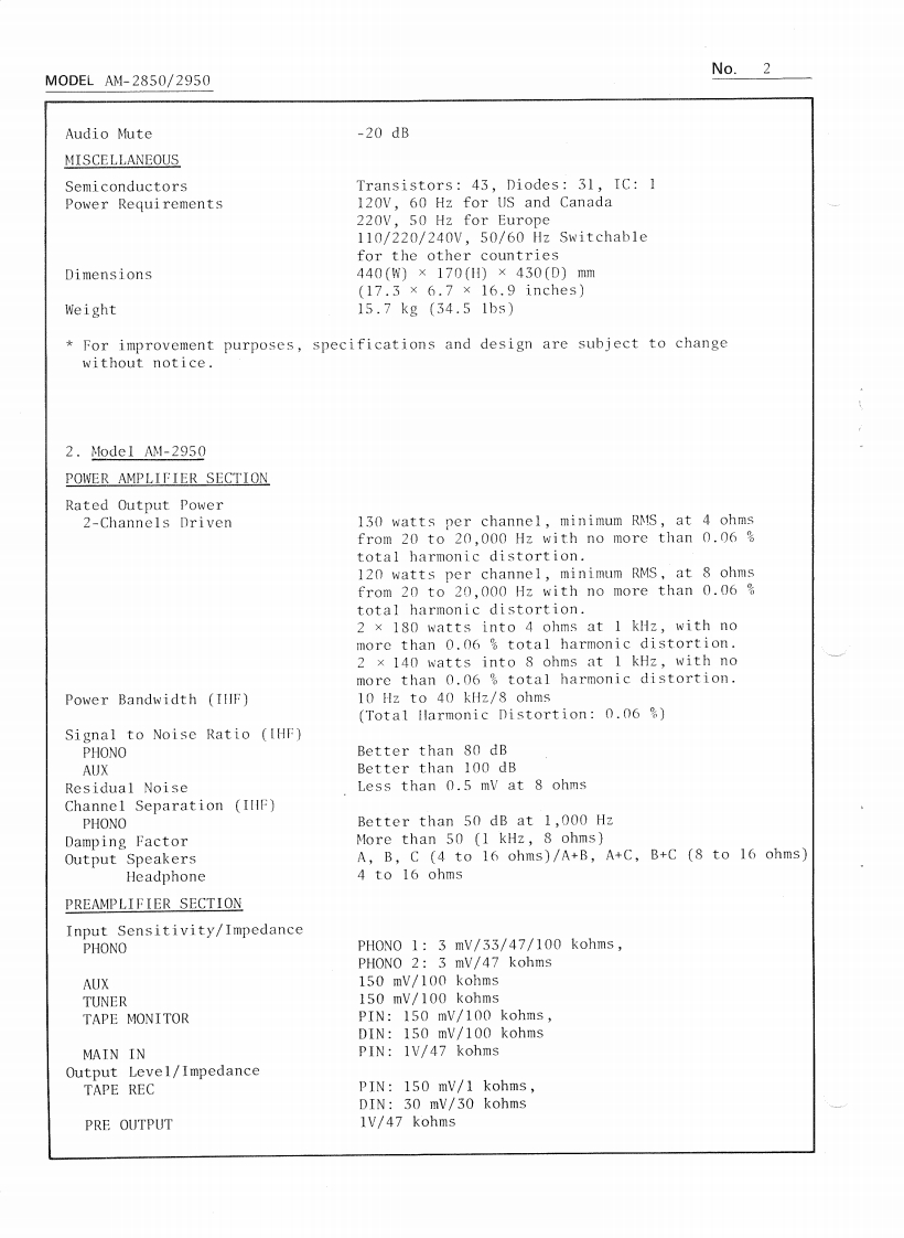 AKAINo.1PRELIMINARY SERVICE MANUALM0 DEL AM-2850/2950DATE January,1979I.TECHNICAL DATA1.Mode1 AM-2850POWER AMPLIFIER SECTIONRated Output Power2-Channels Driven95 watts per channel,minimum RMS,at 4 ohmsfrom 20 to 20,000 Hz with no more than 0.08%total harmonic distortion.85 watts per channel,minimum RMS,at 8 ohmsfrom 20 to 20,000 Hz with no more than 0.08%total harmonic distortion.2 x 140 watts into 8 ohms at I kHz,with nomore than 0.08%total harmonic distortion.2 x 100 watts into 8 ohms at 1 kHz,with nomore than 0.08%total harmonic distortion.Frequency ResponseMain in:DC to 100kHz +0dB,-0.5dBPower Bandwidth (IHF)10 Hz to 40 kHz/8 ohms(Total Harmonic Distortion:0.08%)Signal to Noise Ratio (IHF)PHONOBetter than 75 dBAUXBetter than 95 dBResidual NoiseLess than 0.3 mV at 8 ohmsChannel Separation (IHF)PHONOBetter than 50 dB at lkHzDamping FactorMore than 50 (1 kHz,8 ohms)Output SpeakersA,B,C (4 to 16 ohms)/A+B,A+C,B+C (8 to 16 ohms)Headphone4 to 16 ohmsPRE AMPLIFIER SECTIONInput Sentivity/ImpedancePHONOPHONO 1:3mV/33/47/100 kohms,PHONO 2:3mV/47 kohmsAUX150 mV/100 kohmsTUNER150 mV/100 kohmsTAPE MONITORPIN:150 mV/100 kohms,DIN:30 mV/100 kohmsMAIN INPIN:1V/47 kohmsOutput Level/ImpedanceTAPE RECPIN:150 mV/1 kohms,DIN:150 mV/30 kohmsPRE OUTPUT1V/47 kohmsFrequency ResponsePHONO (RIAA equalization)30 Hz to 15 kHz +0 dB,-1 dBAUX,TAPE MONITOR3 Hz to 60 kHz +0 dB,-1 dBTone ControlBASS±9dBat100HzMID RANGE±10dBat1kHzTREBLE±9dBat10kHzLoudness Control+10 dB at 100 Hz,+6 dB at 10 kHz(Volume control set at -30 dB position)FilterHIGH-6 dB at 10 kHzLOW-6 dB at 30 HzAKAI ELECTRIC CO.,LTD.(P.O.BOX 21,Tokyo Airport,Japan)12-14,2.chome,Higashi-Kojiya,Ohta-ku,Tokyo,JapanPrinted in Japan