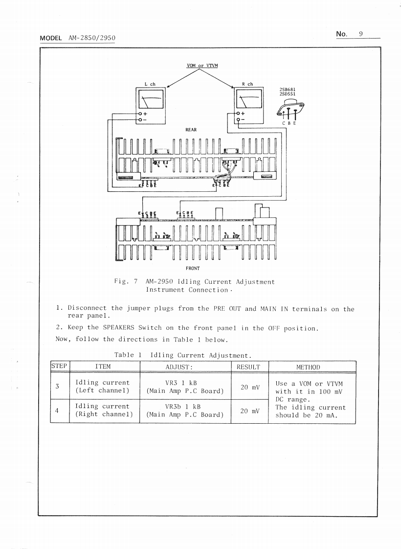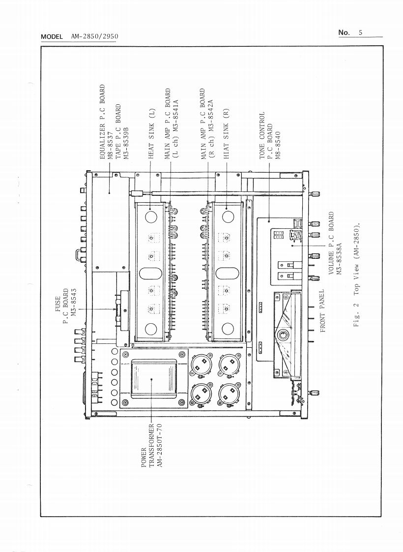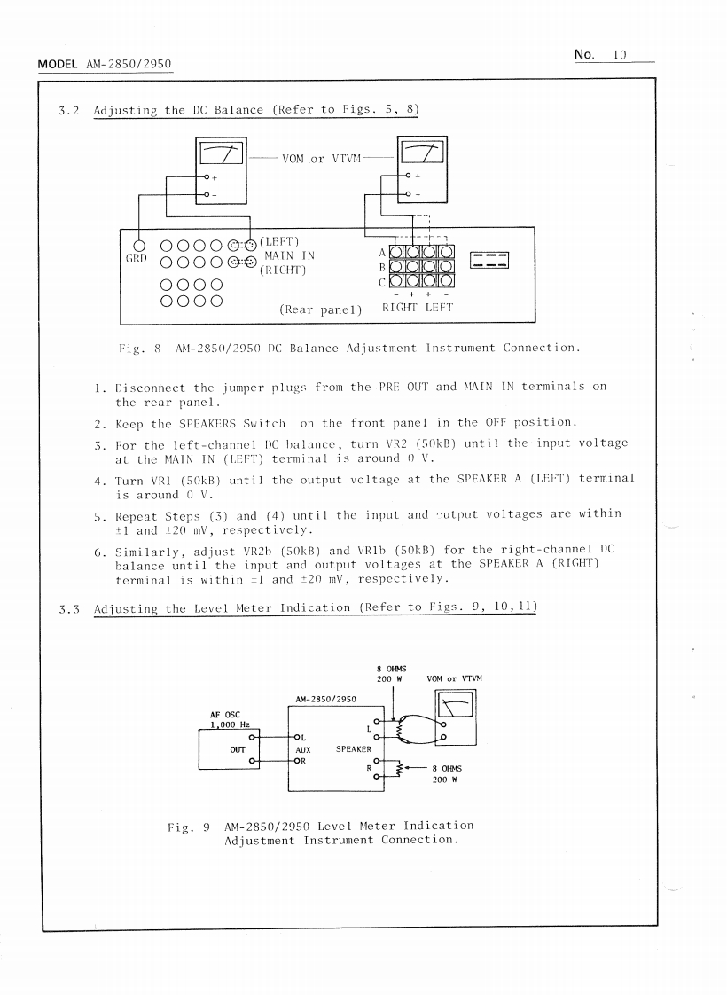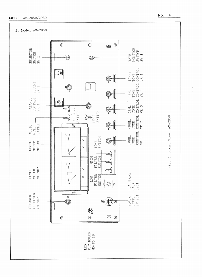AKAINo.1PRELIMINARY SERVICE MANUALM0 DEL AM-2850/2950DATE January,1979I.TECHNICAL DATA1.Mode1 AM-2850POWER AMPLIFIER SECTIONRated Output Power2-Channels Driven95 watts per channel,minimum RMS,at 4 ohmsfrom 20 to 20,000 Hz with no more than 0.08%total harmonic distortion.85 watts per channel,minimum RMS,at 8 ohmsfrom 20 to 20,000 Hz with no more than 0.08%total harmonic distortion.2 x 140 watts into 8 ohms at I kHz,with nomore than 0.08%total harmonic distortion.2 x 100 watts into 8 ohms at 1 kHz,with nomore than 0.08%total harmonic distortion.Frequency ResponseMain in:DC to 100kHz +0dB,-0.5dBPower Bandwidth (IHF)10 Hz to 40 kHz/8 ohms(Total Harmonic Distortion:0.08%)Signal to Noise Ratio (IHF)PHONOBetter than 75 dBAUXBetter than 95 dBResidual NoiseLess than 0.3 mV at 8 ohmsChannel Separation (IHF)PHONOBetter than 50 dB at lkHzDamping FactorMore than 50 (1 kHz,8 ohms)Output SpeakersA,B,C (4 to 16 ohms)/A+B,A+C,B+C (8 to 16 ohms)Headphone4 to 16 ohmsPRE AMPLIFIER SECTIONInput Sentivity/ImpedancePHONOPHONO 1:3mV/33/47/100 kohms,PHONO 2:3mV/47 kohmsAUX150 mV/100 kohmsTUNER150 mV/100 kohmsTAPE MONITORPIN:150 mV/100 kohms,DIN:30 mV/100 kohmsMAIN INPIN:1V/47 kohmsOutput Level/ImpedanceTAPE RECPIN:150 mV/1 kohms,DIN:150 mV/30 kohmsPRE OUTPUT1V/47 kohmsFrequency ResponsePHONO (RIAA equalization)30 Hz to 15 kHz +0 dB,-1 dBAUX,TAPE MONITOR3 Hz to 60 kHz +0 dB,-1 dBTone ControlBASS±9dBat100HzMID RANGE±10dBat1kHzTREBLE±9dBat10kHzLoudness Control+10 dB at 100 Hz,+6 dB at 10 kHz(Volume control set at -30 dB position)FilterHIGH-6 dB at 10 kHzLOW-6 dB at 30 HzAKAI ELECTRIC CO.,LTD.(P.O.BOX 21,Tokyo Airport,Japan)12-14,2.chome,Higashi-Kojiya,Ohta-ku,Tokyo,JapanPrinted in Japan