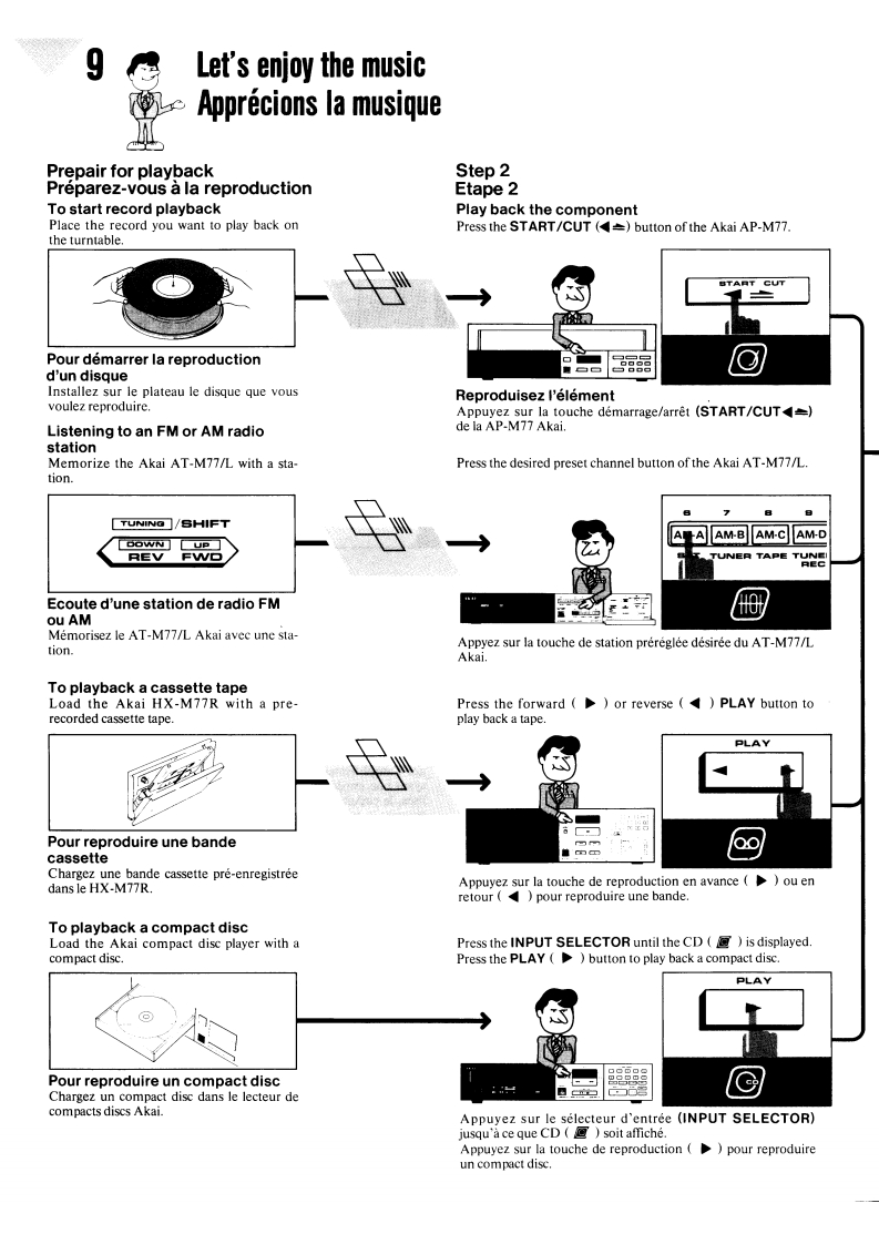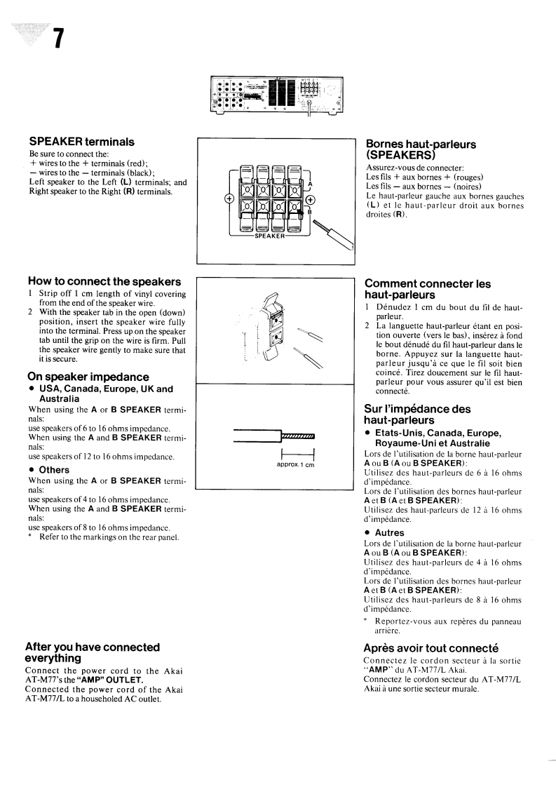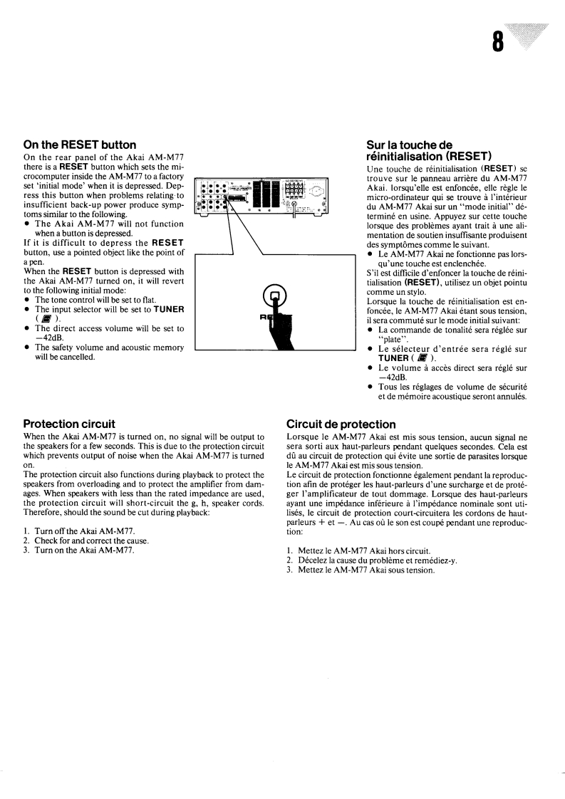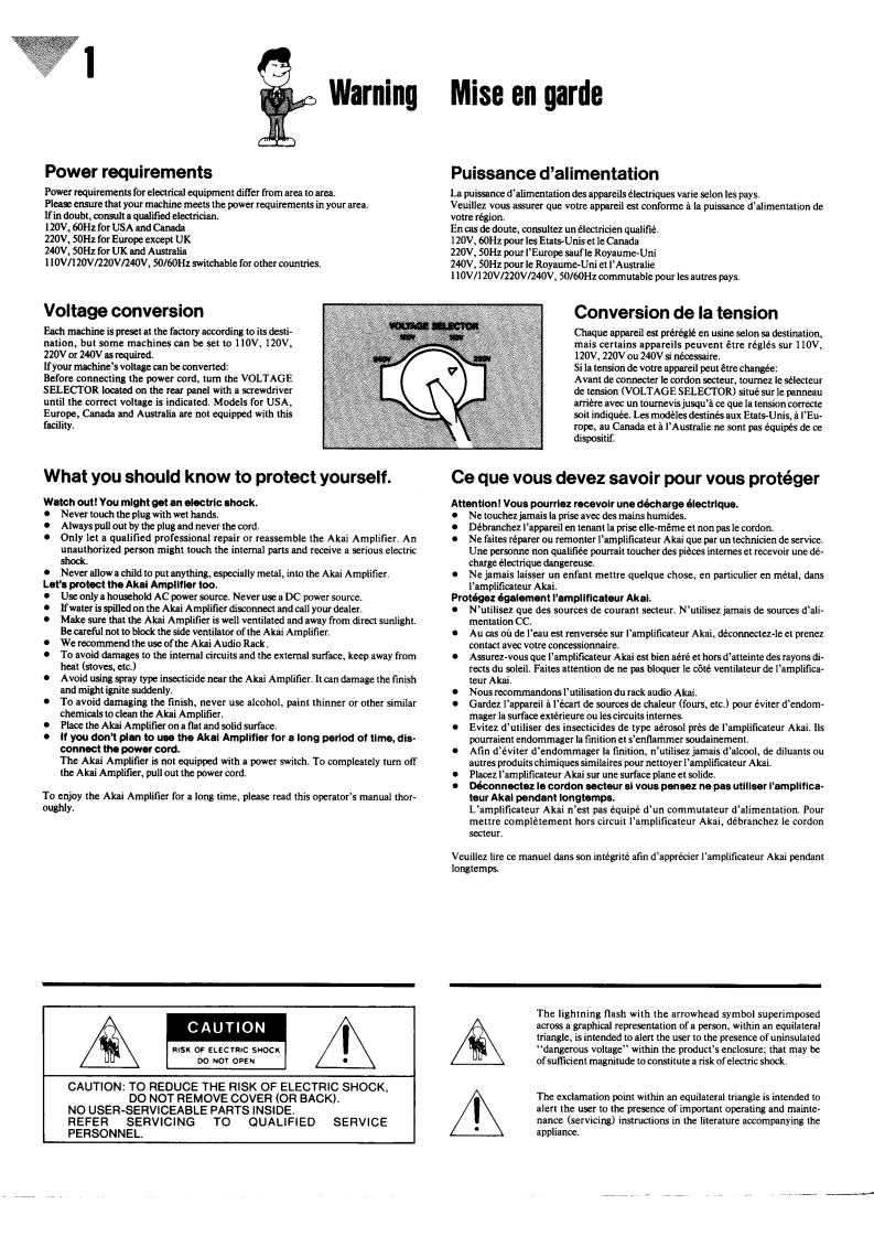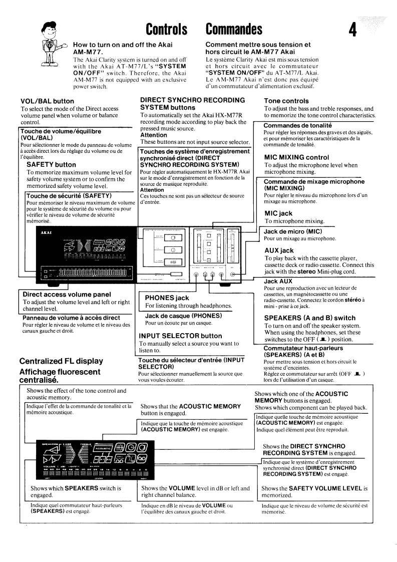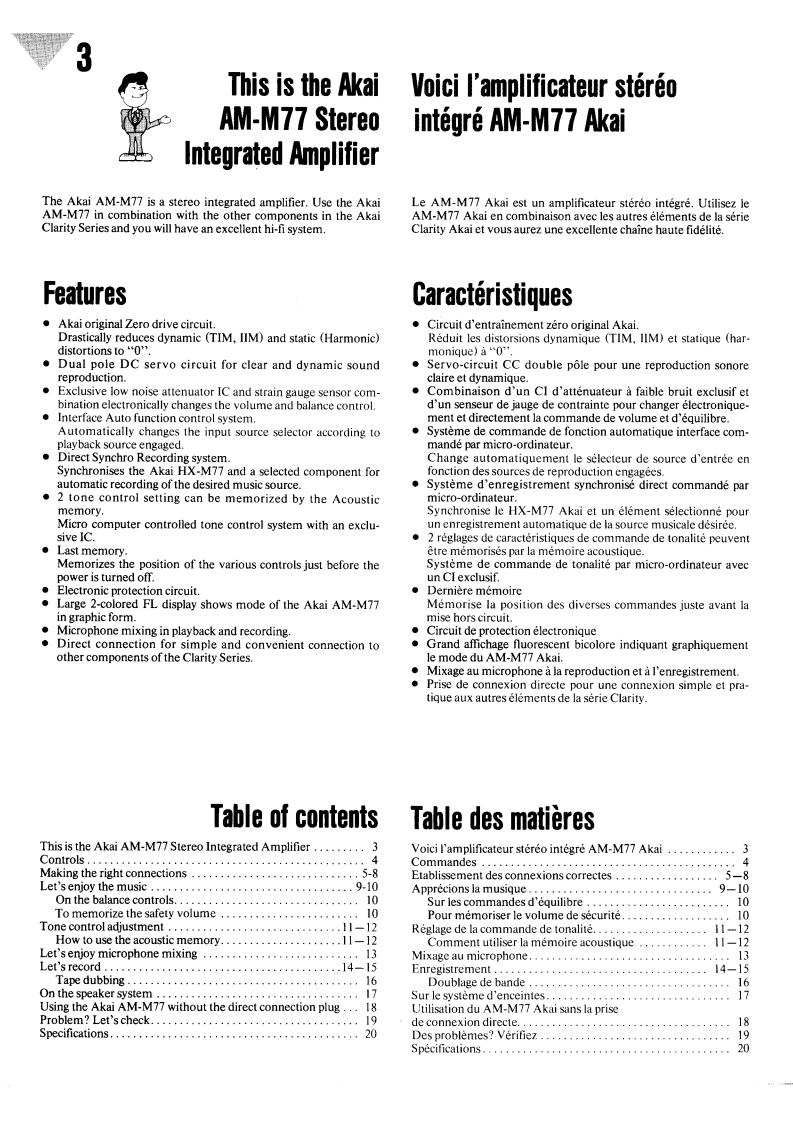 AKAIHi-Fi Video.Stereo Integrated AmplifierAM-M77AKAIe©OWARNINGOperator's Manual......Poe1-20To prevent fire or shock hazard,do not expose this applianceto rain or moisture.Manuel de l'utilisateur ..Po01-20Gebruiksaanwijzingen ..Bd21-40ATTENTIONBruksanvisning.........sid.21-40Pour eviter tout risque d'incendie ou de decharge electrique,Bedienungsanleitung ..soite 41-60ne pas exposer cet appareil aux intemperies ou a l'humidite.Manual del usuario ....Pi41-60