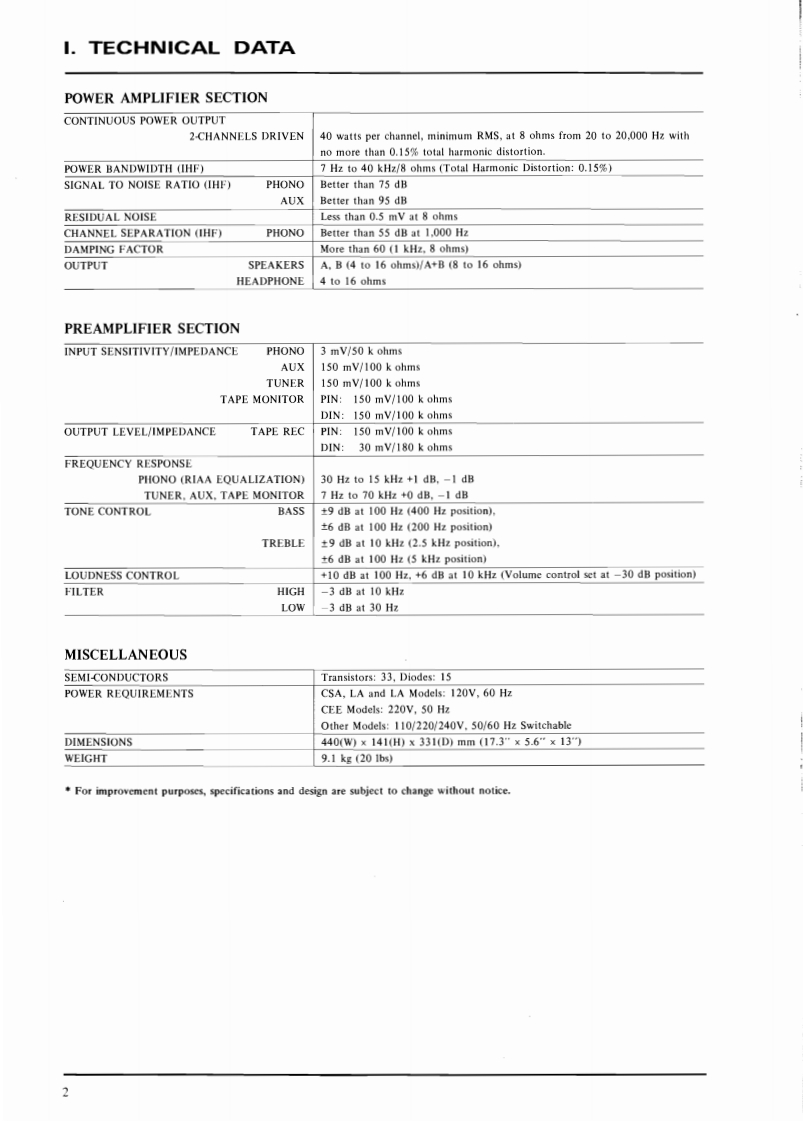 SECTION 1SERVICE MANUALTABLE OF CONTENTSI.TECHNICAL DATA·2II.DISMANTLING OF UNIT .......................................3Π.C0NTR0LS.…4IV.PRINCIPAL PARTS LOCATION...................................5V.LEVEL DIAGRAM..............................................6VI.MAIN AMPLIFIER ADJUSTMENT.................................7VII.CLASSIFICATION OF VARIOUS P.C BOARDS......................81.RELATION OF P.C BOARD TITLE AND IDENTIFICATION NUMBER.82.COMPOSITION OF VARIOUS P.C BOARDS.......................For basic adjustments.measuring methods,and operating principles,refer to GENERAL OPERATINGPRINCIPLES AND ADJUSTMENTS.1