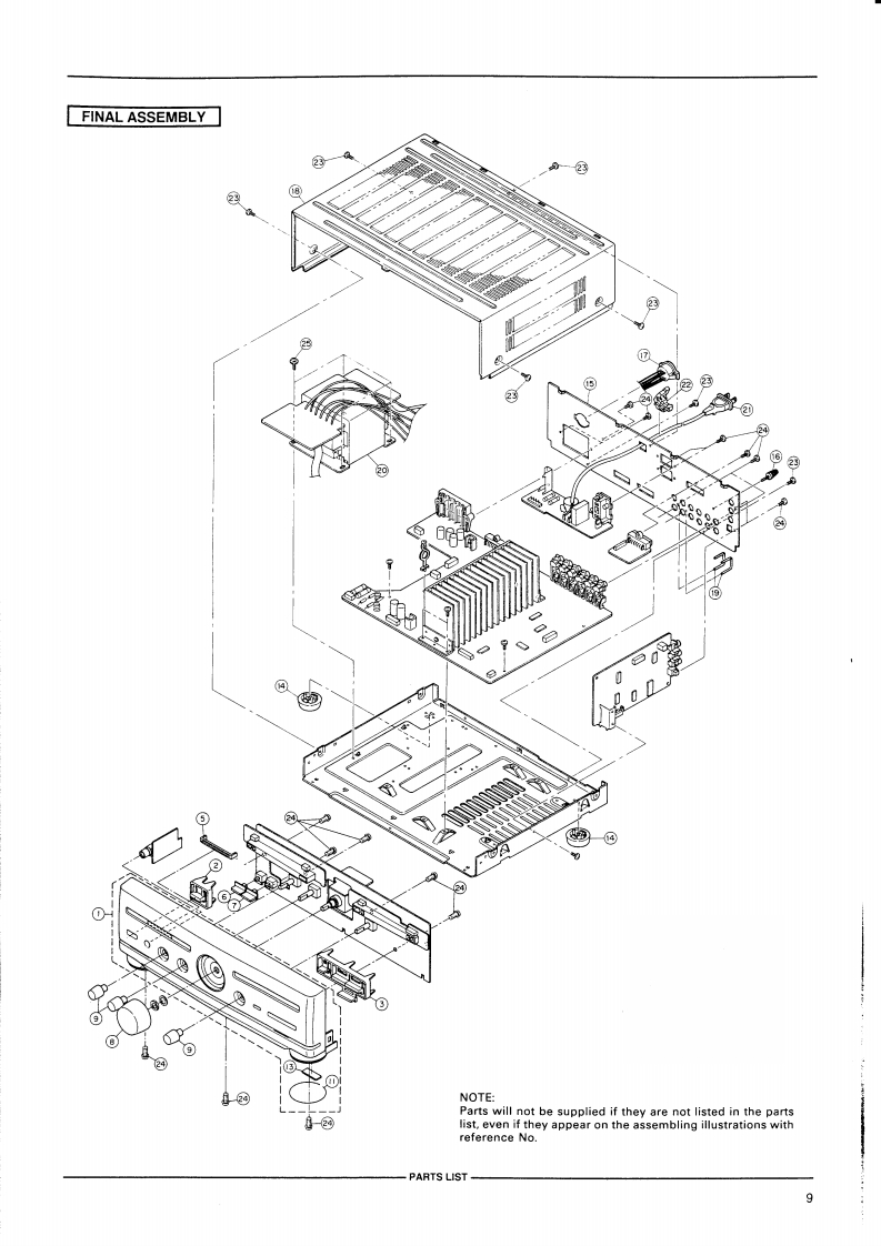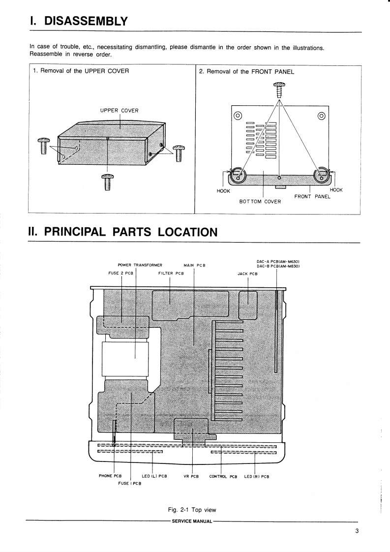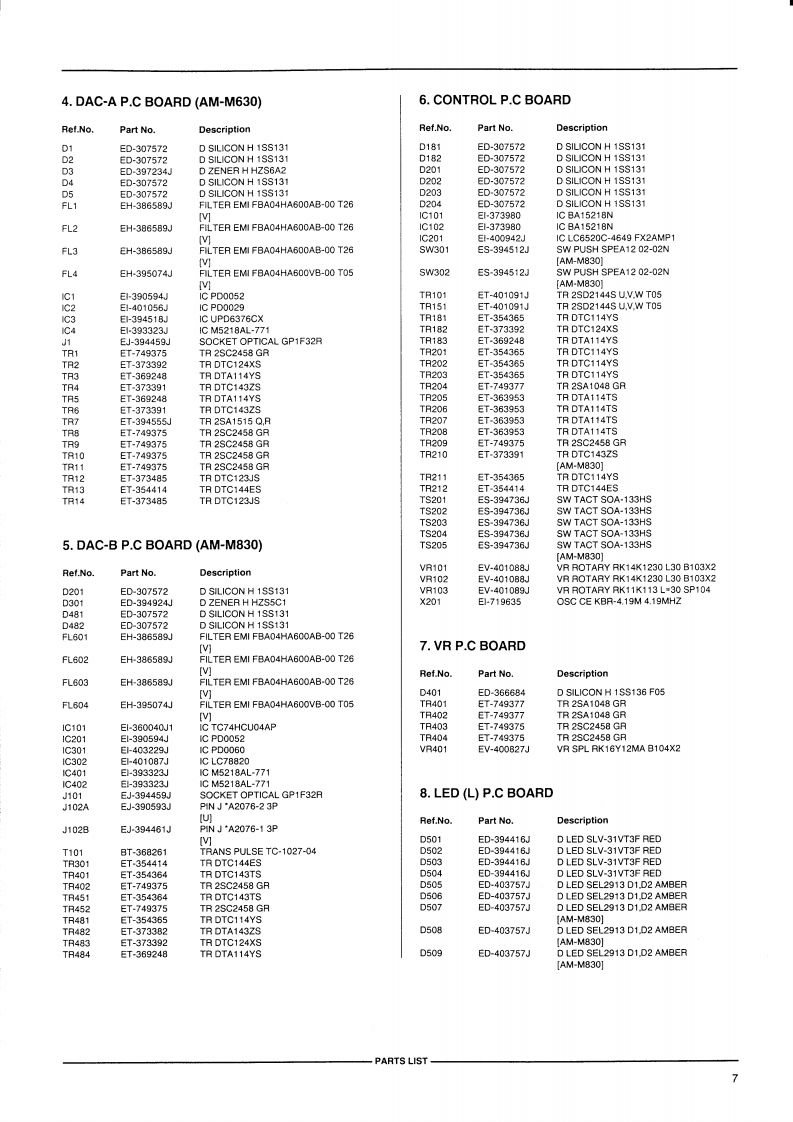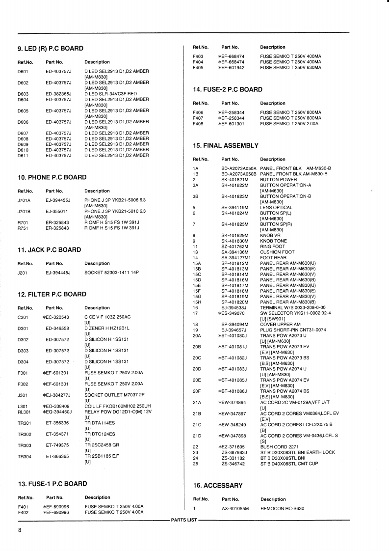 AKAI SERVICE MANUALAKAI声程nha非m#:2LMODEL AM-M830DIGITAL INTEGRATED AMPLIFIERMODELAM-M630MODELAM-M830SPECIFICATIONSAM-M830AM-M630Power outputFTC54 W x 2 (6 ohms,40 Hz to 20 kHz,THD 0.5%)42 W x 2 (6 ohms,40 Hz to 20 kHz,THD 0.5%)DIN63W×2(6ohms)EIAJ50w×26 ohms)480Wx2(6ohm5)65 Wx 2 (6 ohms)Music.300WPMPO220W900W750WPower bandwidth10 Hz to 50 kHz (THD 0.1%)10 Hz to 50 kHz (THD 0.1%)Total harmonic distortion0.06%(1kHz)0.06%(1kHz)Phono max.input level55 mV (1kHz)55 mV (1 kHz)Frequency response...10 Hz to 100 kHz (-1.5 dB,-6.0 dB)10 Hz to 100 kHz (-1.5 dB,-6.0 dB)Tone controlTreble..±8.0dBt10kHz1±8.0dB(10kz)Bass士8.0dB(100Hz)®8.0de(100HzS/N ratio (IHF-A)PHONO (MM)73d872d8Others....4.88dB87 d8Residual noise0.5mv0.5mvChannel dB (1 kHz)60 dB (1 kHz)Damping factor.....19.320Required speaker impedanceAor B..6 to 16 ohms6 to 16 ohmsA and B.12 to 16 ohmsInput sensitivity impedancePHONO (MM)2 mV /47 kohms2 mV /47 kohmsVCR,etc..270 mV/47 kohms180 mV/47 kohmsOutput level impedance....270 mV /1 kohms180 mV /1 kohmsDAC section]Sampling frequency32/44.1/48kHz44.1 KHzDigital filter8fs /18 bit4 1s /16bitD A converter.....18 bit /2 DAC16 bit /2 DACDigital input level impedanceOPTICAL-14to-23d8m-14o-23dBmCOAXIAL…0.5Vp-p/75 ohmsFrequency response20Hto20kHz±0.5dB20Hzto20kHz±0.5dBDynamic range ......95 dB93 dBTotal harmonic distortion0.07%(1 kHz,20 kHz LPF)0.04%(1 kHz,20 kHz LPF)Power requirements ......AC 220 V-230 V,50 Hz for Europe except UKAC 220 V-230 V,50 Hz for Europe except UKAC 240 V.50Hz for UK and AustraliaAC 240 V,50Hz for UK and AustraliaAC 110 /120 /220 /240 V,50/60 Hz convertible forAC 110 /120/220/240 V,50 60 Hz convertible forother countries.other countries360WM×117(H×310D)mm360(W0×117Hx310D)mm…6.4kg6.3kgStandard accessoriesRemote control unit (RC-S600)....1Operator's manual....1For improvement purposes.specifications and design are subject to change without notice.