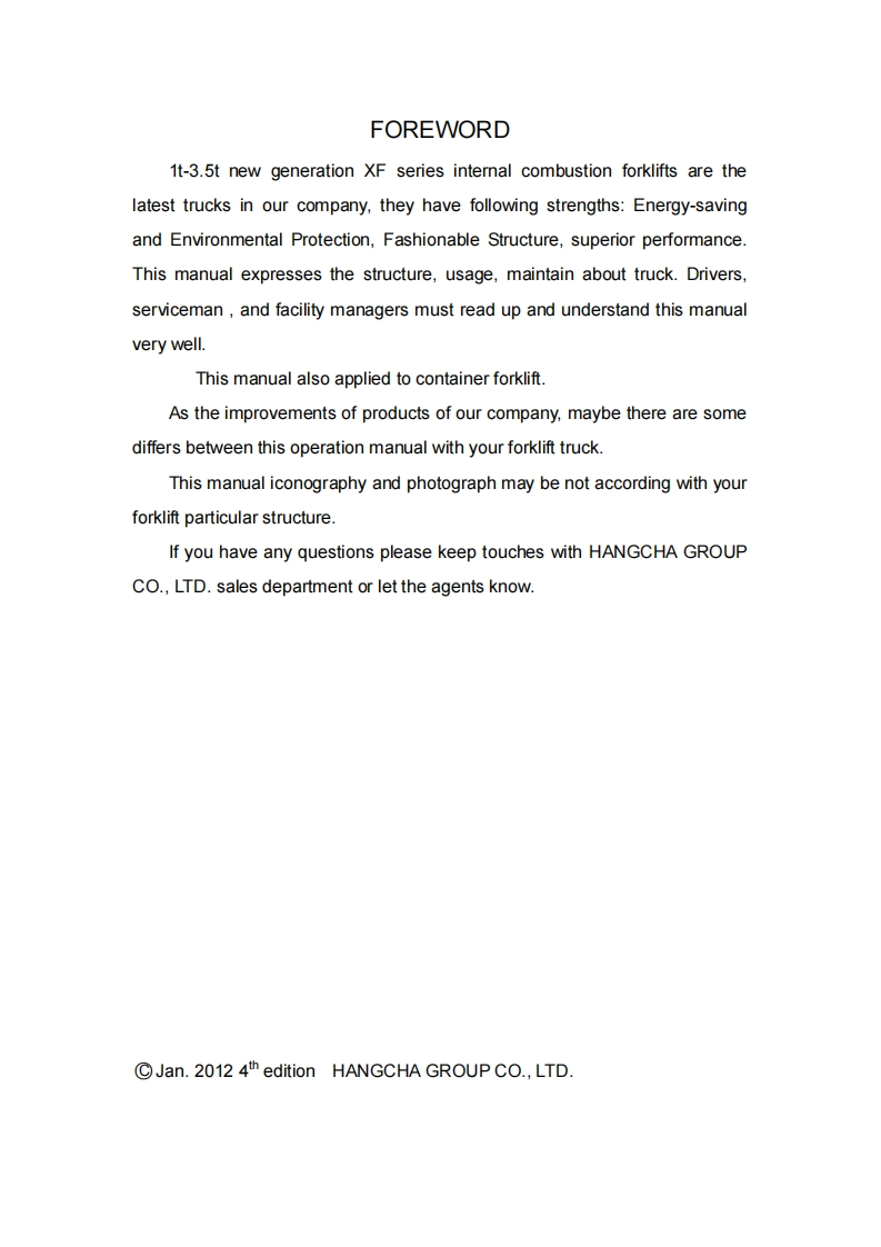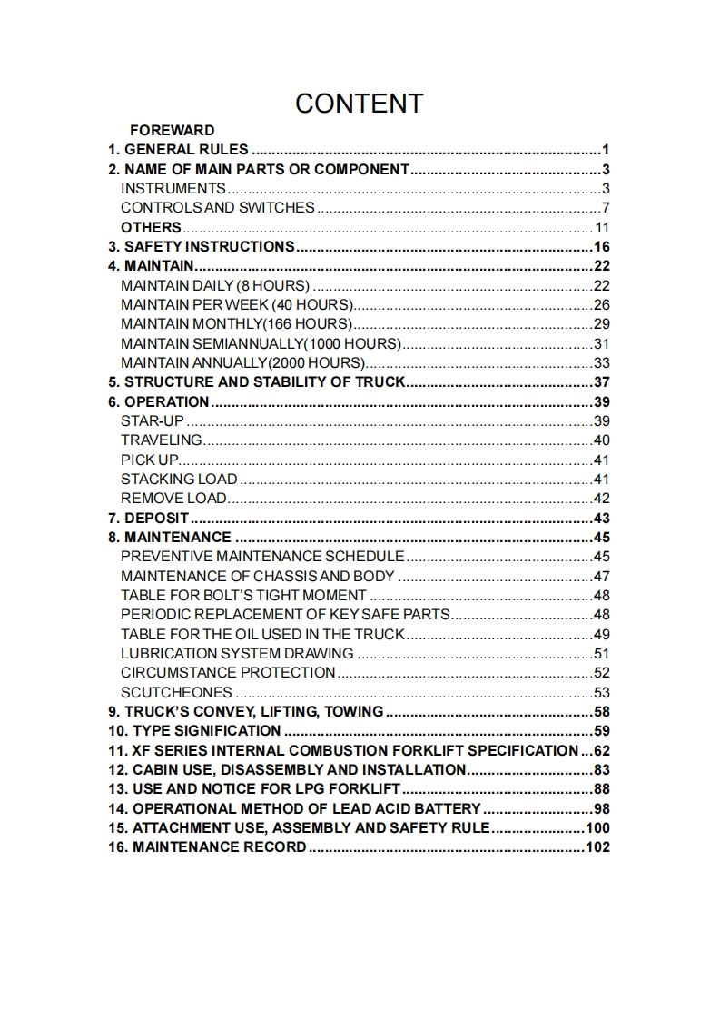 杭州叉车1t~3.5t-XF-驾驶与保养手册series-Internal-Combustion-Counterbalanced找手册网10小时前发布关注私信2.80MB106页036杭州叉车1t~3.5t-XF-驾驶与保养手册series-Internal-Combustion-Counterbalanced此内容为付费资源,请付费后查看¥29¥31黄金会员免费钻石会员免费立即购买您当前未登录!建议登陆后购买,可保存购买订单付费资源 第1页 / 共106页 第2页 / 共106页 第3页 / 共106页 第4页 / 共106页 第5页 / 共106页 第6页 / 共106页 第7页 / 共106页 第8页 / 共106页 第9页 / 共106页 第10页 / 共106页 试读已结束,还剩96页,您可下载完整版后进行离线阅读 THE END杭州叉车 文本预览 1t~3.5t XF series Internal Combustion CounterbalancedForklift TruckOPERATION AND MAINTENANCEMANUALHANGCHA GROUP CO.,LTD.July 2012 4th EDITION 查看更多 收起部分 喜欢就支持一下吧收藏