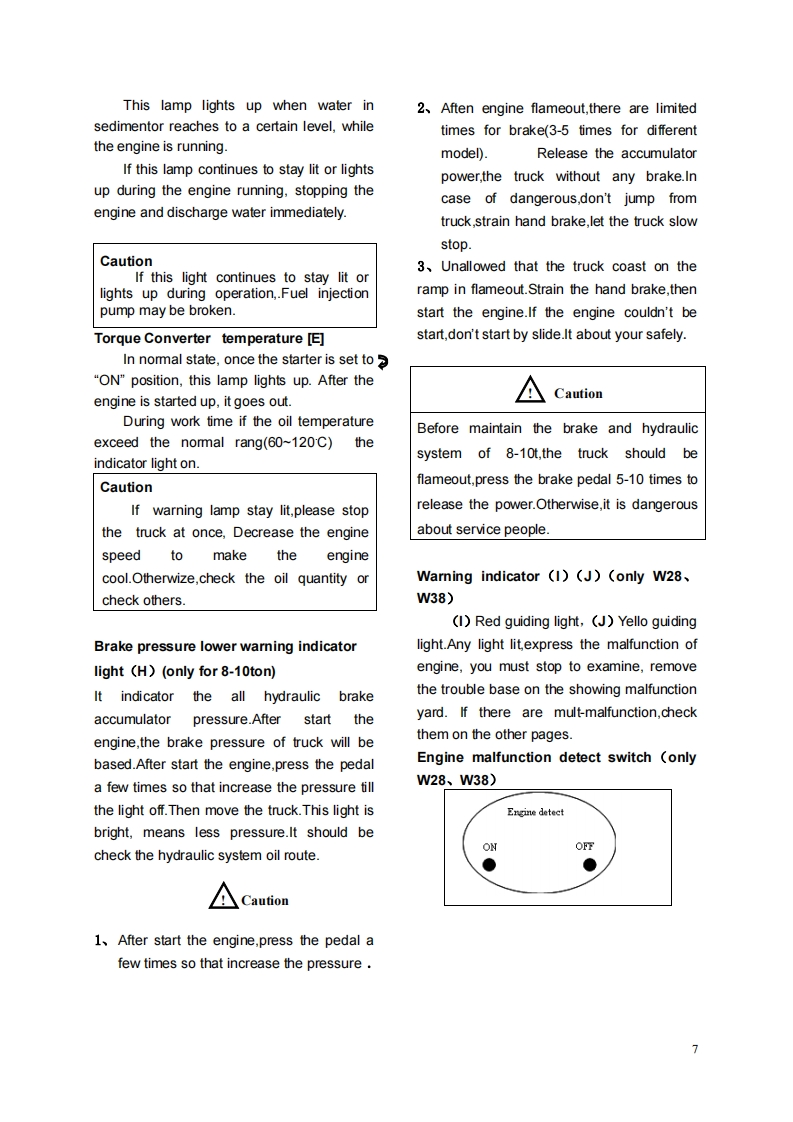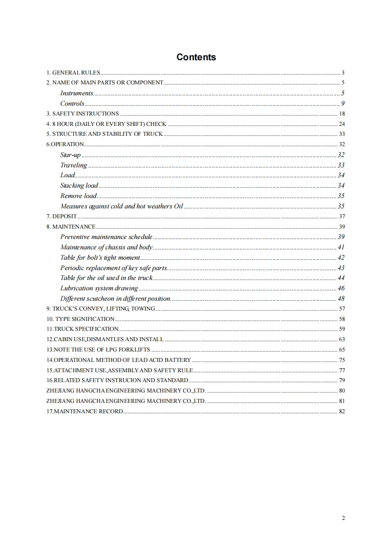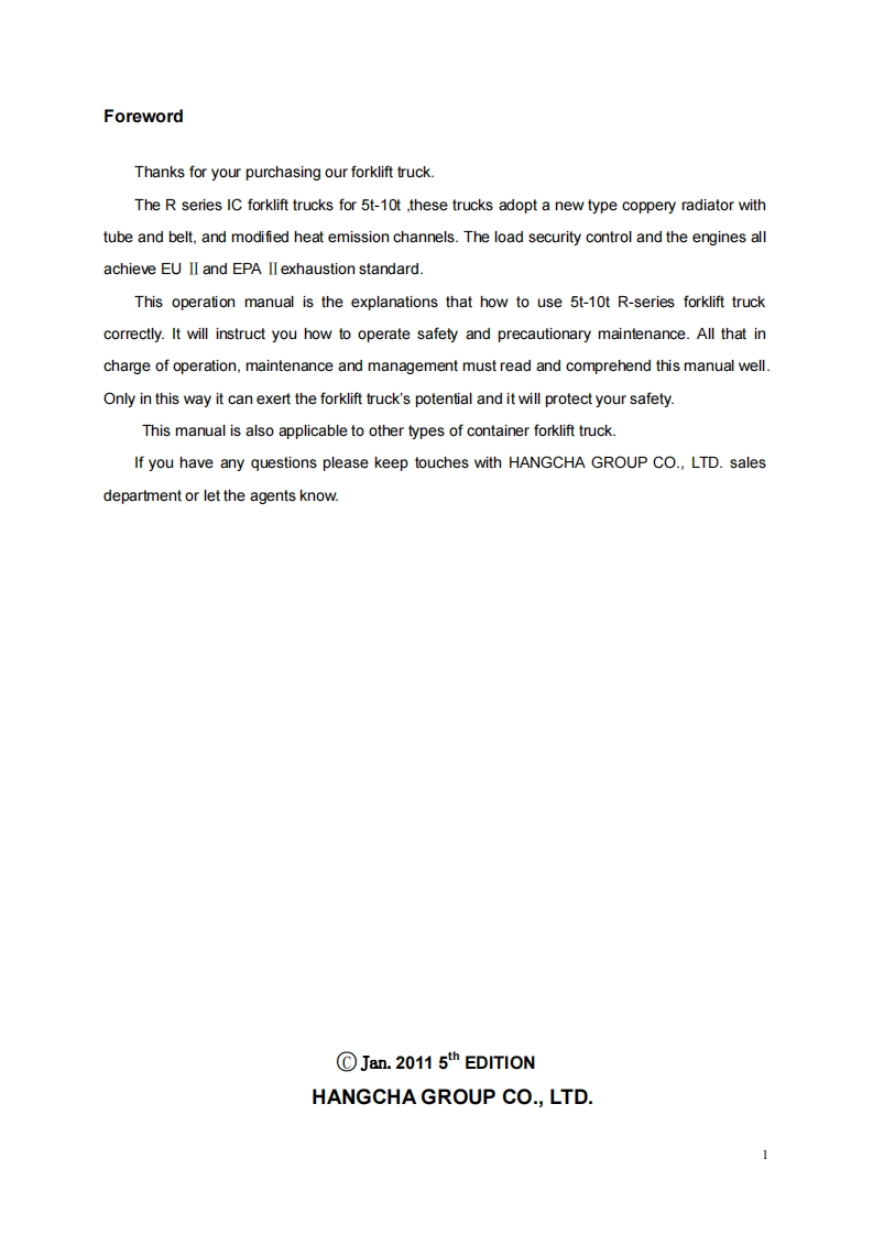 C>HANGCHA5t-10t R SeriesInternal Combustion Counterbanlance Forklift TruckOPERATION AND MAINTENANCE MANUALCPCD50/60/70/80/100-RW28CPYD50/60/70-RW17(CPQD50/60/70-RW17-Y)CPCD50/60/70-RW38(∈Original InstructionHANGCHA GROUP CO.,LTD.Jan.2011 5th EDITION