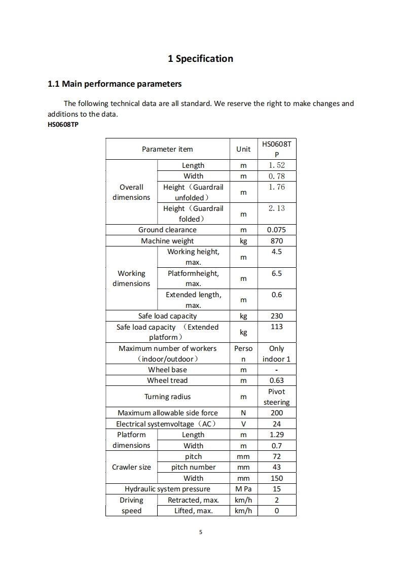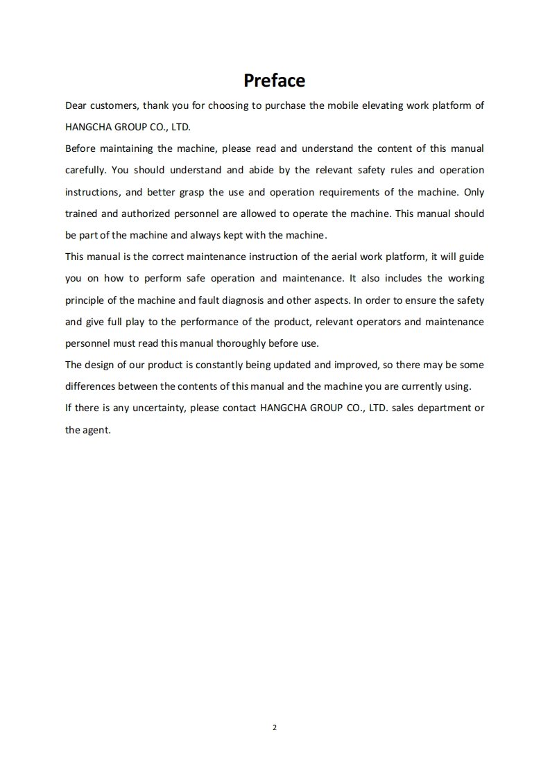 杭州叉车EN_Mobile-elevating-work-platform-HS0608TP操作与维修维护手册找手册网10小时前发布关注私信1.63MB65页043杭州叉车EN_Mobile-elevating-work-platform-HS0608TP操作与维修维护手册此内容为付费资源,请付费后查看¥29¥31黄金会员免费钻石会员免费立即购买您当前未登录!建议登陆后购买,可保存购买订单付费资源 第1页 / 共65页 第2页 / 共65页 第3页 / 共65页 第4页 / 共65页 第5页 / 共65页 第6页 / 共65页 第7页 / 共65页 第8页 / 共65页 第9页 / 共65页 第10页 / 共65页 试读已结束,还剩55页,您可下载完整版后进行离线阅读 THE END杭州叉车 文本预览 <2HS0608TPMobile elevating workplatformMaintenance ManualHANGCHA GROUP CO.,LTD.February,2024 查看更多 收起部分 喜欢就支持一下吧收藏