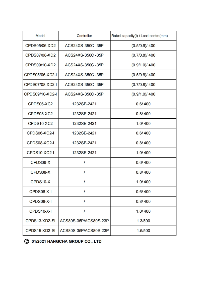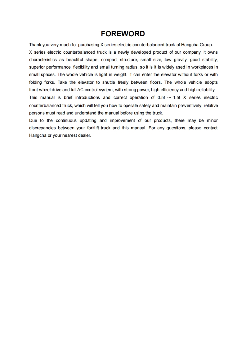 X SeriesX Series three-wheel Electric Counterbalanced ForkliftCPDS05/06/07/08/09/10-XD2CPDS05/06/07/08/09/10-XD2-lCPDS06/08/10-XC2CPDS06/08/10-XC2-lCPDS06/08/10-XCPDS06/08/10-X-ICPDS13/15-XD2-SIOPERATION ANDMAINTENANCE MANUALHANGCHA GROUP CO.,LTD.01/2021