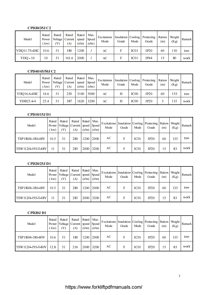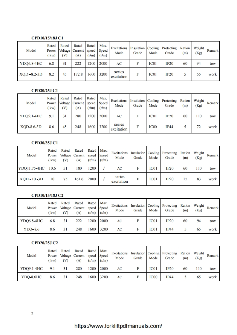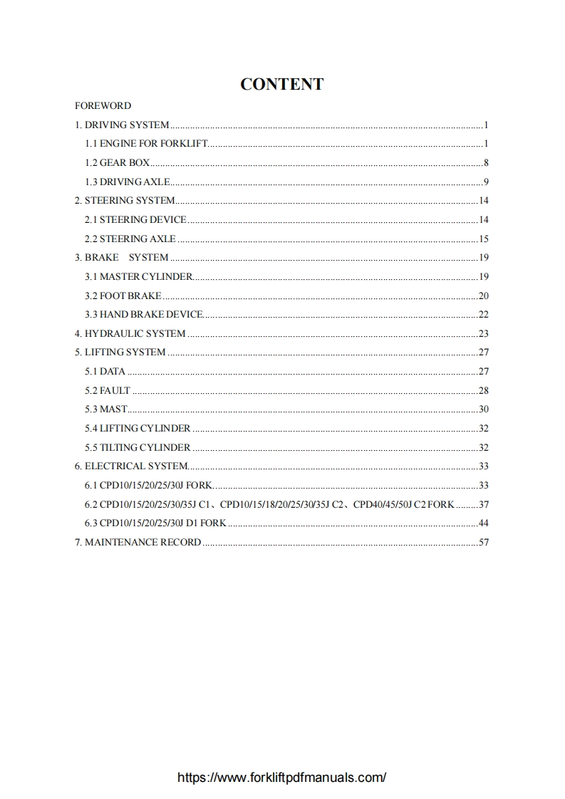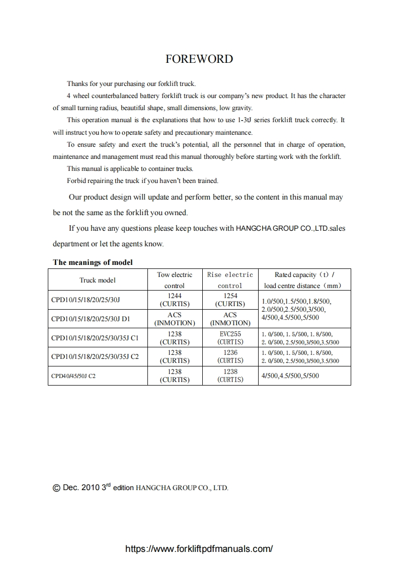 C-HANGCHACPD10/15/18/20/25/30JCPD10/15/18/20/25/30JD1CPD10/15/18/20/25/30/35JC1CPD10/15/18/20/25/30/35JC2CPD40/45/50JD1CPD40/45/50JC21~5t J Series Counterbalanced Battery Forklift TruckSERVICE MANUALOriginal InstructionHANGCHA GROUP CO.,LTD.Dec.2010 3d editionhttps://www.forkliftpdfmanuals.com/