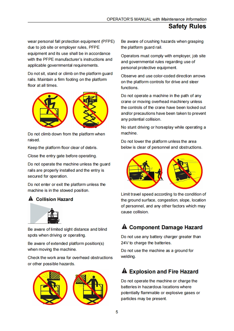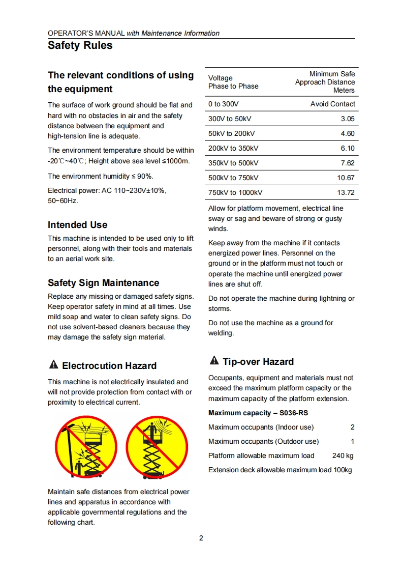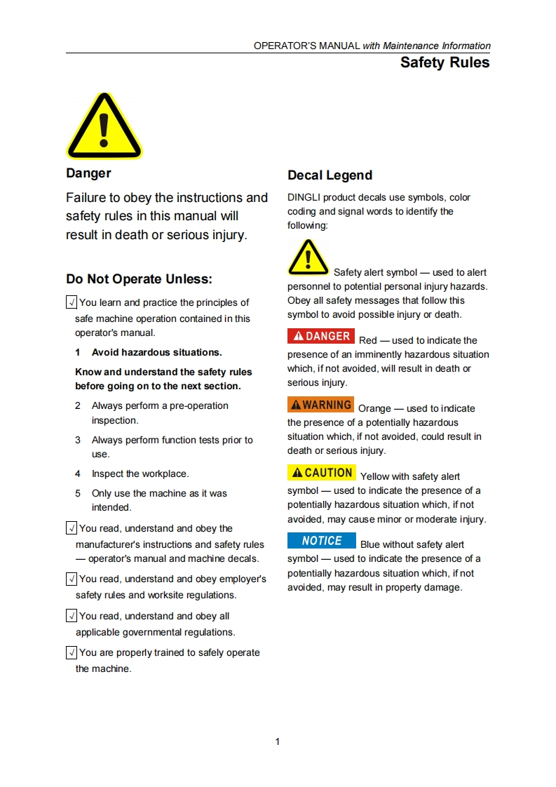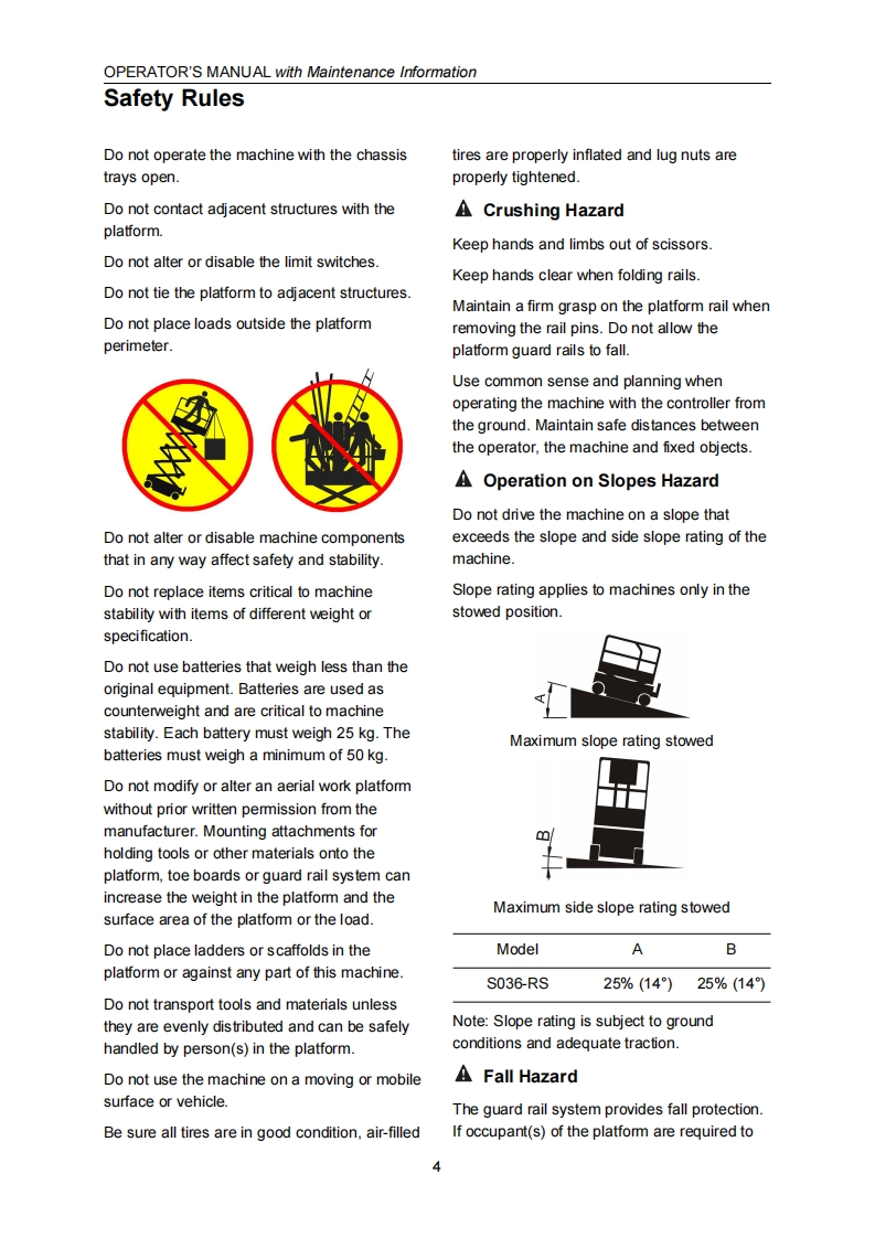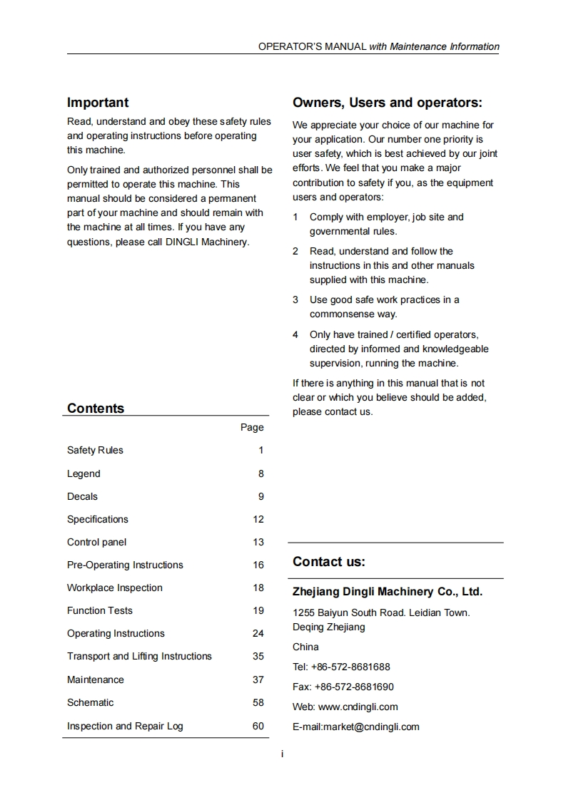 SELF-PROPELLED SCISSOR LIFTSOPERATOR'S MANUALwith Maintenance Information(For S036-RS)△1四WARNINGTHE MANU FACTURER SHALL NOT BE HELD LIABLE IN CASE OF FAULTSOR ACCIDENTS DUE TO NEGLIGENCE,INCAPACITY,INSTALLATION BYUNQUALIFIED TECHNICIANS AND IMPROPER USE OF THE MACHINEDO NOT OPERATE THIS MAC HINE UNTIL YOU READ AND UNDERSTANDALL THE DANGERS,WARNINGS AND CAUTIONS IN THIS MANUALPart Number:SM0115111A_Rev3.0C€Zhejiang Dingli Machinery Co.,Ltd.Third Edition,March 2021 Printing