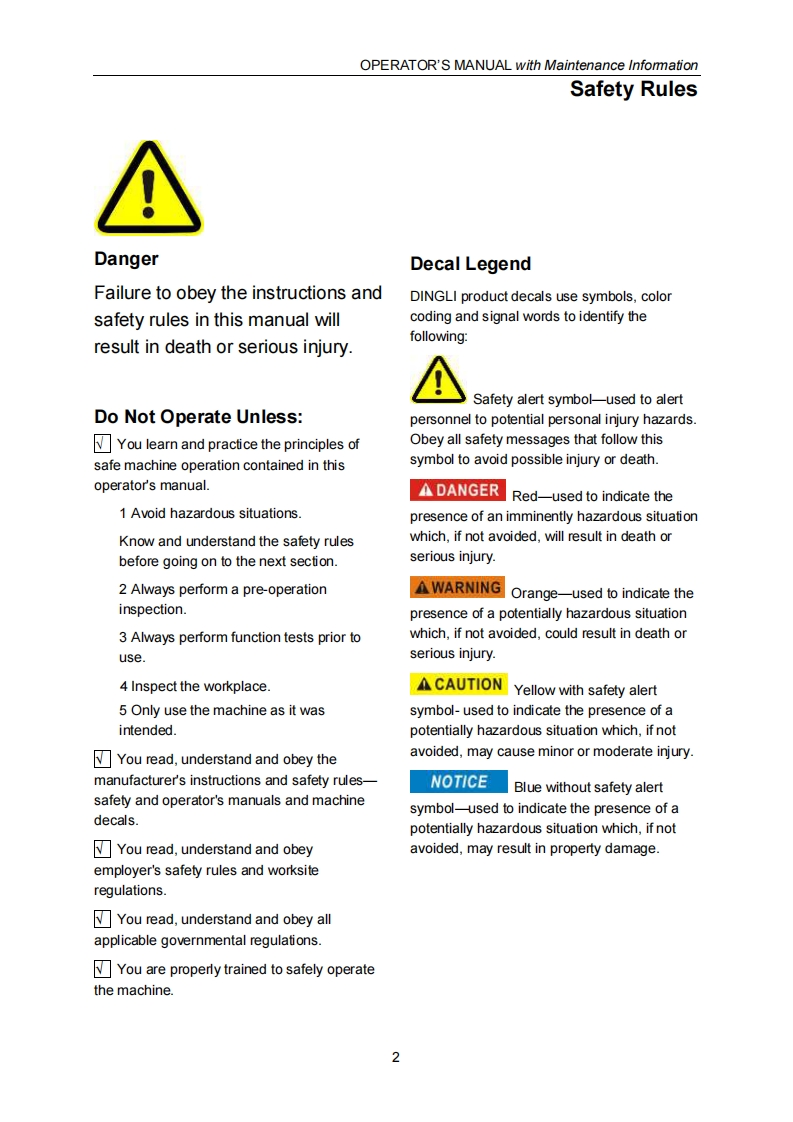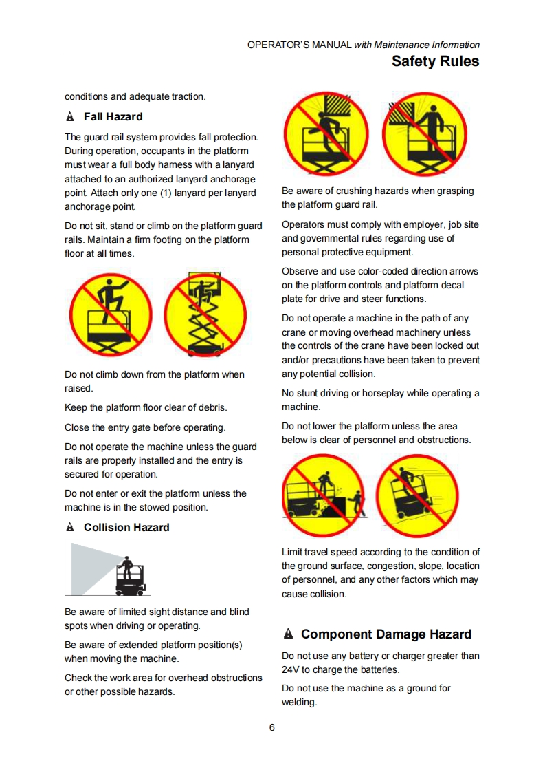 SELF-PROPELLED SCISSOR LIFTSOPERATOR'S MANUALwith Maintenance InformationS06-E/S06-EC(Series 3)E-Tech S06-EA1mWARNINGTHE MANU FACTURER SHALL NOT BE HELD LIABLE IN CASE OF FAULTSOR ACC IDEN TS DUE TO NEGLIGENCE,INCAPACITY,INSTALLATION BYUNQUALIFIED TECH NICIANS AN D IMPROPER USE OF THE MACHINEDO NOT OPERATE THIS MACH INE UNTIL YOU READ AND UNDERSTANDALL THE DAN GERS,W ARNIN GS AND CAUTIONS IN THIS MANUALPart Number:SM0110113Zhejiang Dingli machinery Co.,Ltd.2013-08