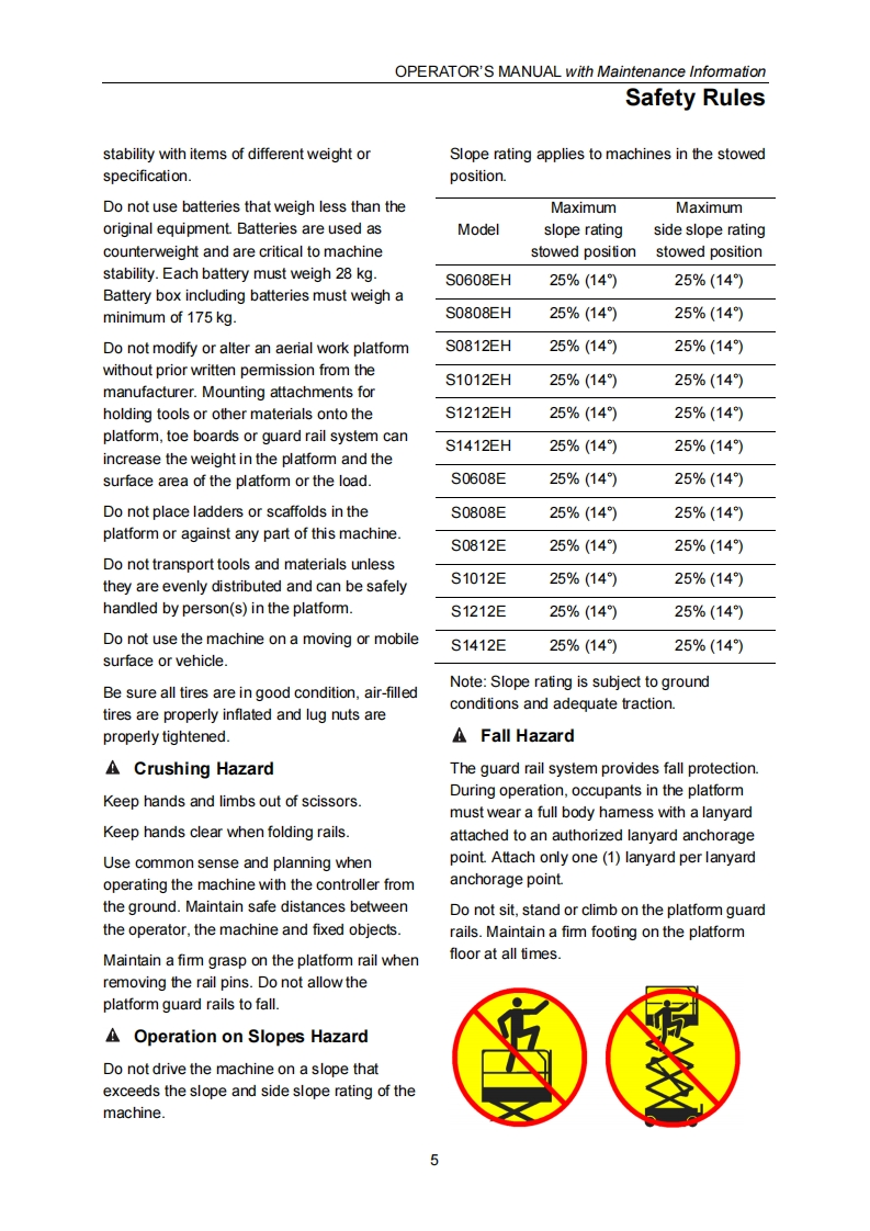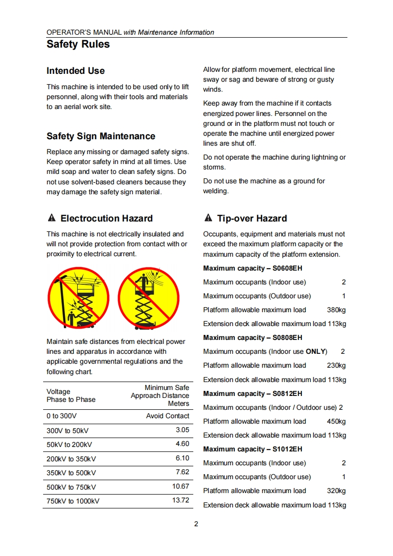 SELF-PROPELLED SCISSOR LIFTSOPERATOR'S MANUALwith Maintenance InformationFor S0608EH,S0808EH,S0812EH,S1012EH,S1212EH,S1412EH(ForS0608E,S0808E,S0812E,S1012E,S1212E,S1412E)Hydraulic Motor DC Motor Drive(Series 3)mWARNINGTHE MANUFACTURER SHALL NOT BE HELD LIABLE IN CASE OF FAULTSOR ACCIDENTS DUE TO NEGLIGENCE,INCAPACITY,INSTALLATIONBYUNQUALIFIED TECHNICIANS AND IMPROPERUSE OF THE MACHINEDO NOT OPERATE THIS MACHINE UNTIL YOUREAD ANDUNDERSTANDALL THE DANGERS,WARNINGS AND CAUTIONS IN THIS MANUALPart Number:SM0110111ACEZhejiang Dingli Machinery Co.,LtdSecondEdition,Jun 2015 Printing
