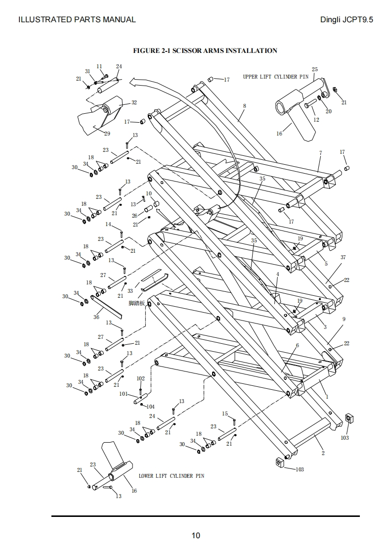 INSTANT品PARTS MANUALJCPT9.5ELECTRIC SCISSOR LIFT△仰WARNINGTHE MANUFACTURER SHALL NOT BE HELD LIABLE IN CASE OF FAULTSOR ACCIDENTS DUE TO NEGLIGENCE,INCAPACITY,INSTALLATION BYUNQ UALIFIED TECHNICIANS AND IMPROPER USE OF THE MACHINEDO NOT OPERATE THIS MACHINE UNTIL YOU READ AND UNDERSTANDALL THE DANGERS,WARNINGS AND CAUTIONS IN THIS MANUAL