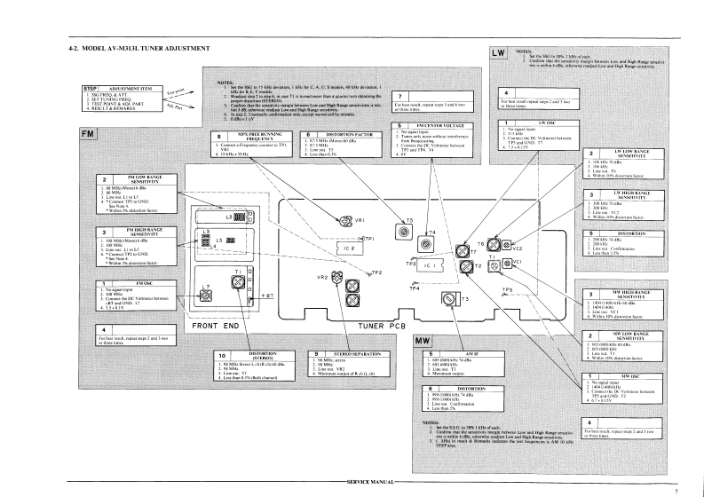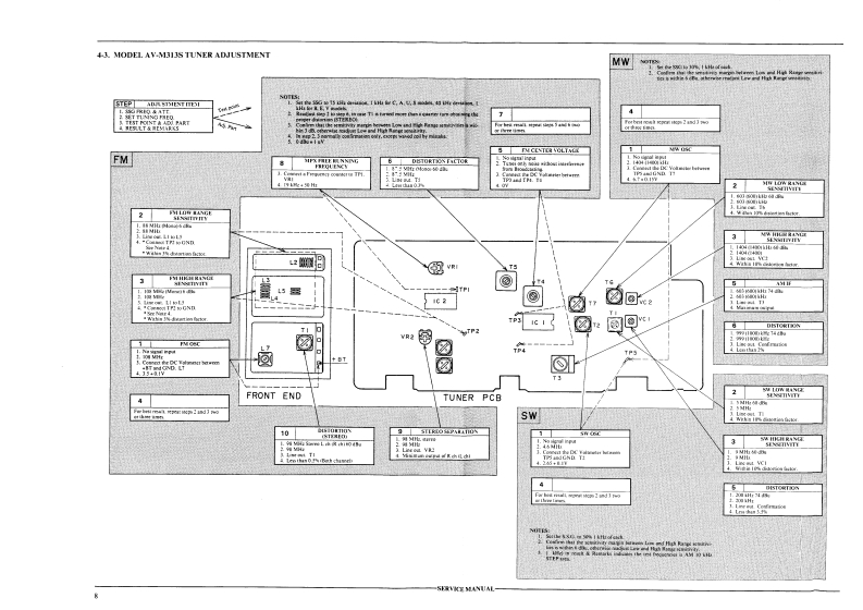 AKAI SERVICE MAnUAL期9MD画回回回旧888三AVAKAIAV CONTROL CENTERMODELAV-M313L/SSPECIFICATIONSAmplifier sectionAMMWLWPower output.........40w+40w0.2%T.H.D.8ohms)Frequency Range.....531 kHz to144 kHz to4.6 NHz toDIN.444444444446W+46W1602kHz9k)351 kHz9.8HzFrench Norn.......45w+45W530 kHz toFrequency Response........5 Hz to 80 kHz 3dB1600kHz(10k)Equalizer..=8 dB (63 Hz,250 Hz,I kHz,4 kHz,16kHz)Usable Sensitivity.......300 uV/m1000uV/m300V/mInput Impedance..............47 kohmsSelectivity ...20 dB25 dB35d(Phono/Aux/Tape/VCR/V.Disc/Mic)Image Rejection Ratio.....45 dB35 dB25dInput Sensitvity......150mvIF Rejection Ratio.......35dB35 dB30d(Phono/Aux/Tape/VCR/V.Disc)S/N Ratio..35 dB35 dB35d0.7 mV MicPower Requirements........120V,60 Hz for USA Canada220V,50 Hz for Europe,except UKS/N Ratio (IHF-A)240V.50 Hz for UK AustraliaPhono/Aux Tape/110V/120V/240V,50 Hz/60 Hz convrtibleVCR/V.Dig.80dBfor other countriesMic..63dBDimensions.350(wWx160H×325(D)mmSpeaker8 to 16 ohms Surround and Main13.7w)×6.3H×12.8 inchesWeight...7.3kg16.1bsTuner sectioFMRC-M313 Remote ControlFrequency Range .............87.5 to 108 MHzSvstem....Infrared PCMUsable Senstivity.....2.7 dBf(1.2mV/75 ohms)Carrying Frequency.........38 kHz+0.2 kHzS/N ratio Mono/Stereo.....65 dB Mono/60 dB StereoMax.Operation distance..up to 8mSelectivity,…60 dBDirectivity..±30mage Rejedion Ratio......50 dBBatteries.....21.5 V(R6.AA.UM-3)IF Rejection Ratio.........80 dBCapture Rato........2.0 dBSterco Sepantion.........40 dB*For improvement purposes,specifications and design are subject to change without notice.