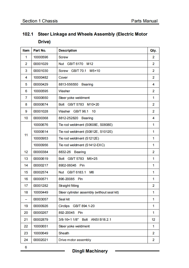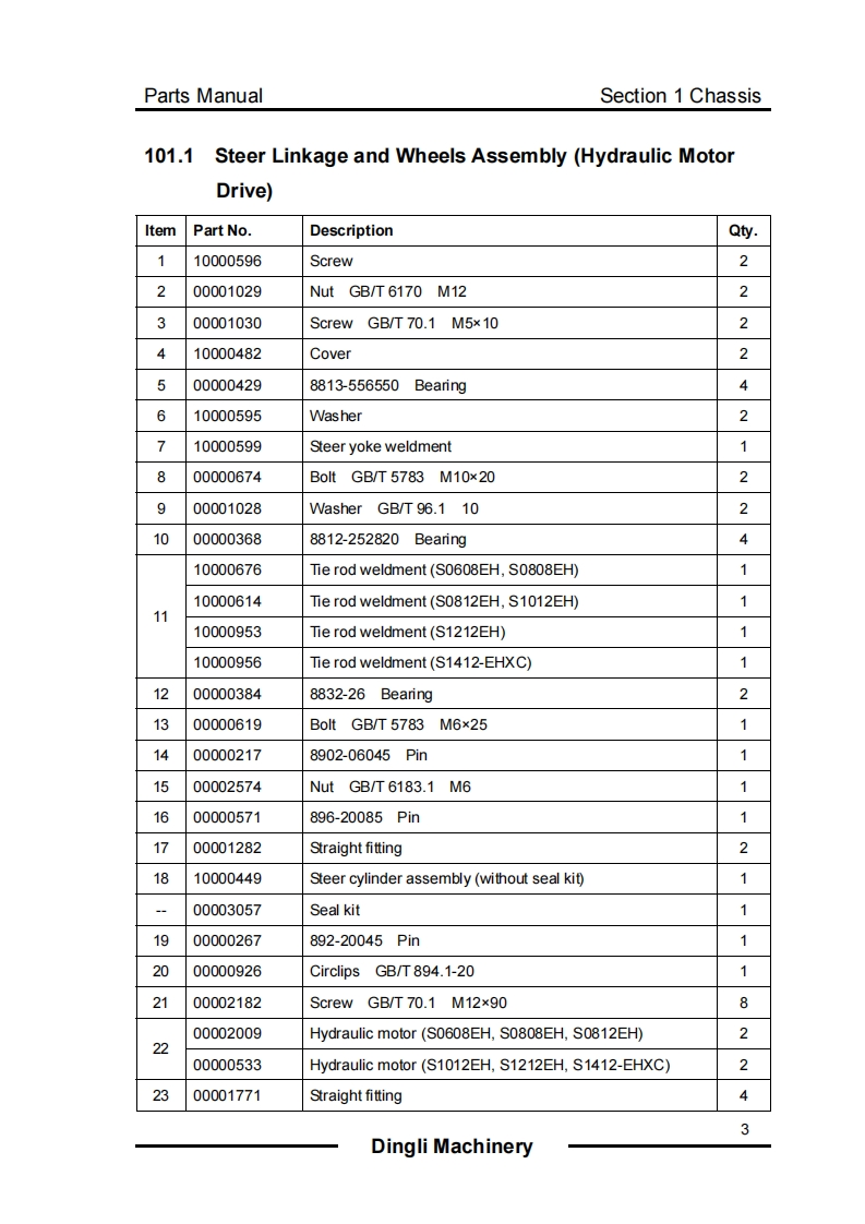 SELF-PROPELLED SCISSOR LIFTSPARTS MANUALFor S0608EH/S0808EH/S0812EH/S1012EH/S1212EH/S1412-EHXCForS0608E/S0808E/S0812E/S1012E/S1212E/S1412-EXCHydraulic Motor Drive Electric Motor Drive个四WARNINGTHE MANUFACTURER SHALL NOT BE HELD LIABLE IN CASE OF FAULTSOR ACCIDENTS DUE TO NEGLIGENCE,INCAPACITY,INSTALLATION BYUNQUALIFIED TECHNICIANS AND IMPROPER USE OF THE MACHINEDO NOT OPERATE THIS MACHINE UNTIL YOU READ AND UNDERSTANDALL THE DANGERS,WARNINGS AND CAUTIONS IN THIS MANUALPart Number:SM0117217A Rev2.0Zhejiang Dingli Machinery Co.,Ltd.Second Edition,October 2018 Printing