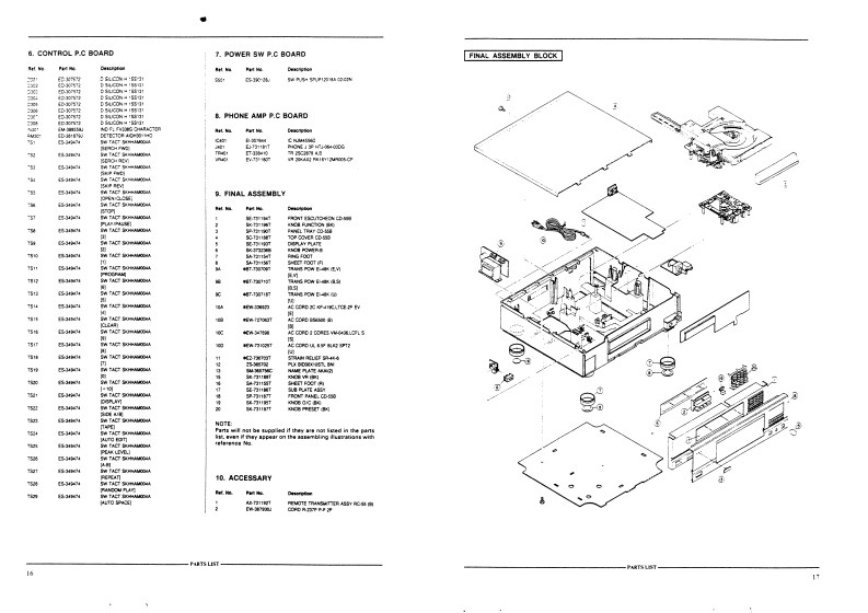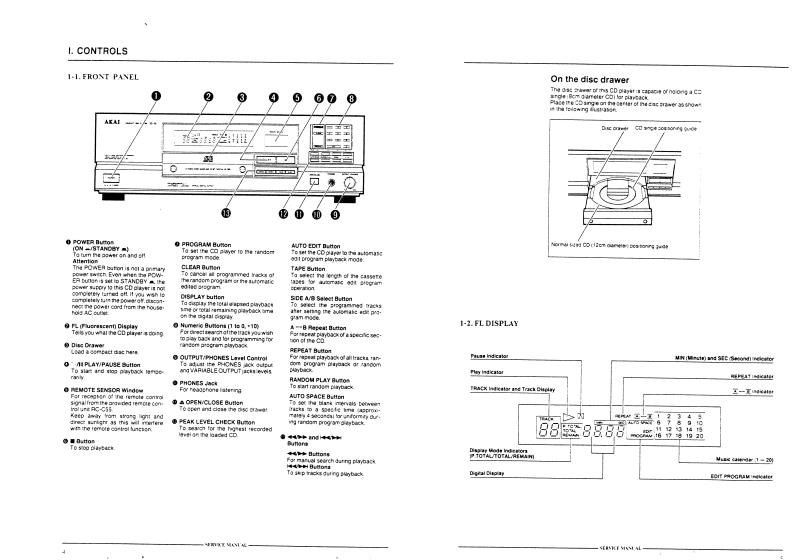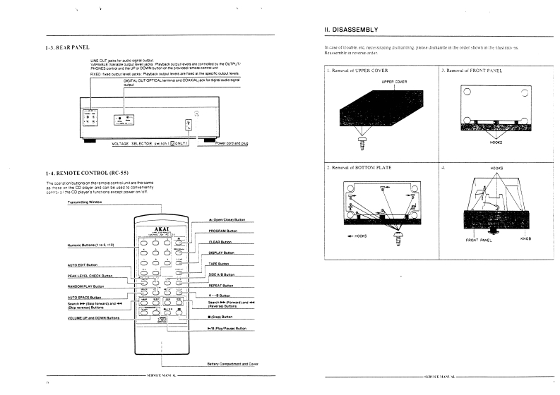 AKAI SERVICE MANUALAKAI就888兰润哑回d范COMPACT DISC PLAYERDIGITAL AUDIOMODELCD-55SPECIFICATIONSPick-up system3 beam laser pick-upSampling frequency44.1kHzDigital filter…18 bit,8 times over samplingD/A converter ..........16 bit linearError correction system.............Cross Interleave Reed SolomonNumber of channels2 channels stereoFrequency response4Hz1o20kHz±0.5dBDynamic range…96dBS/N ratio……108dBTotal harmonie distortion.0.0028%Wuw&flutt心r…Less than measurable limitsOutput levelAnalog output (line).2V(0B)Digital output (coaxial)...0.5V p-p/750ohms(optical…-22dBm,wave length 660nmleadphone outp.…70mW/32ohmsPower requirements...220V,50Hz for Europe except UK240V,50Hz for UK and Australia110V-120V/220V-240V,50Hz/60Hz convertiblefor other countries1)imsin5,425(W)×141(H)×343(D)mm(16.7×5.6×13.5 inches)Weight…4.2kg(7.91bs)Standard accessoriesConnection cord ...........................×1Remote control unitBatteries for the remote control unit .....X2Operator's manualFor improvement purposes,specifications and design are subject to change without notice.