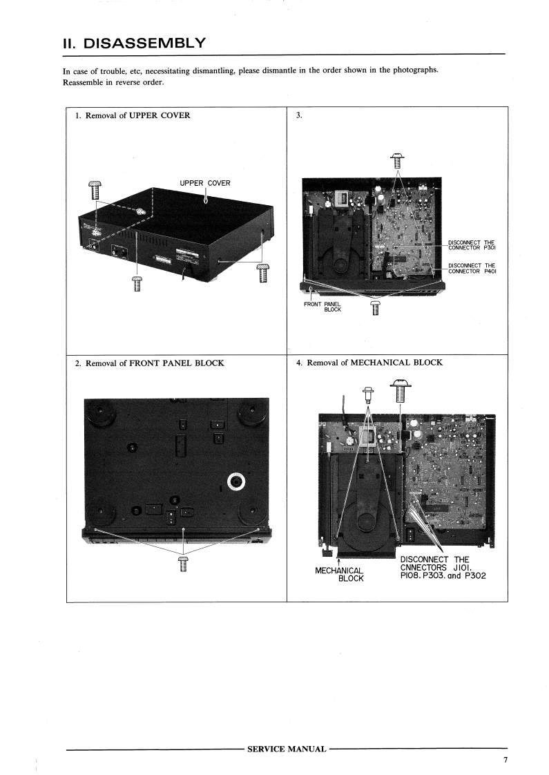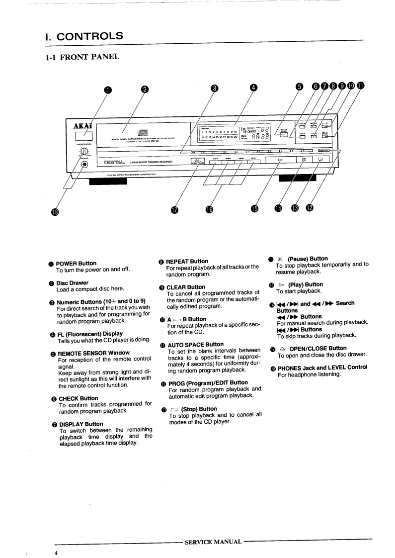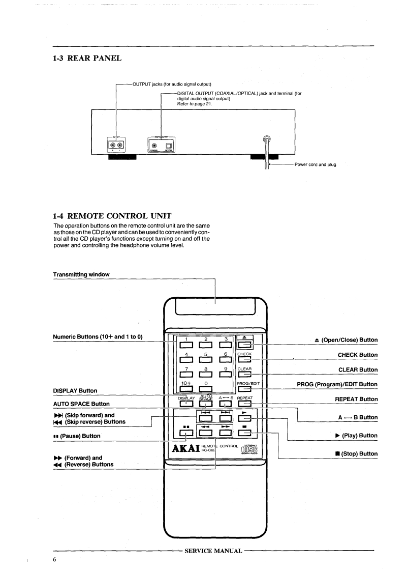 AKAISERUICE mAnUALAKAI晒1234567日906:“8811位口45吃7为停20总8888LACA-AOTOA MACAM ABOOWSMCOMPACT DISC PLAYERMODELCD-62discDIGITAL AUDIOSPECIFICATIONSPick-up3 beam Laser pick upStandard accessoriesPick-up system.......Linear trackingConnection cord.............Sampling frequency44.1 kHzRemote control unit RC-C62)IDigital filter.18 bit,8 times over samplingBatteries for remote control unit2D/A converter....18 bit linearOperator's manual ....Error correction system ....Cross Interleave Reed SolomonNumber of channels..........2 channels stereoFrequency response ...…4Hzto20kHz±0,5dBDynamic range-…96 dB or moreS/N104 dB or moreTotal harmonic distortion0.003%or lessWow flutter ......Less than measurable limitsOutput voltage/ImpedanceAnolog...2V (0 dB)Digital(Coaxial)u…0.5 Vp-p/75 ohmsDigital (Optical).-22 dBm,wave length 660 nmHeadphone output level/Impedance.28 mW/32 ohmsPower requirements…120 V,60 Hz for USA Canada220 V,50 Hz for Europe except UK240 V,50 Hz for UK AustraliaDimensions425(w)×110(HDX330D)mmWeight5 kg (11 Ibs)For improvement purposes,specifications and design are subject to change without notice