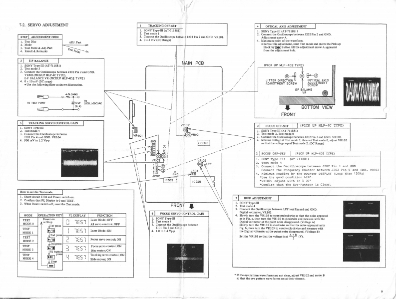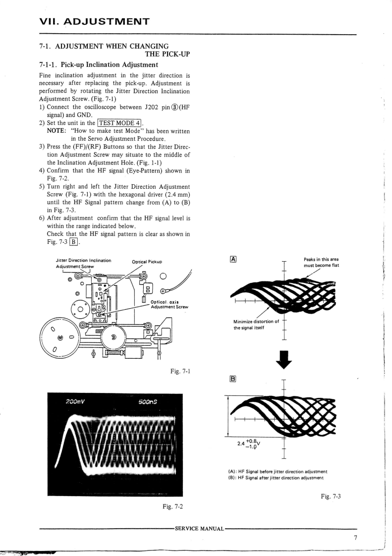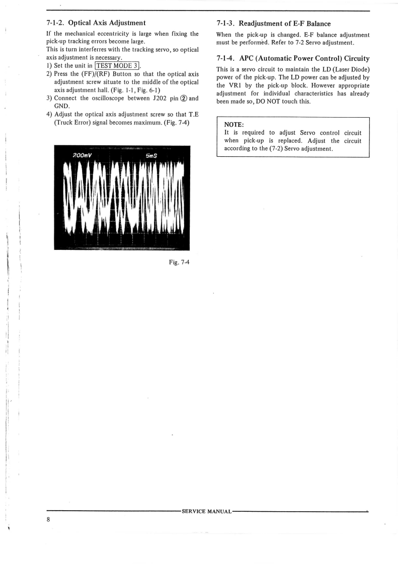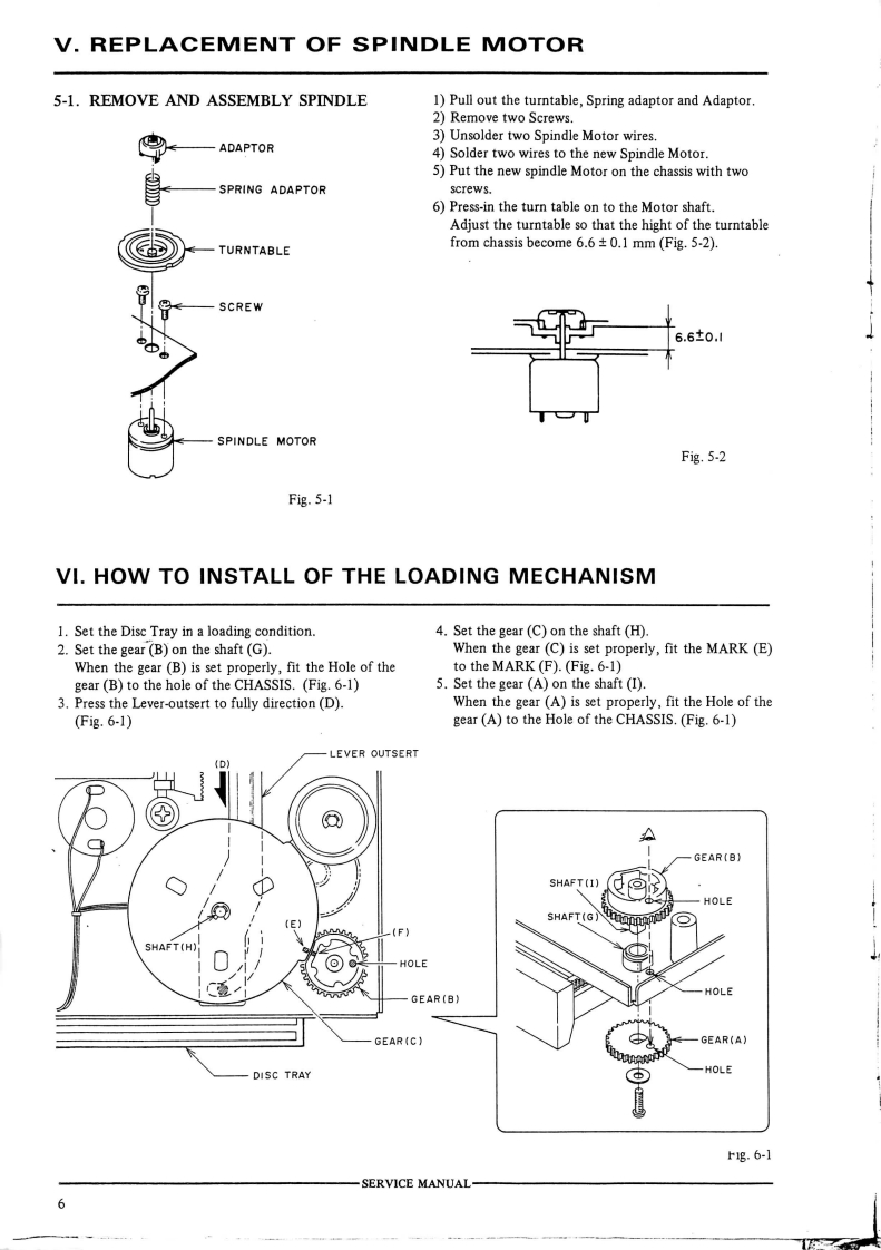 3-2.REPLACEMENT OF THE PICK UP3-3.REPLACEMENT OF THE SPINDLEBLOCKMOTORPRECAUTION BEFORE REMOVING THE PICK UP1)Turn the GEAR HOLDER LEVER counter-clockwiseBLOCK](Fig.3-4),then pull out the SLIDE GEARWhen disconnecting or connecting the connectors P12)Keep the PICK UP BLOCK away from the SPINDLEand P2.make sure that the P.C board (on the PICK UPMOTOR(↑direction as shown in Fig..3-5)】BLOCK)has been short circuited as shown in Fig.3-2.3)Remove the two SPINDLE MOTOR fixation screwsDo not turn the electricity "ON"while the P.C board isthrough the hole on the TURN TABLE (Fig.3-5),thenshort circuited.remove the SPINDLE MOTOR.4)Reassemble in reverse order.LOADING MOTORSLIDE GEARShort by soldert©SLIDE MOTOR⊙VIEW FROMBOTTOM SIDEFig.3-2Fig.3-41)Disconnect the connectors P1 and P2 on the PICK UPBLOCK.PICK-UP BLOCK2)Push the part of the pick up block SLIDE SHAFTeand pull it in the arrowed direction to remove the PICKVIEW FROMUP BLOCK.UPPER SIDE3)Reassemble in reverse order.0SCREWA RUSLIDE SHAFTSCREWTURN TABLECONNECTORSFig.3-53-4.REPLACEMENT OF THE LOADINGMOTOR1)Remove the LOADING BELT,then remove the LOAD-ING MOTOR while releasing the C hooks(Fig.3-4).2)To reassemble,push in the LOADING MOTOR and re-place the LOADING BELT.B3-5.REPLACEMENT OF THE SLIDE MOTORPICK UPBLOCK1)Turn the SLIDE MOTOR HOLD LEVER (Fig.3-4)clockwise,then pull out the SLIDE MOTOR.TURN TABLE2)Reassemble in reverse order.Fig.3-3SERVICE MANUAL