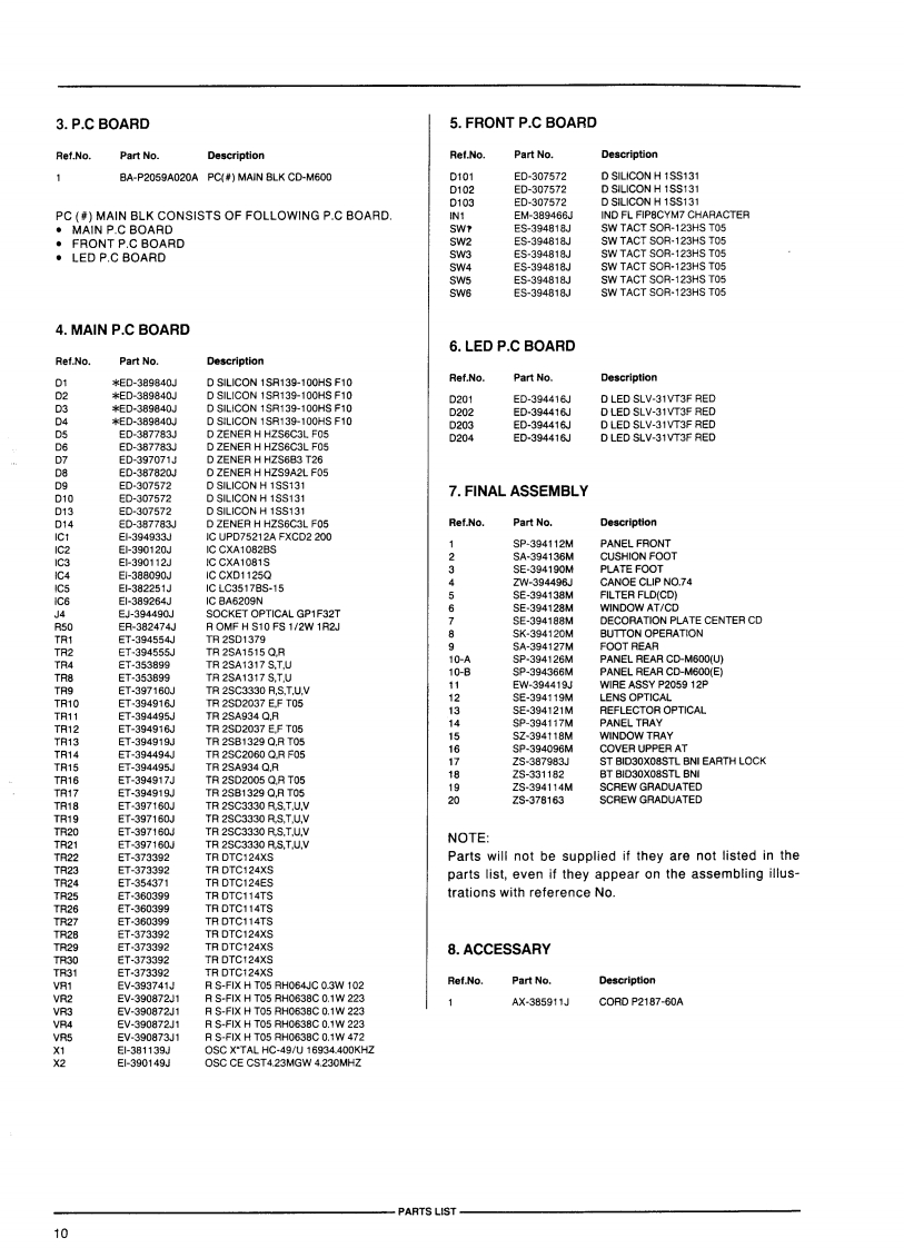 CD·NDnAKAI SERVICE MAnUALAKAI Co-Mco哑锐Pomr。m工巨口酒对行d泻0COMPACTDIGI TAL AUDIOCOMPACT DISC PLAYERMODELCD-M600SPECIFICATIONSPickUp......................................3 beam laser pick upError correction system......................Cross interleave reed solomonNumber of channels ........................2 channel stereoWow flutter ............................Less than measurable limitsOptical output level ....................22 dBm /660 nmPower requirements.........................Supplied from amplifier (model AM-M600 AM-M800)Dimensions..............360(W×95(H)×295(D)mmWeight......................................3.5kgStandard accessoriesOptical cable..........................x1For improvement purposes,specifications and design are subject to change without notice.