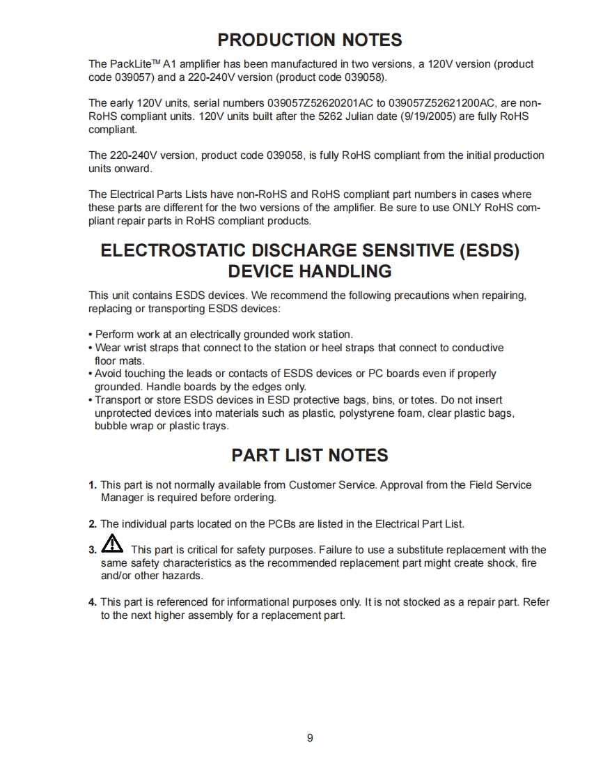 CONTENTSSafety Information...2Warranty..…2Product Description.....3Carton Contents ......3Amplifier Rear Panel Connections and ControlsTop Panel Indicators.......................4Setting Up a Single A1 Amplifier ................5Using Multiple A1 Amplifiers..........6Using the A1 in other applications.......7Setting up the A1 for use with other systems:..7Specifications...........8Production Notes............9Electrostatic Discharge Sensitive(ESDS)Device Handling..9Part List Notes............9Packaging Part List,PackLiteTM A1 Amplifier Assembly (see Figure 1).10Figure 1.PackLite A1 Amplifier Assembly Packaging View......10Main Part List,PackLite A1 Amplifier Assembly (see Figure 2)11Figure 2.PackLite A1 Amplifier Exploded View ........1Electrical Part Lists..............13-29Power Supply Amplifier PCB Assembly13-22Input Limiter PCB Assembly .........23-28Signal LED PCB Assembly ............29Power Fault LED PCB Assembly.29Disassembly Procedures .........30-33Test Procedures ............33-34Figure 3.Amplifier/SMPS PCB(Non-RoHS)Topside Etch Layout......35Figure 4.Amplifier/SMPS PCB(Non-RoHS)Internal Etch Layer 1 Layout35Figure 5.Amplifier/SMPS PCB(Non-RoHS)Internal Etch Layer 2 Layout36Figure 6.Amplifier/SMPS PCB (Non-RoHS)Bottom Etch Layout.............................36Figure 7.Amplifier/SMPS PCB(RoHS)Topside Etch Layout.............37Figure 8.Amplifier/SMPS PCB(RoHS)Internal Etch Layer 1 Layout37Figure 9.Amplifier/SMPS PCB(RoHS)Internal Etch Layer 2 Layout38Figure 10.Amplifier/SMPS PCB (RoHS)Bottom Etch Layout............38Figure 11.Input/Limiter PCB(Non-RoHS)Top Side Etch Layout...39Figure 12.Input/Limiter PCB(Non-RoHS)Bottom Side Etch Layout39Figure 13.Input/Limiter PCB(RoHS)Top Side Etch Layout ....40Figure 14.Input/Limiter PCB(RoHS)Bottom Side Etch Layout..40Figure 15.Power/Fault LED PCB Etch Layout..........41Figure 16.Signal/Overload LED PCB Etch Layout.41Test Cable Wiring Diagrams................41Troubleshooting .................…42Theory of Operation,PackLite Model A1 Amplifier43-50Integrated Circuit Diagrams ........51-53Service Manual Revision History.541