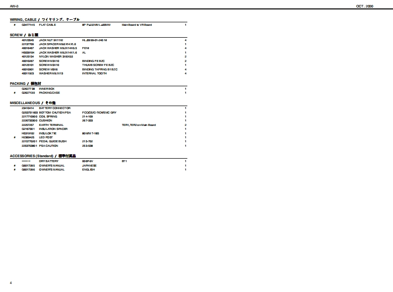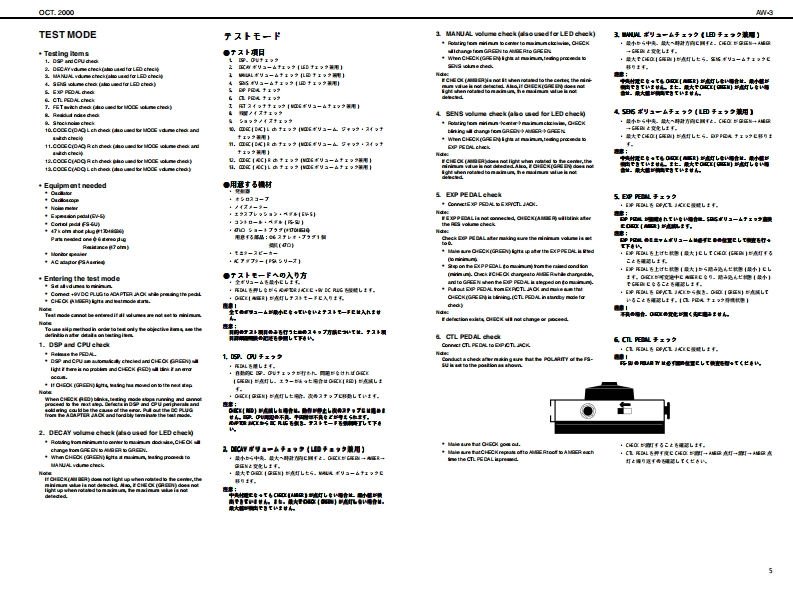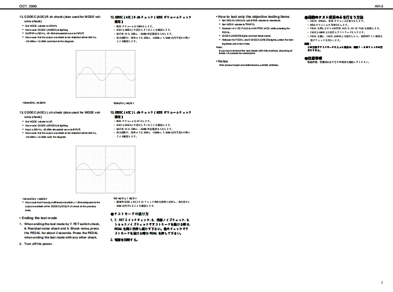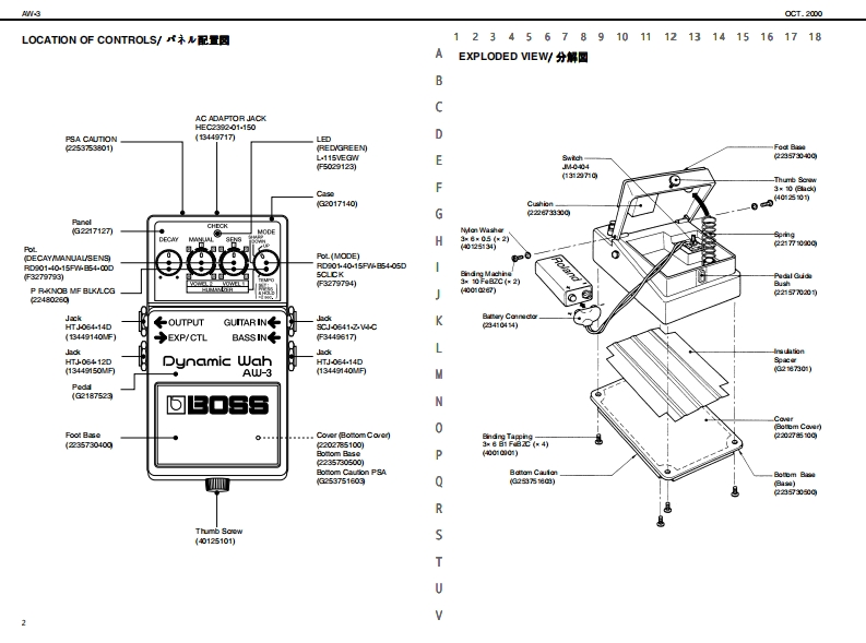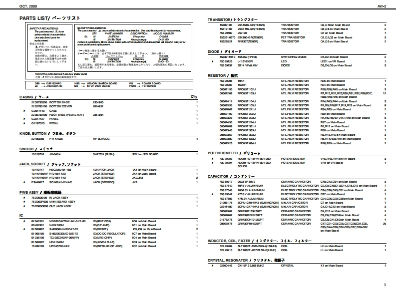 AW-30cT.2000SPECIFICATIONSB▣SS主套仕檬AW-3SERVICE NOTES.AW-3:Dynamic Wah●那3:十老y2+7·ominl lmput Level年A关情州地视觉入力业电善●付黑品First Edition-酒血烟数情Dynamic WahIssued by RJAngkh(G4ota每收:(0无富刮Irput lmpedanot●入力《>比-掌入1NohnMominal Output Levd叫a10我者当一多(家一““规定出力北心毒黄老W多正好择0-渔血TABLE OF CONTENTS目次Page·0 pu lmpedance●出功有之比一之入10SPECRICATIONS主察仕模1kom推提典青》心-之2条为能港6得视儿主可。LOCATION OF CONTROLS末配置回2,le commended Lod100以上宽品EXPLODEDVIEWN分解回一KT7多一1头01PARTSLBT_,一y少又10kdmor gmater3我面天,e sido MoiseSp超销uRd山dB-量血If46那11977?53)·A7TEST MODE.T又卜毛一Fd■W-S坐Ou (HF-ATp006gP4●了之上回一★2314243于11-CIRCUIT BOARD CPUJLEDMAIN)基板回(CPU LED.M周0,ce-hehvs时州路·24?于一·9471区室民-型CIRCUIT DIAGRAM CPULEDMAINL回路回(CPU LED.WMd山过C宁主+1票视1花毫路19N1911C写CY由SBSO 10血:0那图90担1在a6242于QaE在h●有之9行一一美F5音b世-●挑境增子C四k1M7年?968w9甲?9OLTRUTOUTPUTJao址了丁单一·g甲?夕Cd年金r区k酒,ewgS+DC WE工●K数着191-正每香N1每择OUTPUTGUITAR IN专数着19《框秀VEXP/CTLBASS INDry batteey(Vtpe1T泰吉91V时C了家丁多一◆酒我视建Dynamic Wah,Ce0wSO M IDC W)AU3画积港甲件秀重味毒仓1能电壮记上a【青命可1417》了3着前1计树回E口88了务市着为时同州形寸捷011:S1f1:S51商本通范的x8强码x锰04m量面导装港言化】420 g nsor (induding Batsee)Copyright 2000 ROLAND CORPORATION本害初一里、6儿《以金都笼量西老植军·规箱有各己之是解重t。Roland17059053Prmed in Japan A000 (CM)