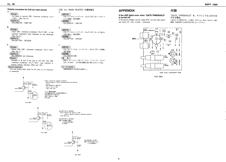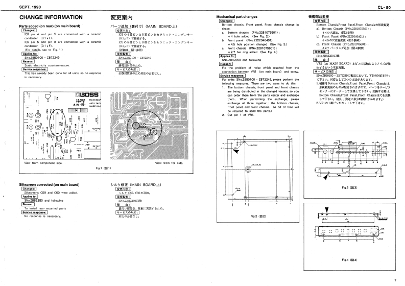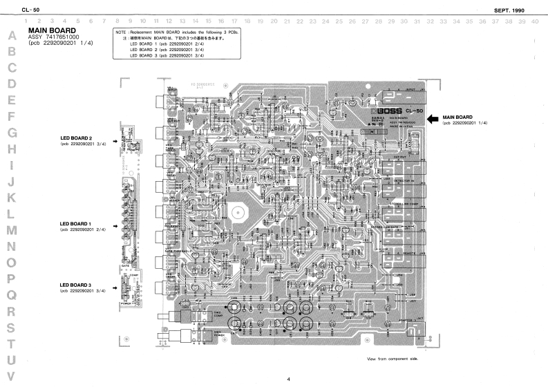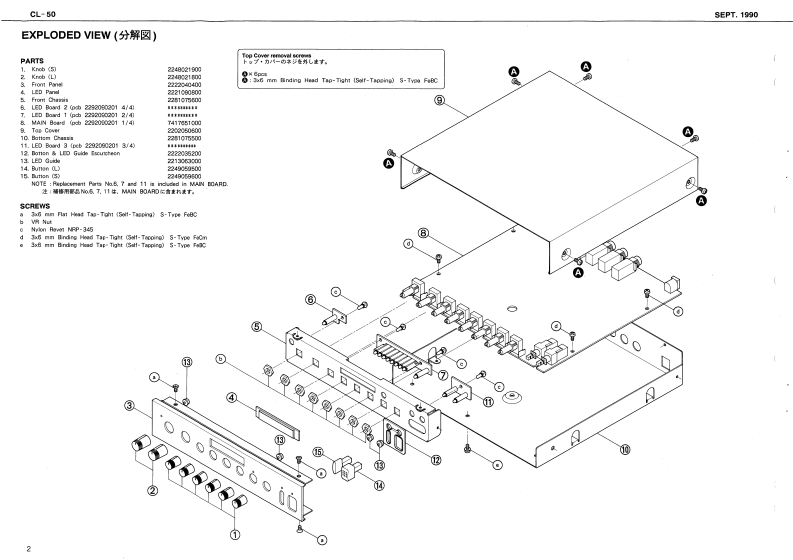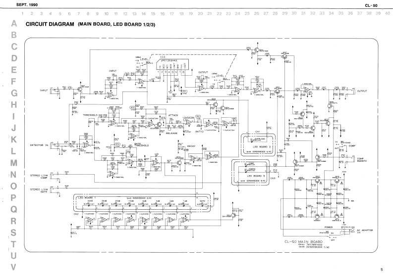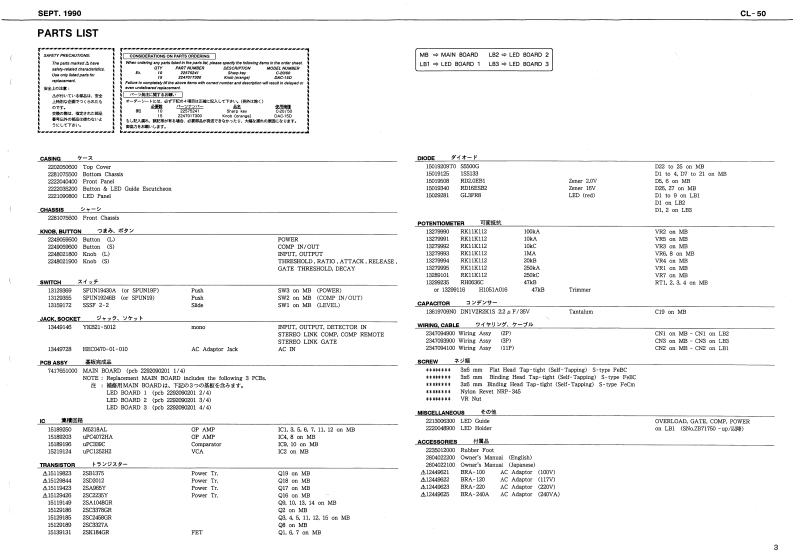 SEPT.1990CL-50⑤EB▣SSCL-50SERVICE NOTES囹SPECIFICATIONS/仕樣COMPRESSORFirst Edition10dDn/+4nLIMITER与+4n1日/10TABLE OF CONTENTS目次=k-.Pageeal lroedanca/A办fyE-gya}:。SPECIFICATIONSEXPLODED VIEWPARTS LISTMAIN BOARDMAIN BOARD0LED BOARD 1/2/3LEDB0ARD1/2/31111111111114Tb时L/吴业,5集%P·◆五CIRCUIT DIAGRAM回路图(MAIN BOARD,LED BOARD 1/2/3)(MAIN BOARD.LED BOARD 1/2/3).....5ADJUSTMENTCHANGE INFORMATION更案内………………………………780×1-4%9-5/180c4APPENDIX付辑If the LED lights even when"GATEH1244621GATE THRESHOLD在,才7ELT台LED1442THRESHOLD"is tumed oM有订吞場合……………………8Owwor's [)0wa2291200a4LED Gude2213363080mPct.PstPatPat.GL InodlFK11K1122604AFK11K112100K11K11210AF球11K11278t0G22493595000(10292811(132705[13278982(1☑T9991)13油7101S辆tch (AuhlK由L】n3告上52n5b5)Knd边I892248321830122402190002248021900224902190(1312☒60Pat味Jak《特o0LED PanlK11K1121M码K15K1121M4a21-501222210205000C122T98391322闪C13449146》5555Knos 18)H性分T0-1-010Too CaeaC224802190022450219000C13449720220206030CL5oMP5aMTtCL-50Front Purel20端0g5-Bomom Charaia02277040400K11K112100tAPK11K11220827490000302220107530555F2-7(137T99网01327904se作IPahBton LED Ouide Eacutcheen(1315172scbL山Kndb [5)222015700》C22400210000224802192013128g5》RolandPrinted in Japan BD-2 (DP)