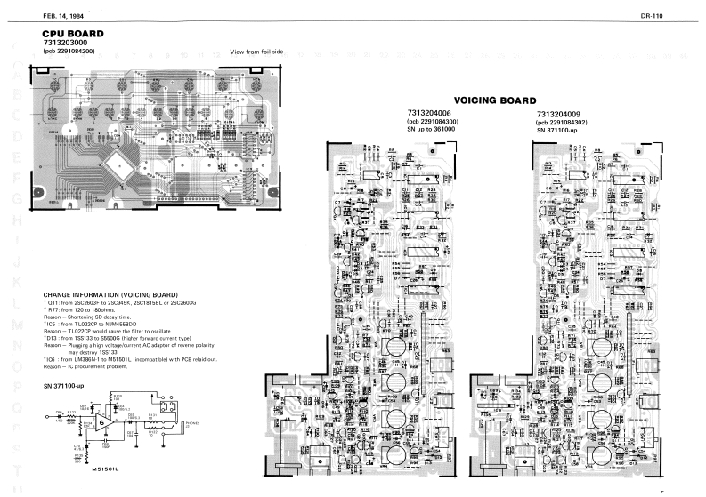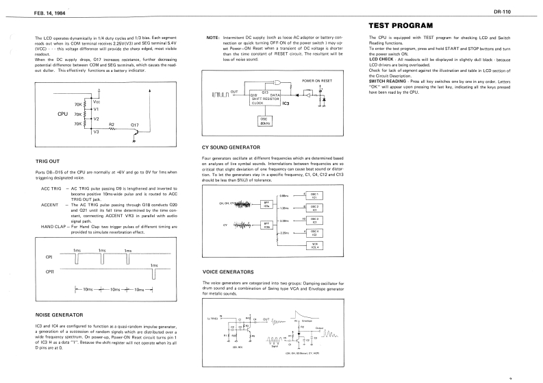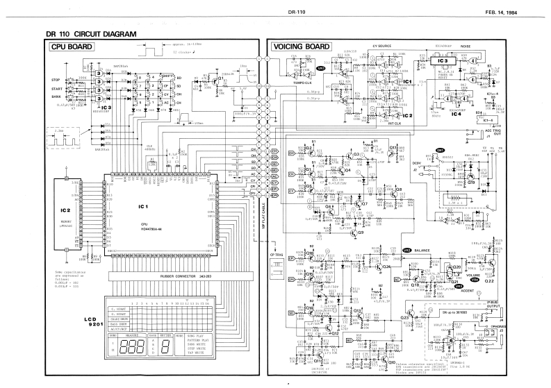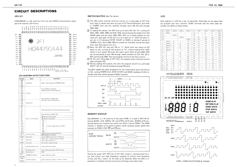 FEB.14.1984DR-110回E▣GSDR-110SERVICE NOTESDISASSEMBLYFirst EditionExposing PCBsSPECIFICATIONS1.Itemrave 4 ratiry knabo.2smae3关t2 m P type se6 en Bott0n0线.PowrVDC (attery ar AC adiplorl生Open Tap o然,irst at the rear ead①,gently push n6trwk0aeOurrent DrawmA lat no si0切12maa》Wlckl then open at the front end.Ingert a cleth betwemn garelsHeadphone ipedance 812 1000to protect the reor surface of toe panel from soratching Thisalloes10KR (IN/DUTIur0bb情000g0 r boch PC刷hie maintaining the unit oparativeVOICIPS BOARDACC THIG OUT Sigsal +6V.10ms-eidthemun中tsk100倒nerao=n110g100x300Hmn7-42s4-616D1i-3/180H性海htDismounting VOICING BoardLc0201Switch S5S522P1.K12iL02Z0g1M松2.Unlatching Batsry elm reise Bomom case.41509411011012鲜113279715的Ds4nWnd的wC0mQePo1K121L0四30KBC22020650012247029900411322716的LCD ASSEMBLYleck HEC04001.230Display Window Coesr (nLackl-413449706Pot K121L0Z03-50KA11a77971力Aepid unnecessory senioe to LOD Aay12290G09物t精remienbling.作he知re that the faoen例rerl of Rear Palaruer上k心面霜souches LCD.11344401)The correct makes disply drk when the LD and palarinr areplaced crosswise.白▣5BDR110Dr.Rhythm GRAPHICC18m222013G00REAR POLARIZER (12029820)UBBER CONNECTOR [134302371Lc0a01150294111RUBBER SWITCH SHEET (12479715L-Bottom Caoe一841eyC0hw22010g00220203640回1HLJ052001-110413449127-Tep Case122010628080c支H松NE号H8J92401-040All Rotary Knobs 2472001113442411)T0PCAE2910628000RolandPrinted in Japan.BE-2