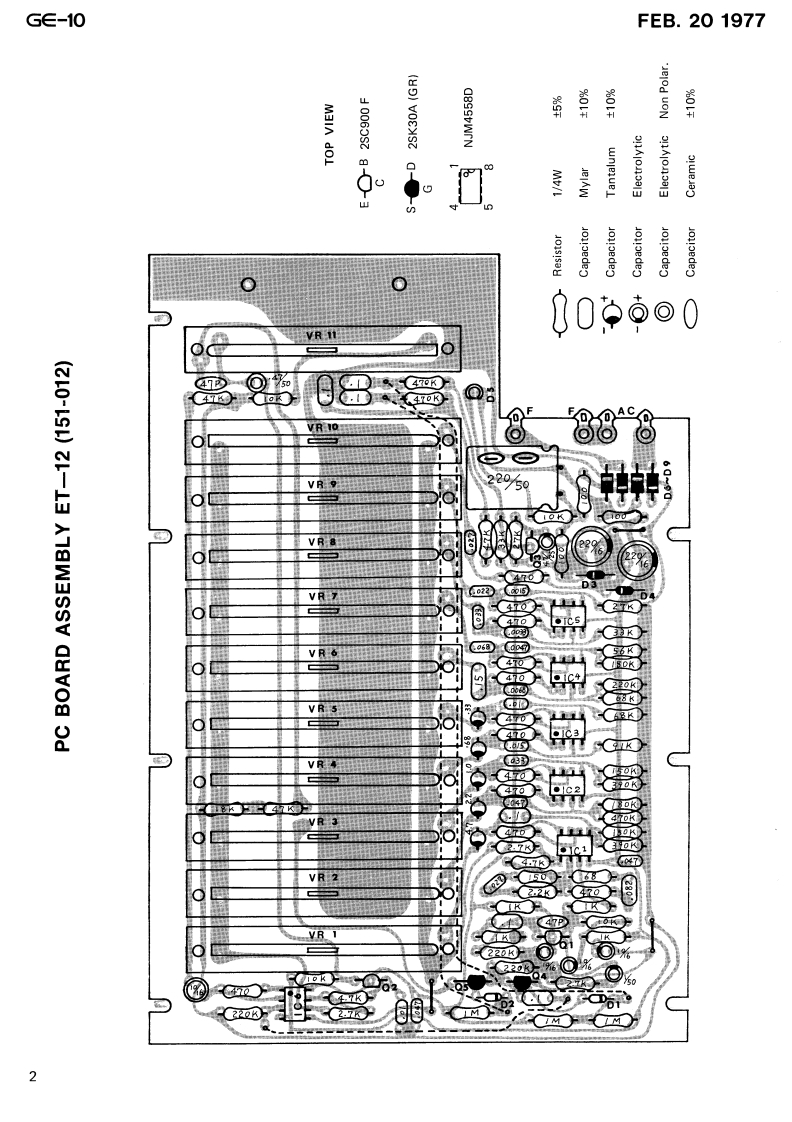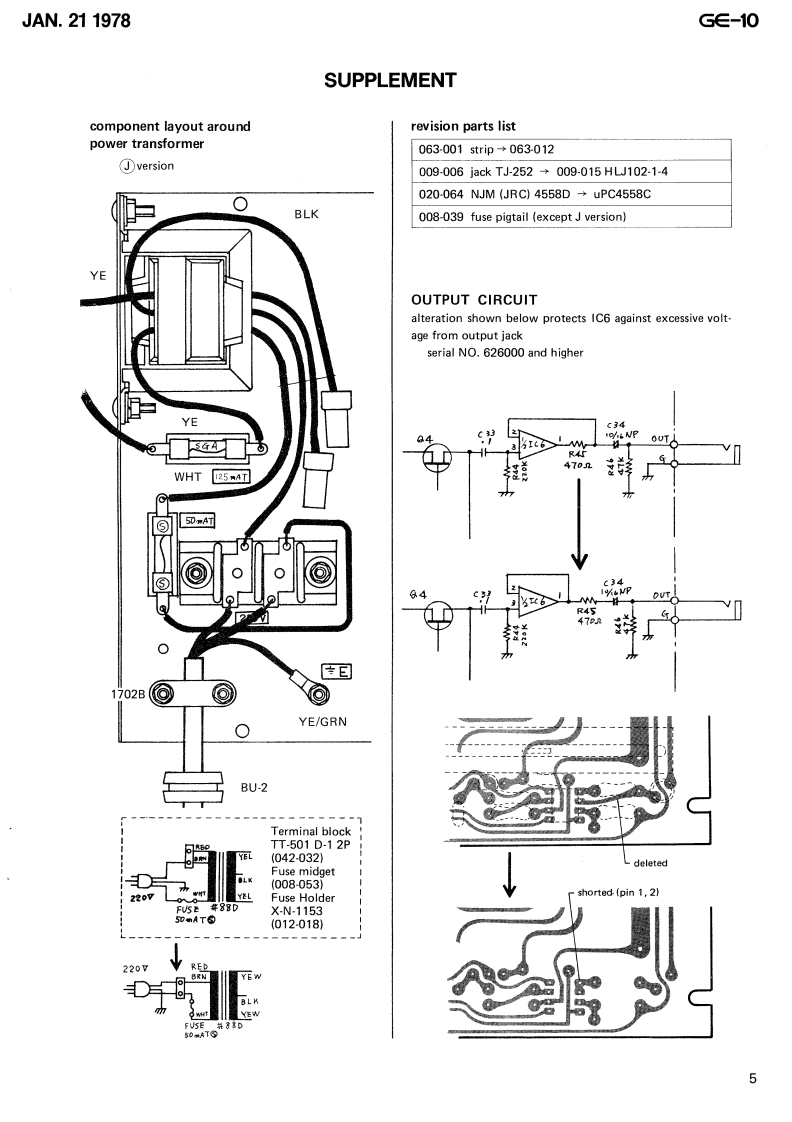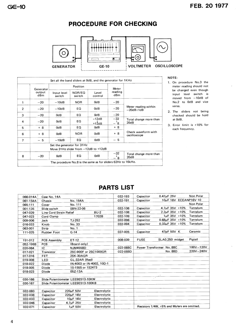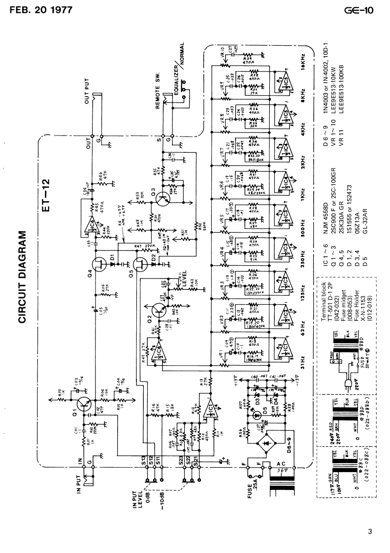 FEB.201977G∈-10⑤E▣SSG∈-1 SERVICE NOTESSPECIFICATIONSEqualizer:10 elements,±12dBGain:UNITY 131Hz,62Hz,125Hz,S/N ratio:Over 100dB250Hz,500Hz,1KHz,Jack:Input,,,,.。·12KHz,4KHZ,8KHz,Output.,,,,···116KHzRemote control ....1(Slider potentiometerInput impedance:220K2with center click)Output impedance:More than 6002Control:Level control±12dBMaximum output level:+15dBm(Slider potentiometerPower consumption:3Wwith center click)Dimensions:220(width)x155(depth)Switch:Normal/Equalizerx78(height)mmswitchWeight:1.9KgIndicator:Power pilot lampCASE NO.14A(066-014A)COVER No.111(065-111)KNOB NO.33between case and(016-033Pot.STRIP(063-001)SLIDE POTENTIOSLIDE POTEN-METERTIOMETERLEE9E513-10KWLEE9E513-100KB030-166)030-167)Graphic∈qualizerLED GL-32AR(RED)(019-008)OU CER四3口G写SLIDE SWITCHSBN-22-06G€-10LINE CORD STRAIN(001-135)RELIEF BU-2 (047-029)JACKTJ-252(009-006)●CLAMP1702B(047-023)Screw3x6 BPHFUSE SLA0.250(008-039)RUBBER FOOTPOWER TRANSFORMER NO.88C or DG-14(111-025)(022-088CorD)1