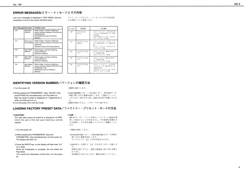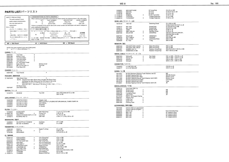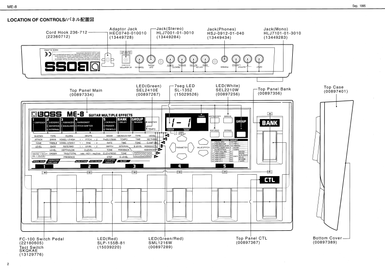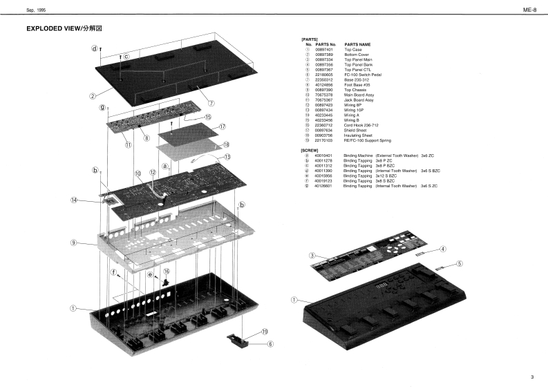 Sp,1935ME-8SPECIFICATIONS/仕檬⑤E▣SSME-8&SERVICE NOTESE40A黄LTPLE ERPECT指GUITAR MULTIPLEFirst EditionEFFECTSBRC-840TABLE OF CONTENTS目次Page0塘0-0i智N以0GKC%GAM11=19:ブ口y夕圆…1LOCATON OF OONTROLS................./儿配习1…2EXPLODED0EW4a:分解习1111111111711n11n3PARTS LIST……T3TM00E---.分XkE-54…5-8E月A0月ESSAGE11111111,工7一,y包一岁…-9DENTIFYING VERSION NUMBER11111,i一艺g才/i一)臧第方法……--9ESTC列NG THE FACTORY PRE8ETS·7T夕k)一·ブ)电y卜D胜定为法-9JIACK B0AHDA53Y-……·CKB0%RDAsg..............…10.11MAN0ARDA3SY,……………………MAIN B0 ARD ASSY…12,13234567891011121314BLOCK DIAGRAM/ブ▣Y夕☒BDTUME-E时1女了,u力BANKFELTEF00号G副H21RCS阳IEsKE TCHKLRoland17059019Prntod in Jopan [AF0R1