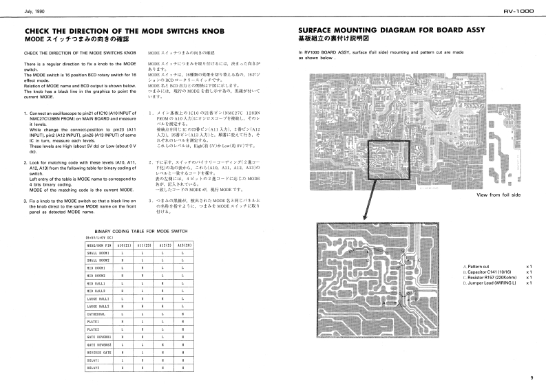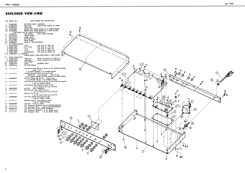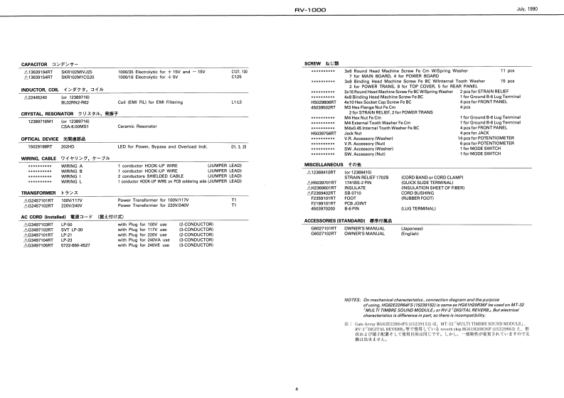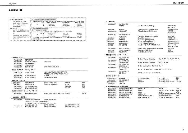y,1g0RV-1000▣E▣SSRV-1000SERVICE NOTESDIGITAL REVERBFirst EditionSPECIFICATIONSTABLE OF CONTENTS目次PageEXPLODED VIEW分解四PARTS LIST-以9又下34BLOCK DIAGRAMブ▣y7¥1P7与4BOARD ASSY基板姐立区6livnl l bvid髻8hbde-CRCUIT DIAGRAM格为7Mure Bae TtilNADJUSTMENT瞬空仕棒CHECK THE DIRECTIONM0D呢天y于D家及D向赤2w因OF THE MODE SWITCHS KNOBSURFACE MOUNTING DIAGRAM基板相立砂奥付中明☒面的FOR BOARD ASSY围等eML家5uO3w”2洲”是1GENERAL VIEWRV-1000)摄银☒RK163111R926-AW 100KB4F3229190HT1与k件cr小a的HL4388013010SwichF3449101TDRK16312AR4-AW 10KB X 2SRRS1G057AJuck Nut0等2为1118T门(13119818H03876RDPotRK18312AR439-AW 50KB X 2RK163111R781-AW 10KBF3229109RTd4F3229110T10ButlonButorLEDKnobBUTTON相成E队UTTON USac202H0KNOB (GraylUTTON (Bla幻1224想5212249752111G2477101HT1224776500SwitchSPUN19K607.AWSPUN19K603-AWSDDLA1 TV-3(F3128302T1F3123301月T1113129144RolandPrinted in Japan (A-2边IClCap,NG解c4 D cOaPRAT